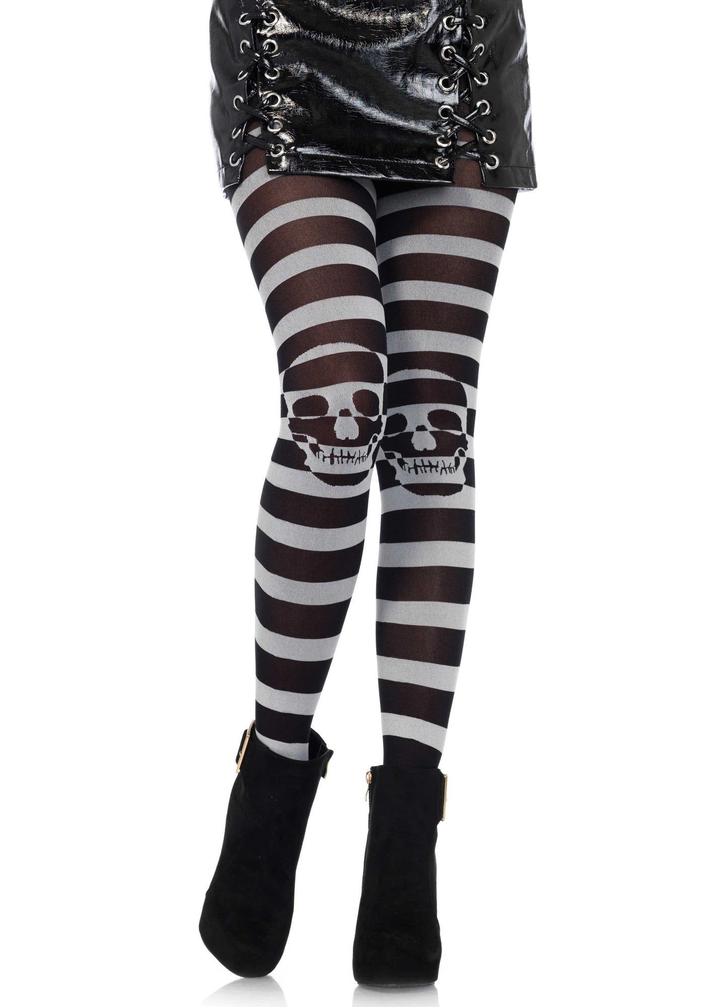 Tyto dámské punčocháče mají černobílé pruhy a potisk lebky na kolenou. Jsou ideálním doplňkem vašeho pirátského kostýmu na karneval.