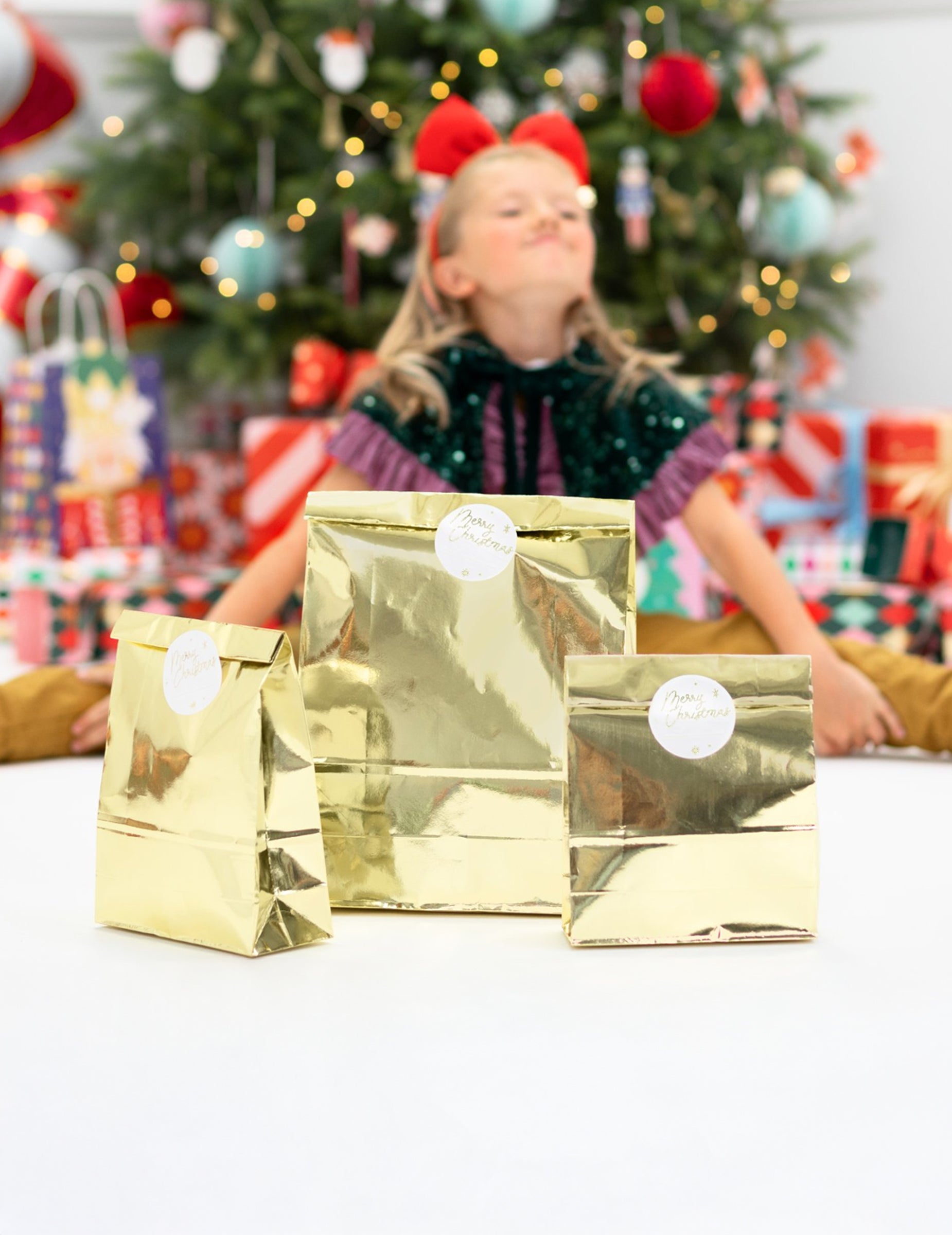 Tato šarže obsahuje 3 dárkové tašky je zlatý papír a měří přibližně 25 x 38 x 11 cm jednou rozložené.
