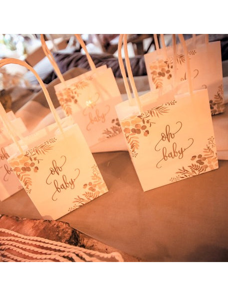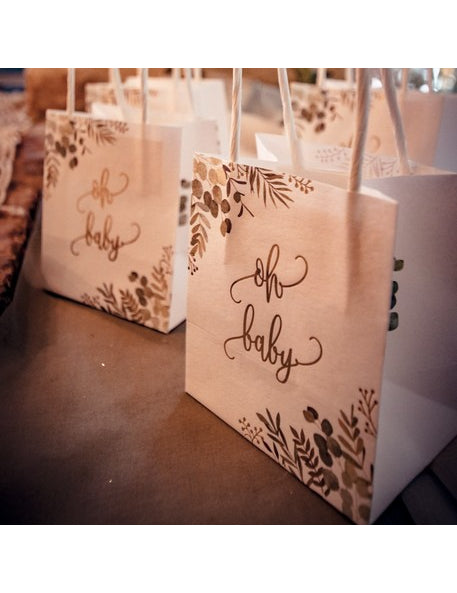 Tato sada 6 tašky na dobroty je ideální pro oslavu porodu s elegancí. Rozměry 10 x 18 x 5 cm, tyto bílé nádoby jsou zvýrazněny rostlinnými motivy a nápisem "oh baby" ve zlacení. Tyto jsou vybaveny velkými madly pro snadnou manipulaci sáčky perfektně uvítá vaše sladkosti nebo drobné dárky během a miminko tématické.