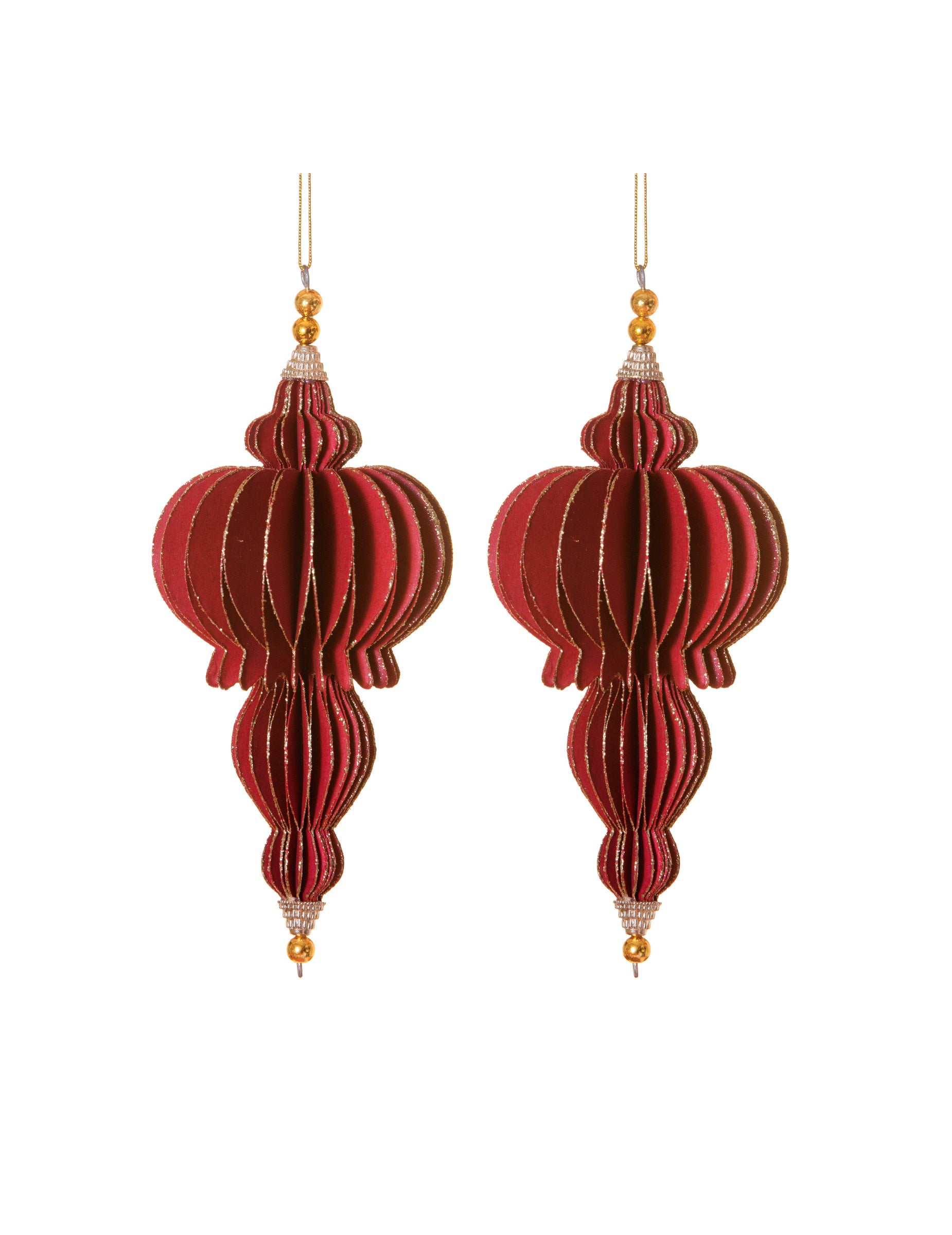 Tyto 2 závěsné dekorace měří přibližně 13 cm. Mají tvar origami a jsou červené se zlatými okraji. S těmito závěsnými ozdobami origami dodáte svému vánočnímu stromečku elegantní vzhled!