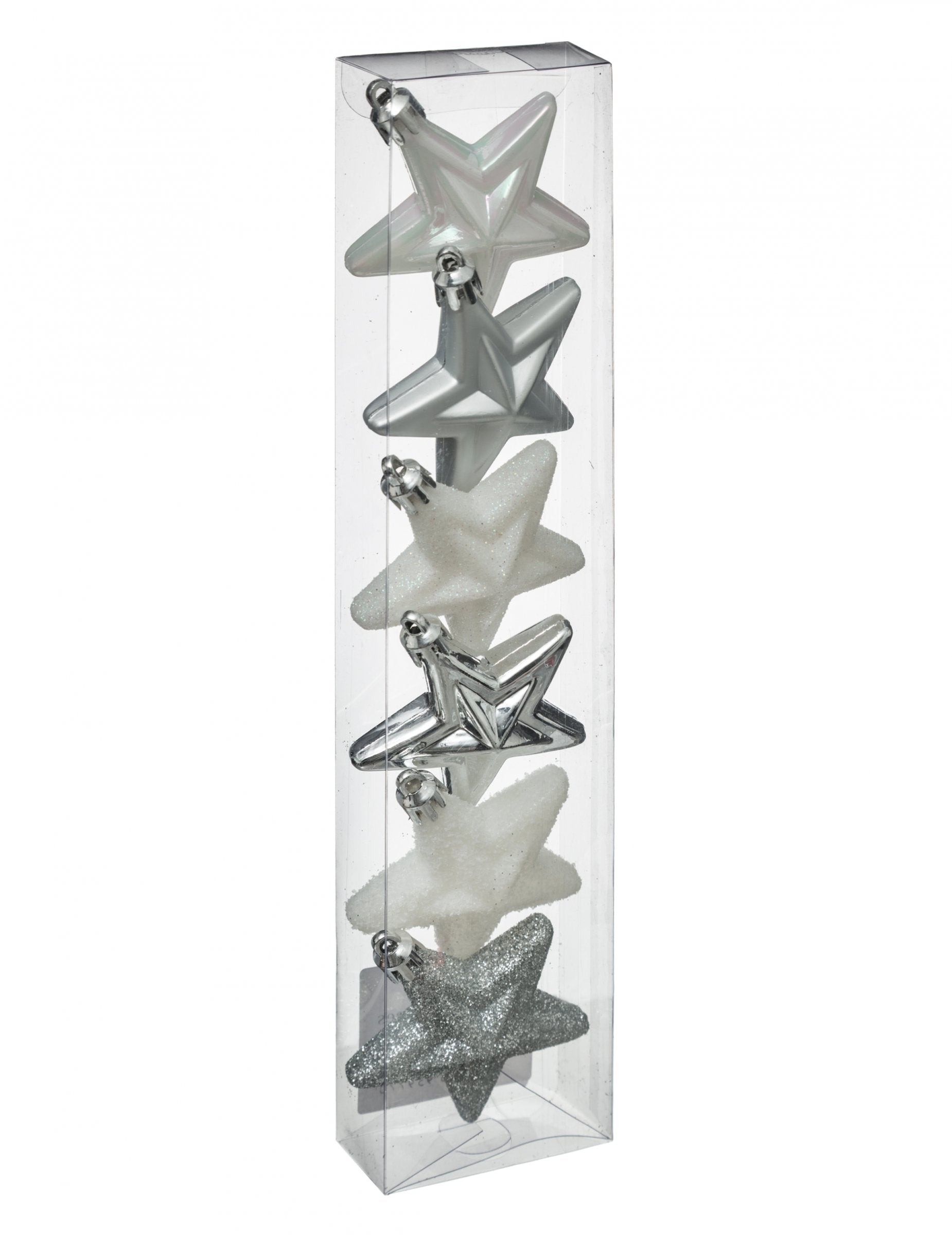 Ozdobte svůj interiér elegancí díky této sadě 6 ks zavěšení stromů ze 6 cm. Tyto ozdoby ve tvaru hvězdy jsou zdobeny bílou a stříbrnou barvou s matným, lesklým a třpytivým povrchem. Tyto hvězdné přívěsky promění vaši dekoraci a dodá jí polární vzhled Vánoční večírky.