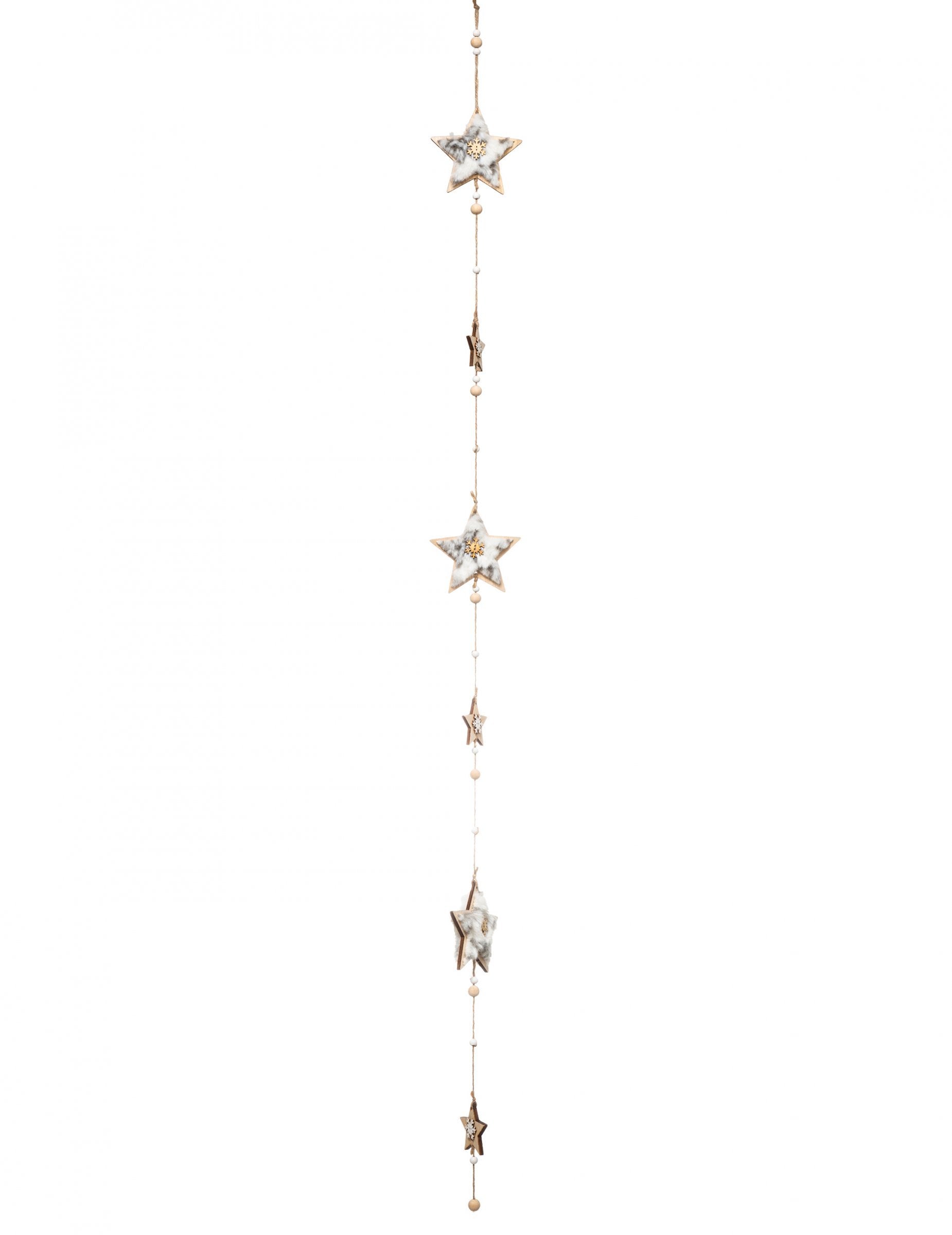 S délkou 150 cm, toto věnec dodá vašemu interiéru kouzlo. Je zdobena shvězdy vyrobeno z přírodního dřeva, zdobené měkkou umělou kožešinou a jemnými korálky. Ideální pro vytvoření a Vánoční dekorace v polárním stylu, tohle věnec hvězd ozdobí váš strom nebo stěny elegancí.