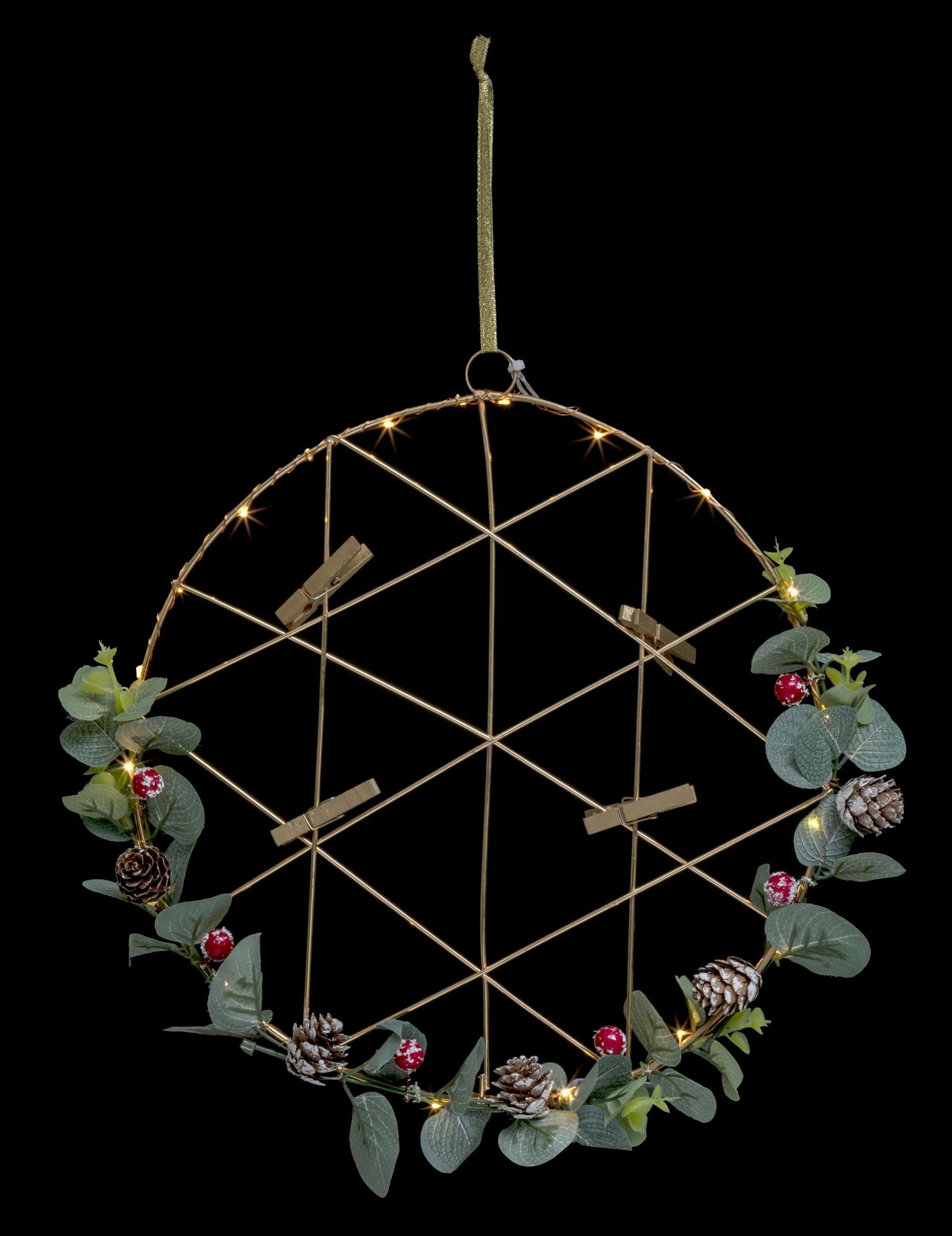 S průměrem 28 cm, toto věnec k zavěšení přináší do vašeho interiéru nádech magie. Tato originální podpora slouží jako změť díky svým 4 mini klipům navrženým pro vaše oblíbené záběry. Jeho design dovedně kombinuje listy eukalyptu, bobule a šišky pro přirozený vzhled. Obrys se rozsvítí 20 LED diodami napájenými 3 AA bateriemi (nejsou součástí balení). Ideální pro vylepšení vašeho oslavy konce roku, toto neuspořádaná koruna je nezbytným dekorativním doplňkem.