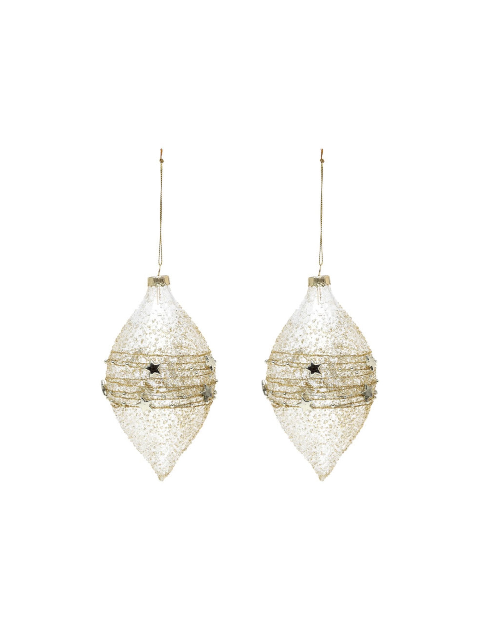 Vylepšete svůj strom touto sadou 2 kusů Vánoční koule ve skle o rozměru přibližně 15 cm. Vyznačují se elegantním kapkovým tvarem a jsou zdobeny zlatými vzory a malými třpytivými hvězdami. Tyto zlaté koule dodá vaší výzdobě magickou a rafinovanou notu Vánoce.