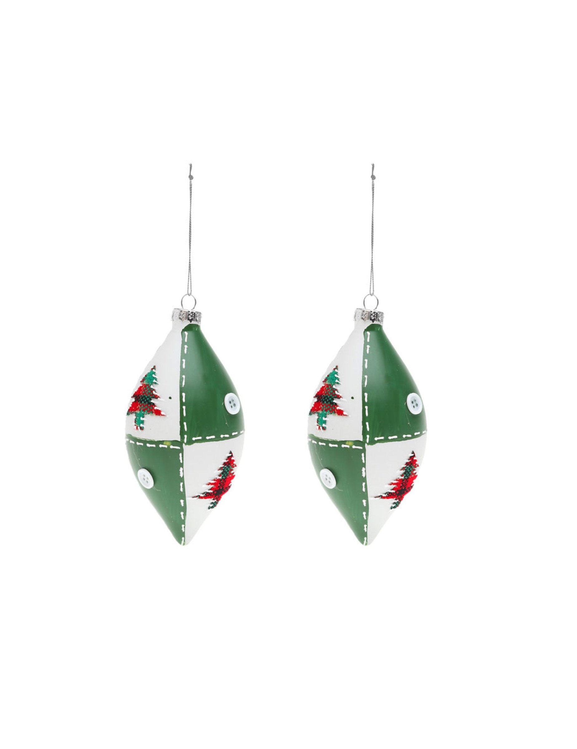 Tato šarže obsahuje 2 Vánoční koule sklo s elegantním tvarem kapky. Oblečené v bílo-zelené barvě je zdobí drobné knoflíky a jemné lesní motivy. Při jejich rozměrech 13 x 6,5 cm, tato originální závěsná svítidla vylepší váš ozdoba stromku tradiční pro Vánoce.
