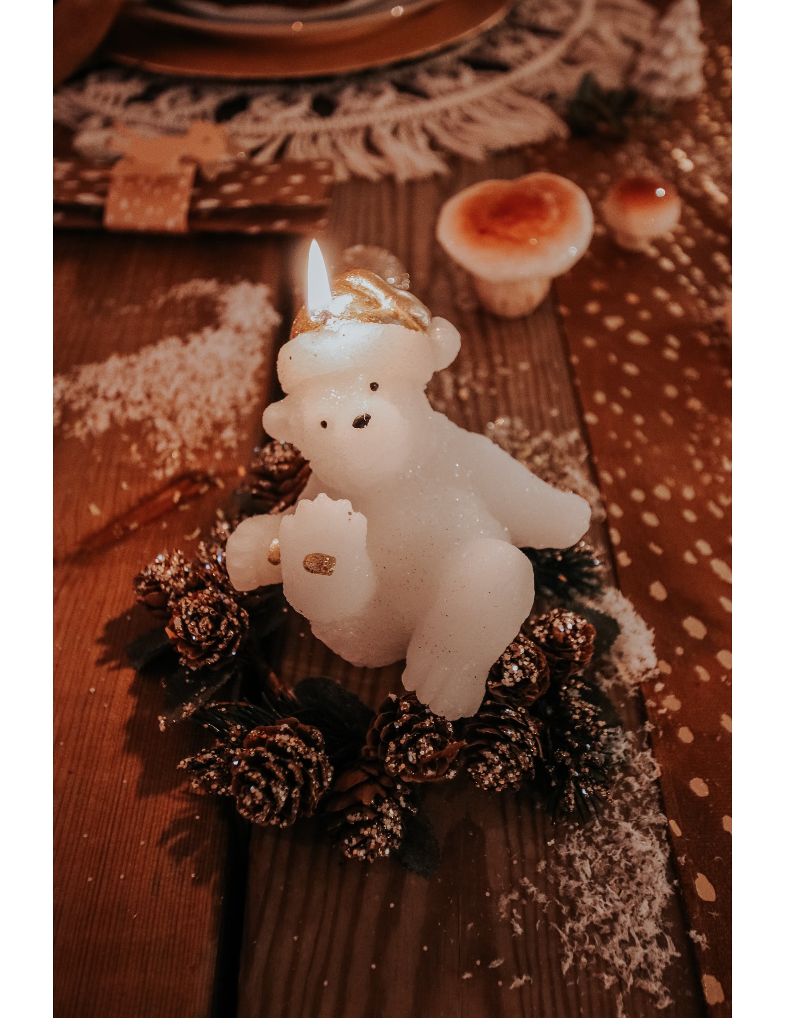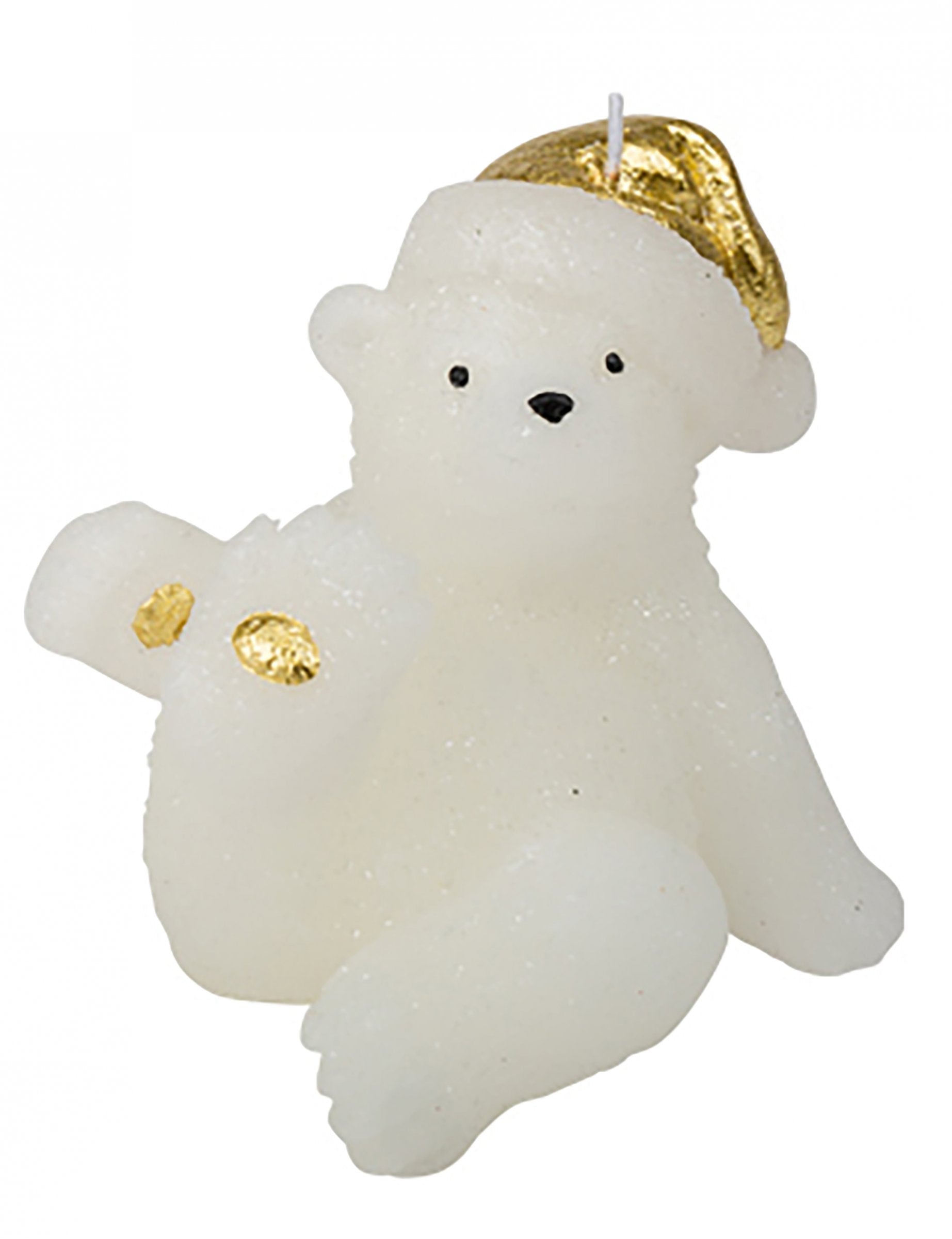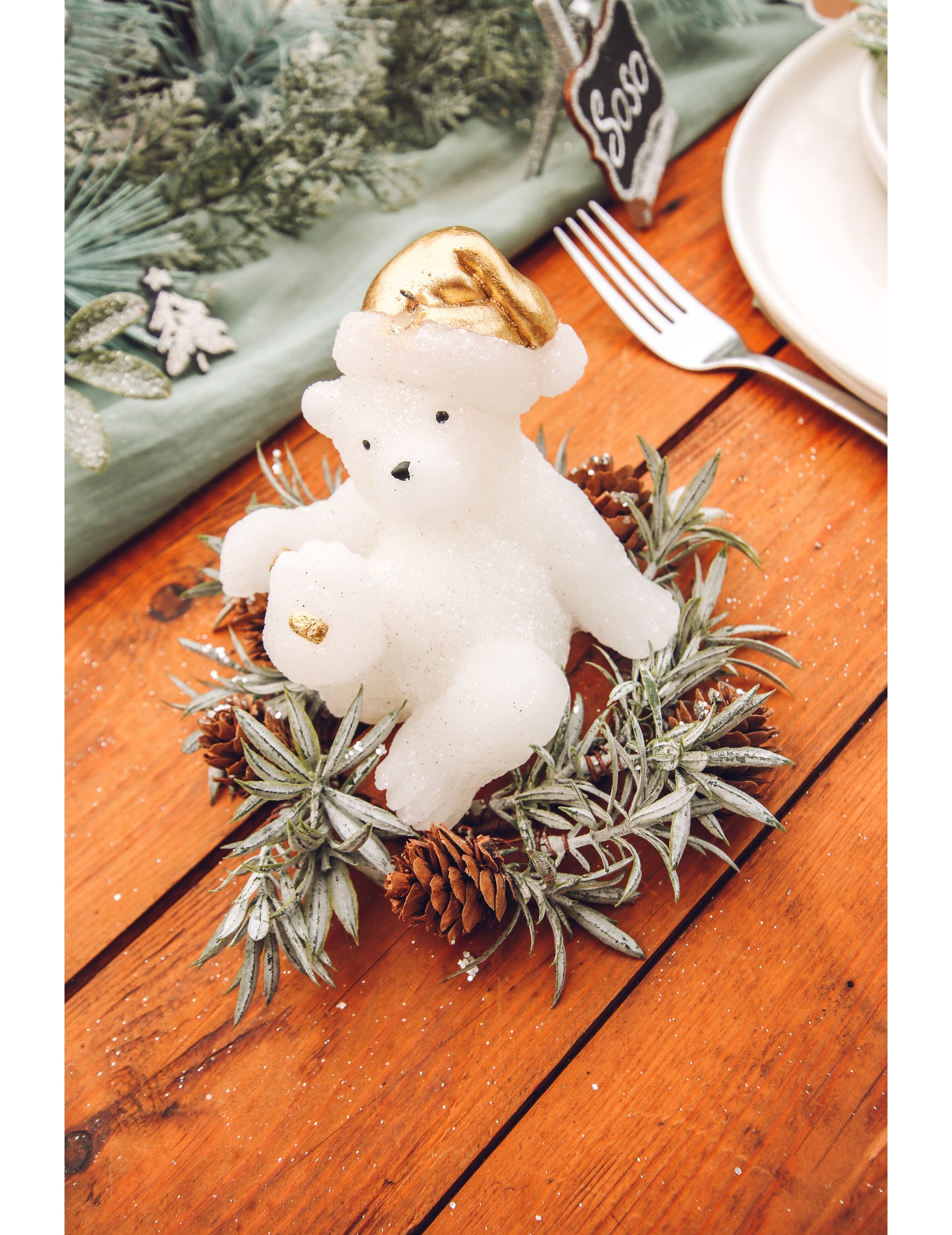S rozměry 10 x 9,5 cm, toto svíčka má podobu roztomilého drobečka medvídek bílé zdobené zlatou čepicí. Ideální pro osvětlení zimních večerů svíčka medvídka vytvoří na vašem jídelním stole jemnou a přátelskou atmosféru. Vánoce polární.