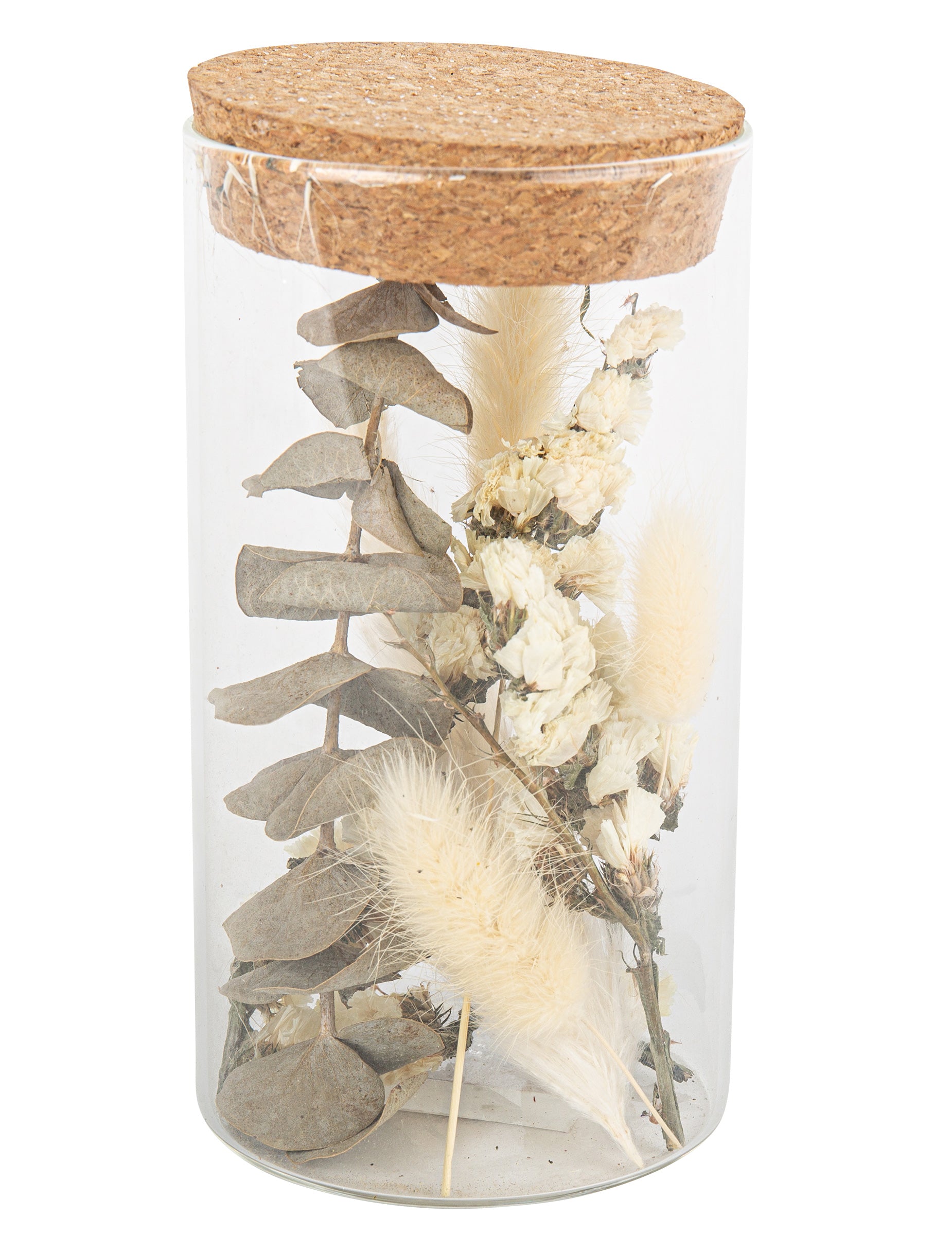 Skleněná dóza se sušenými květy 15.5 cm a bavlna
