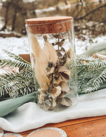 S výškou 15,5 cm pro průměr 8 cm, toto skleněná nádoba je rafinovaným dekorativním prvkem. Ozdobený skutečnými sušenými rostlinami, jako je eukalyptus, bavlníkové květy a malé peříčky, je uzavřen autentickou korkovou zátkou. Toto skleněná dekorace přinese přirozenou a poetickou notu do vašeho středu během a svatba nebo na prázdniny Vánoce.