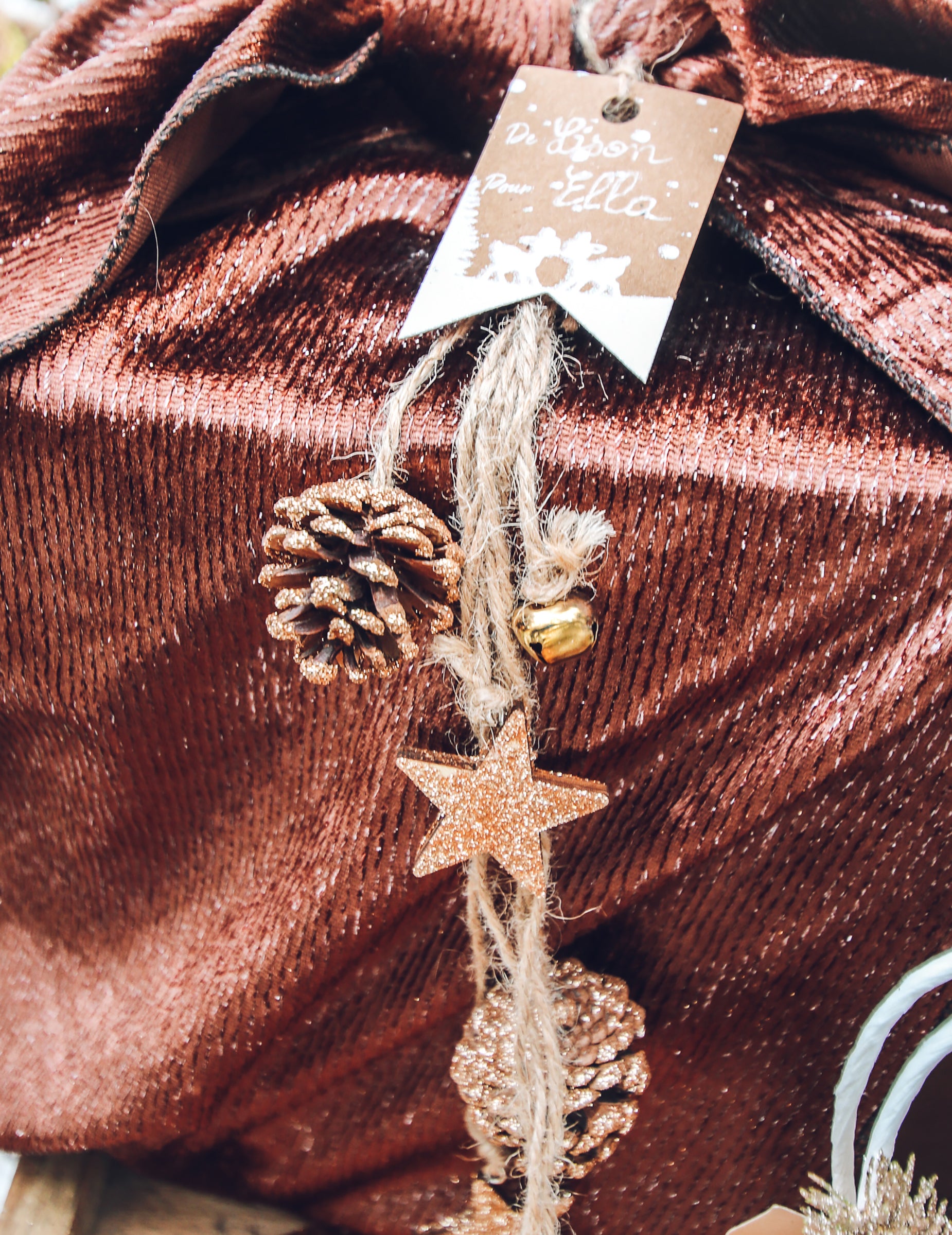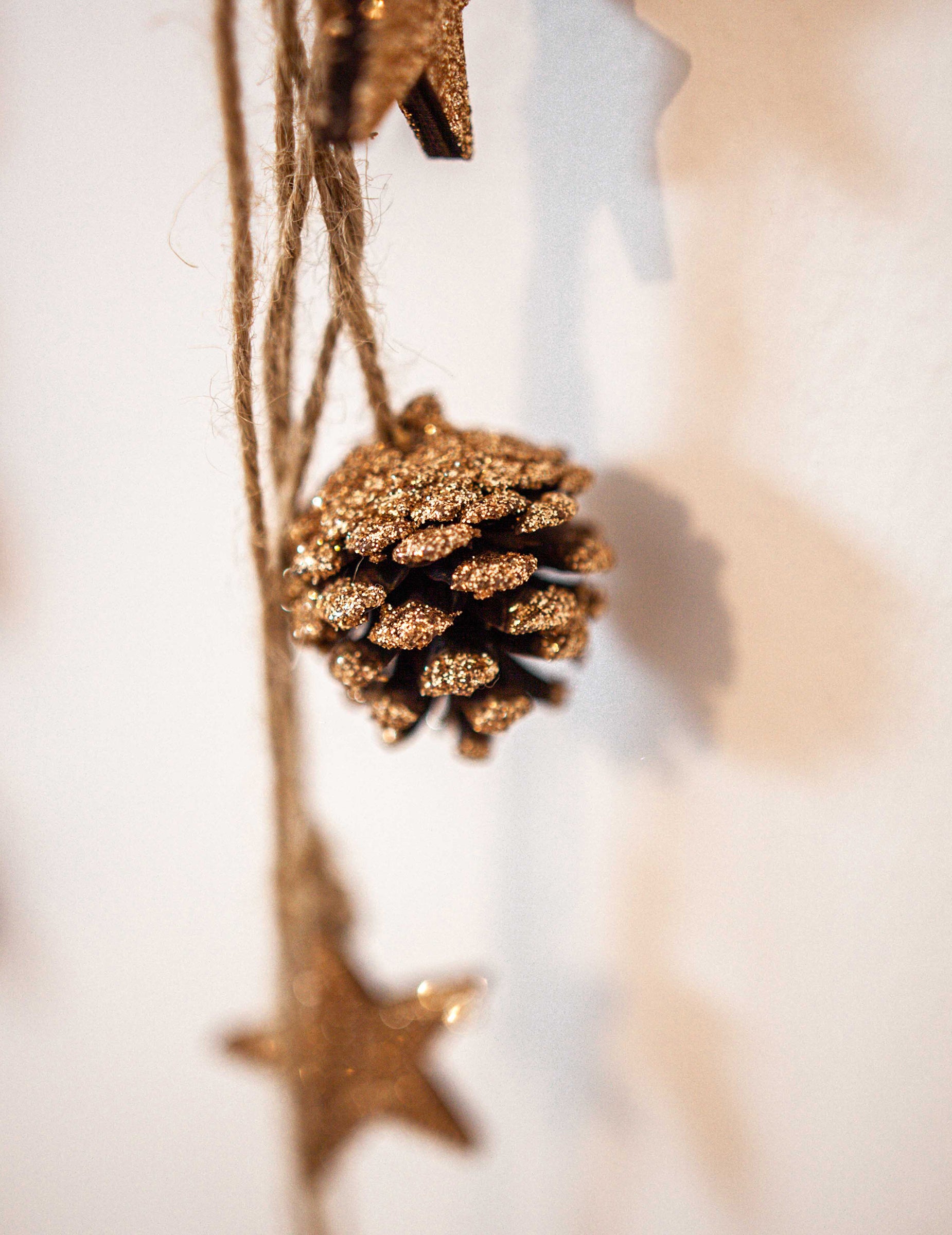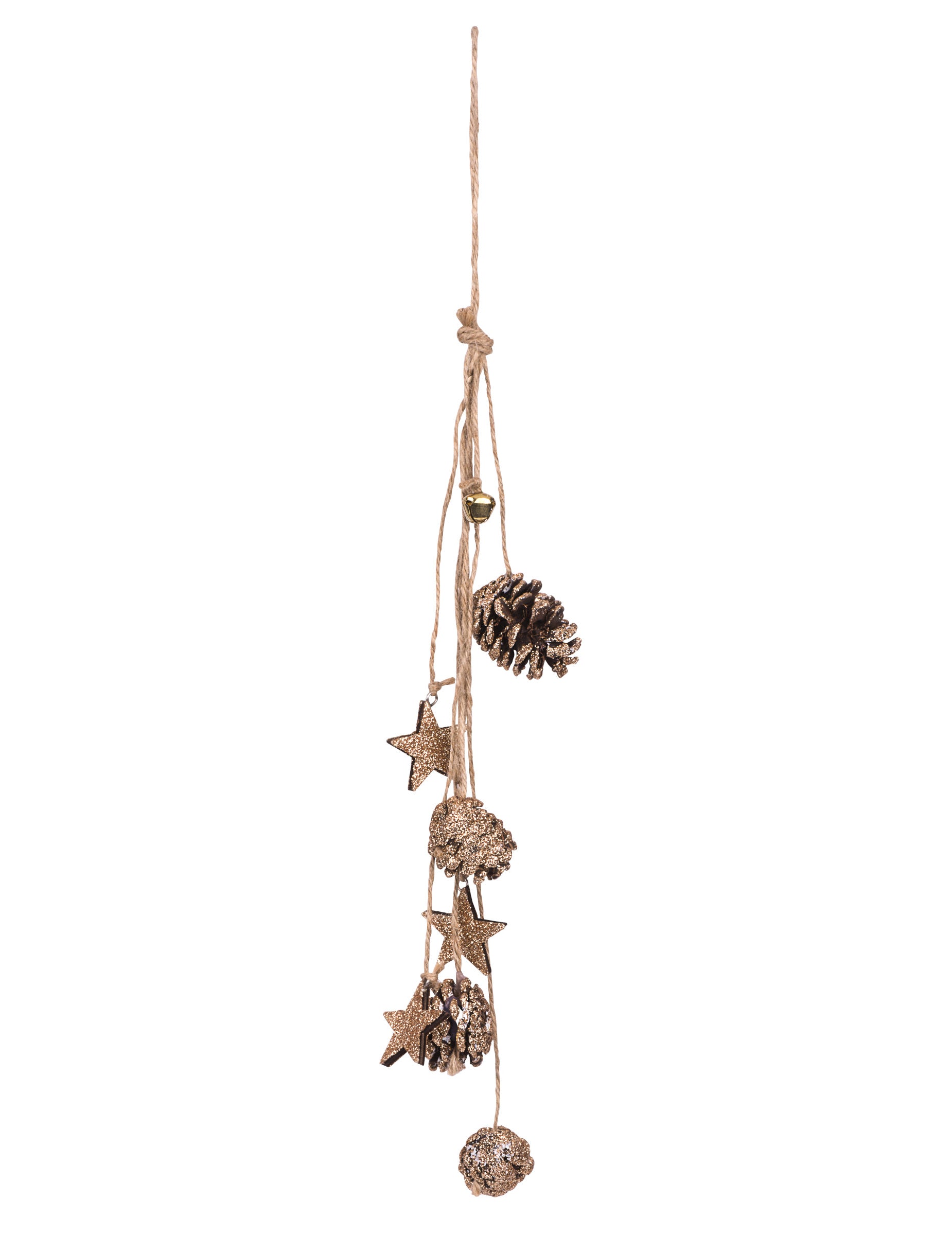 Vneste s tímto do svého interiéru lesní nádech pozastavení s délkou 50 cm. Skládá se z provázků, které drží přírodní šišky a malé dřevěné hvězdičky, doplněné třpytkami v barvě mědi. Toto příslušenství je ideální pro vytvoření a Vánoční dekorace autentické a slavnostní.