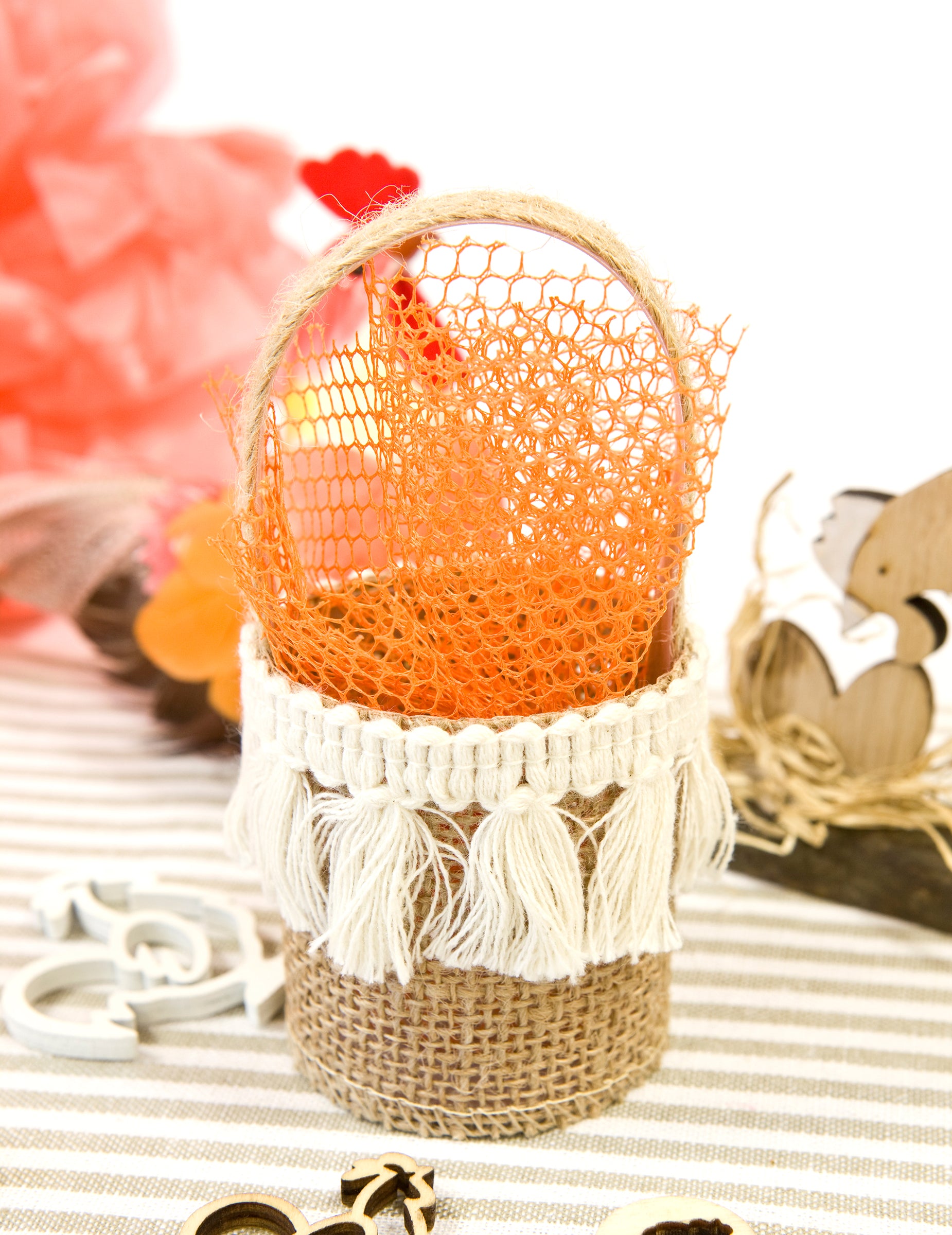 Tento malý košík z pytloviny měří přibližně 12 x 5,5 cm a vyznačuje se jemnými bílými bambulkami. Perfektní pro uložení sušených květin, vytvoří atmosféru země nebo bohémský během vašich akcí.