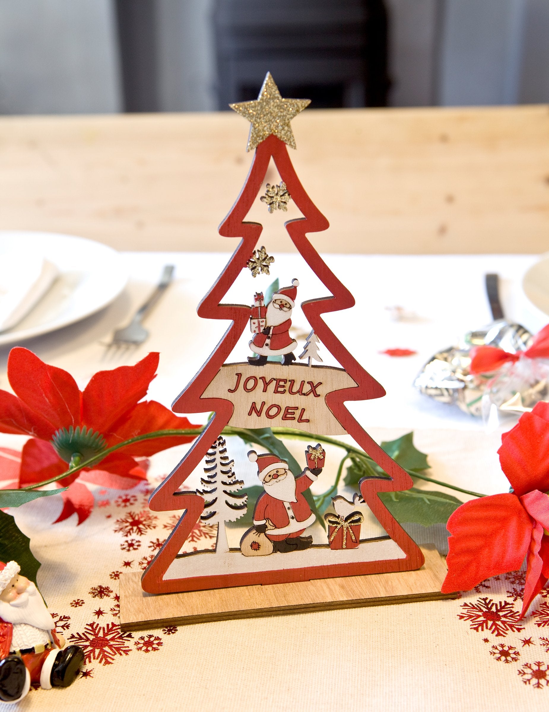 S rozměrem 23 x 15 x 4 cm, Tato nádherná **dekorace stolu** má podobu vydlabaného červeného stromu. Uvnitř je autentická výzdoba s **Santas** a textem „**veselé Vánoce**“. Tato **malá dřevěná dekorace** vnese do vašeho interiéru přirozenou a tradiční notu na oslavu **Vánoc** s kouzlem.