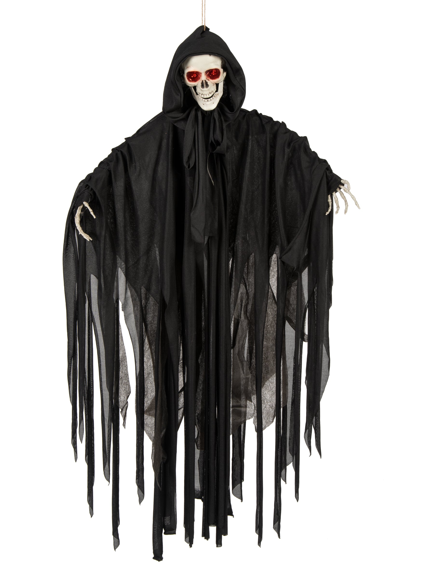 Tato světelná, zvukem naplněná, animovaná halloweenská kostra měří přibližně 90 cm vysoká. Tato dekorace v černé barvě má masku podobnou kostlivci s červenýma očima a kostlivýma rukama. Efekt roztrhané látky dodává celé věci ještě větší ponurost, můžete ji snadno zavěsit kamkoli chcete pomocí šňůry umístěné nad plastovou hlavou kostlivce. Když duch uslyší zvuk v okolí, začne se pohybovat a vydává zvuk pro dechberoucí realismus! K provozu dekorace budete potřebovat 3 AA baterie. Toto zavěšení se bude hodit k nastavení tónu vašeho strašidelného večera na vaší halloweenské párty!