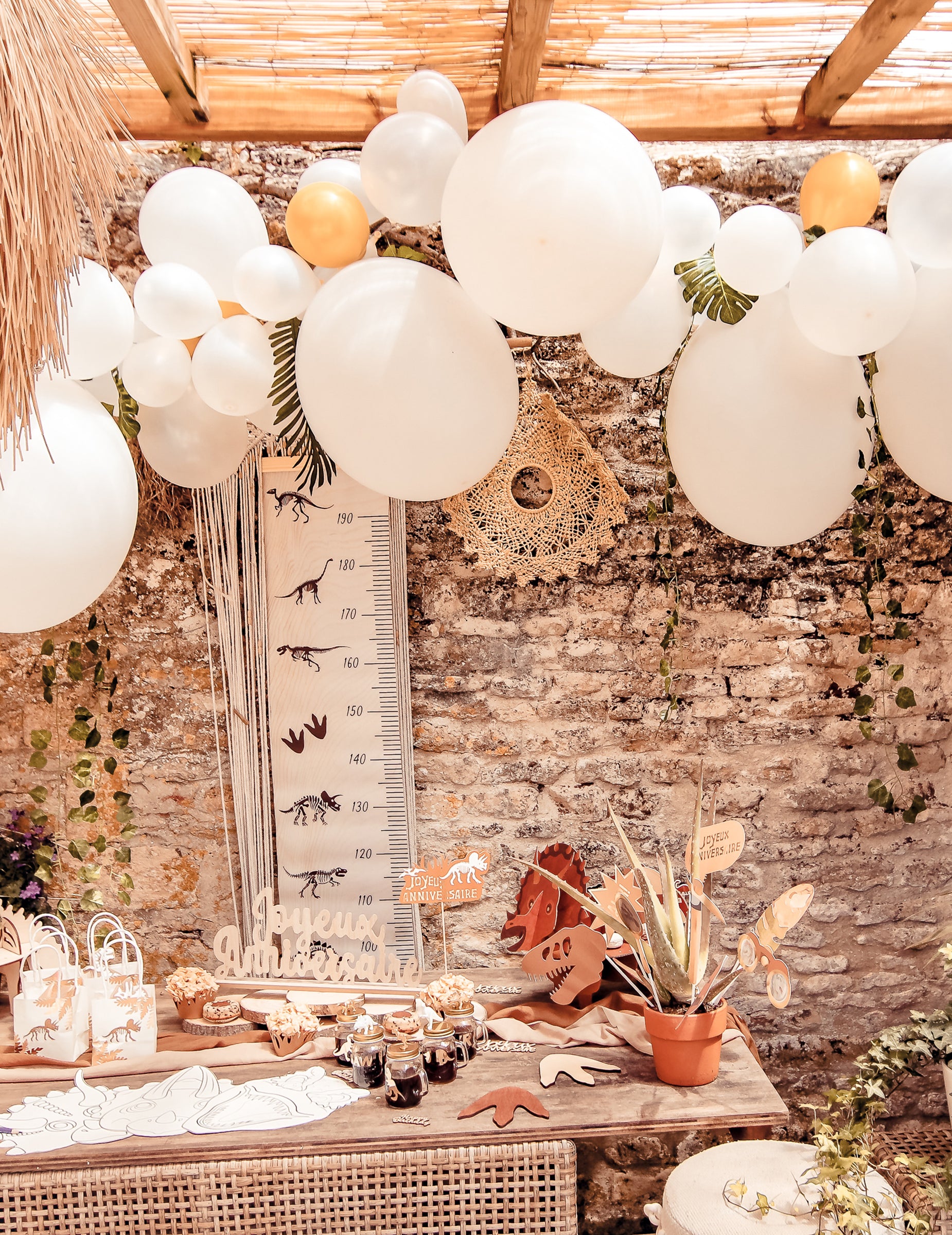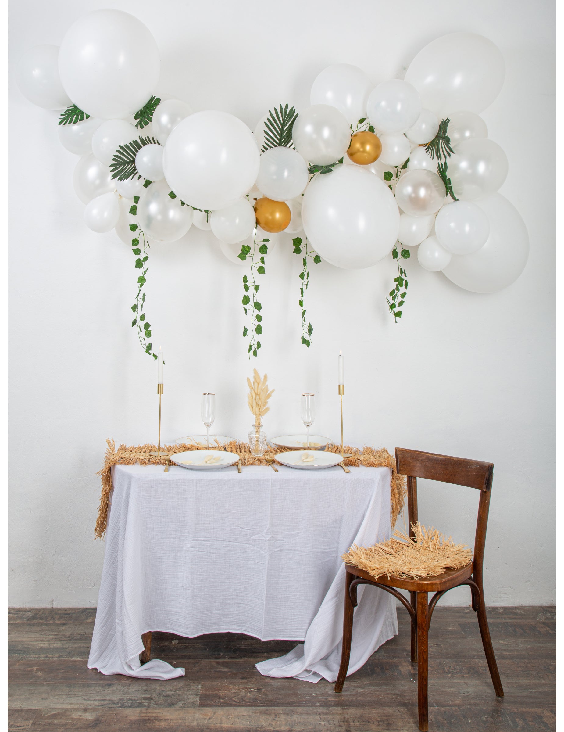 Vylepšete svou událost touto kompletní sadou 55 prvků, abyste vytvořili a elegantní tropický balónový oblouk. Tato sada vám umožní vytvořit vzdušnou a elegantní dekoraci mísící bílé a zlaté tóny s rostlinným nádechem.