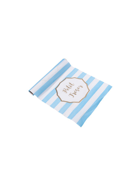 Vylepšete svou party výzdobu tímto stolní běžec v tkanině o rozměru 28 cm široký a 5 m dlouhý. Má modrobílý pruhovaný design, zdobený "malý poklad“ ve zlacení uprostřed. Je to ideální volba pro a miminko, a křest nebo a 1. narozeniny úspěšný.