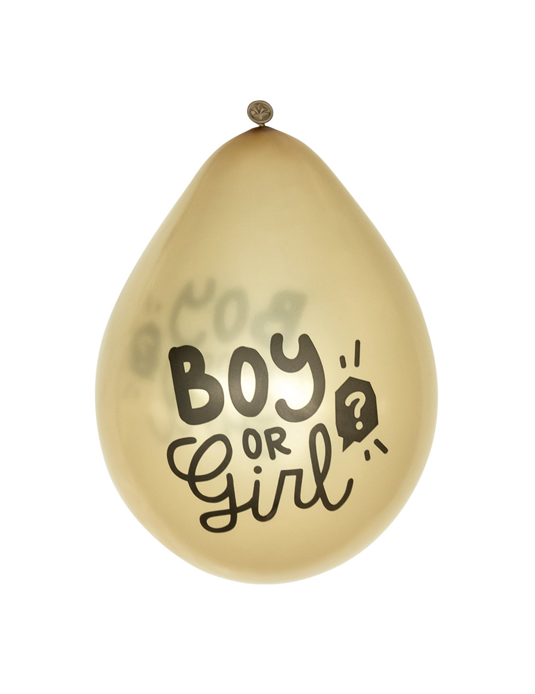 Každý kus měří přibližně 23 cm když je nafouknutý a představuje lesklý zlatý odstín se zprávou "chlapec nebo dívka ?" vytištěno černě.