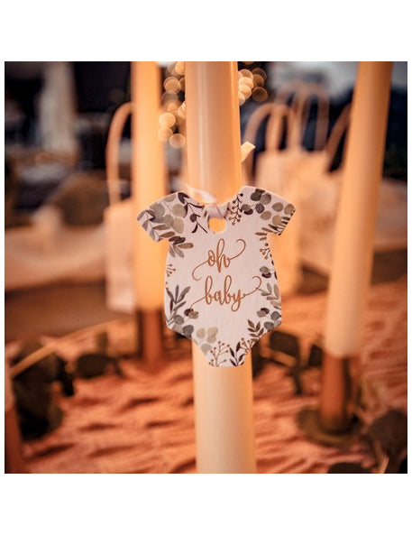 Vylepšete svou výzdobu touto sadou 10 kusů štítky původní ve tvaru body. Každý kus má rozměry přibližně 5 x 6 cm a má zelené a zlaté vzory listů, doplněné nápisem "oh baby". Díky přiložené bílé saténové stuze je snadno připevníte. Tyto rostlinné štítky jsou ideální pro zdobení vašich nádob na cukroví nebo vašich dárků během a miminko.