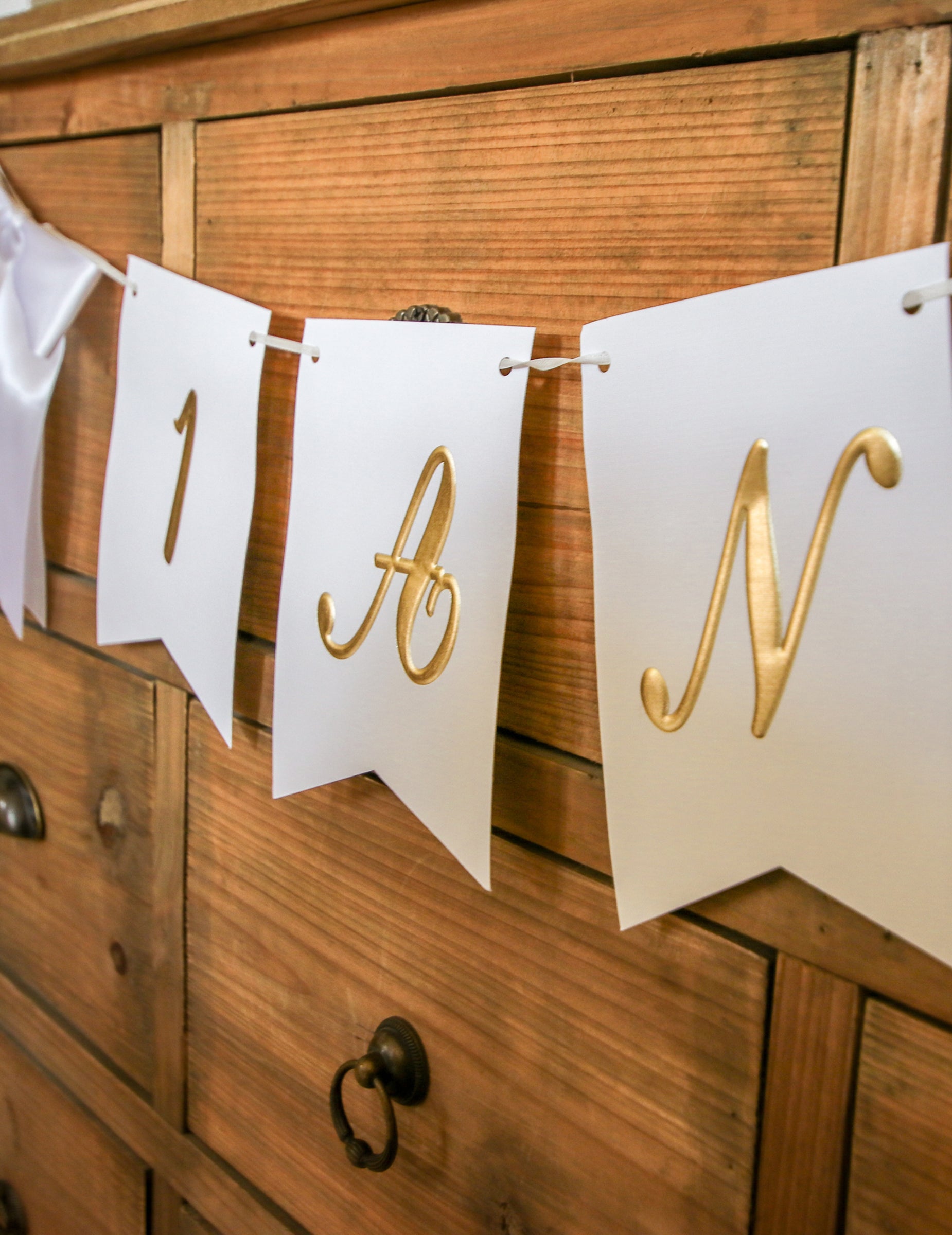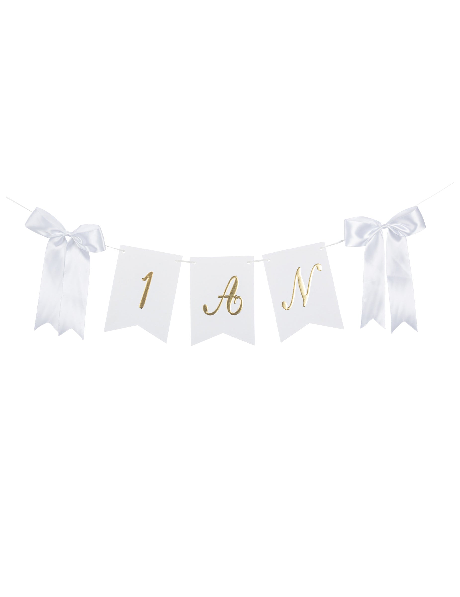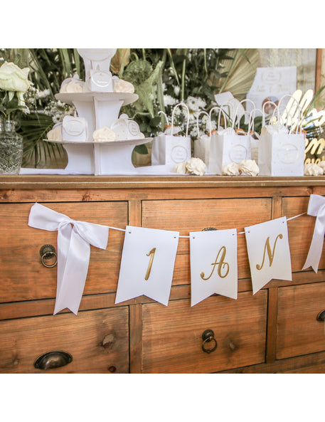 1 rok bílá a zlatá girlanda se saténovými mašlemi 150 cm a vlaječky