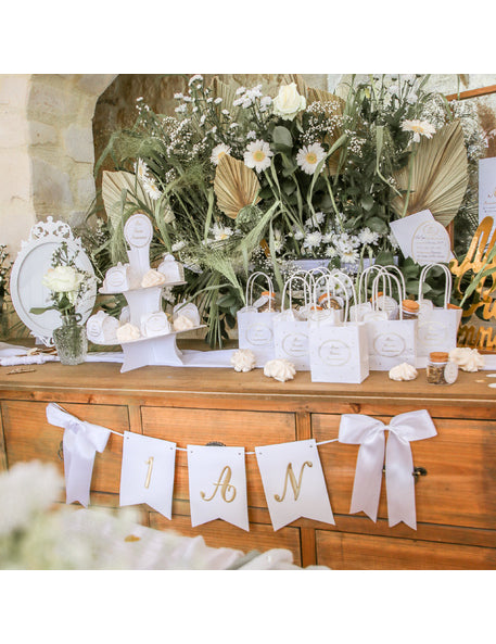 S celkovou délkou 150 cm, toto věnec dekorační je ideální k označení příležitosti během prvního večírku. Toto příslušenství se skládá ze tří bílých vlajek o rozměrech 12,7 x 17,8 cm, zvýraznění nápisu "1 ROK“ zlatým písmem. Pro větší kouzlo má po stranách dvě bílé saténové mašle. Toto věnec 1 rok bude základním prvkem pro výzdobu první narozeniny úspěšné a elegantní.