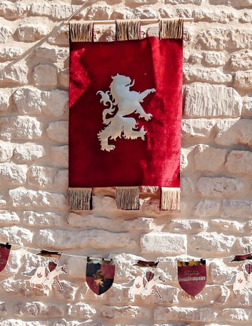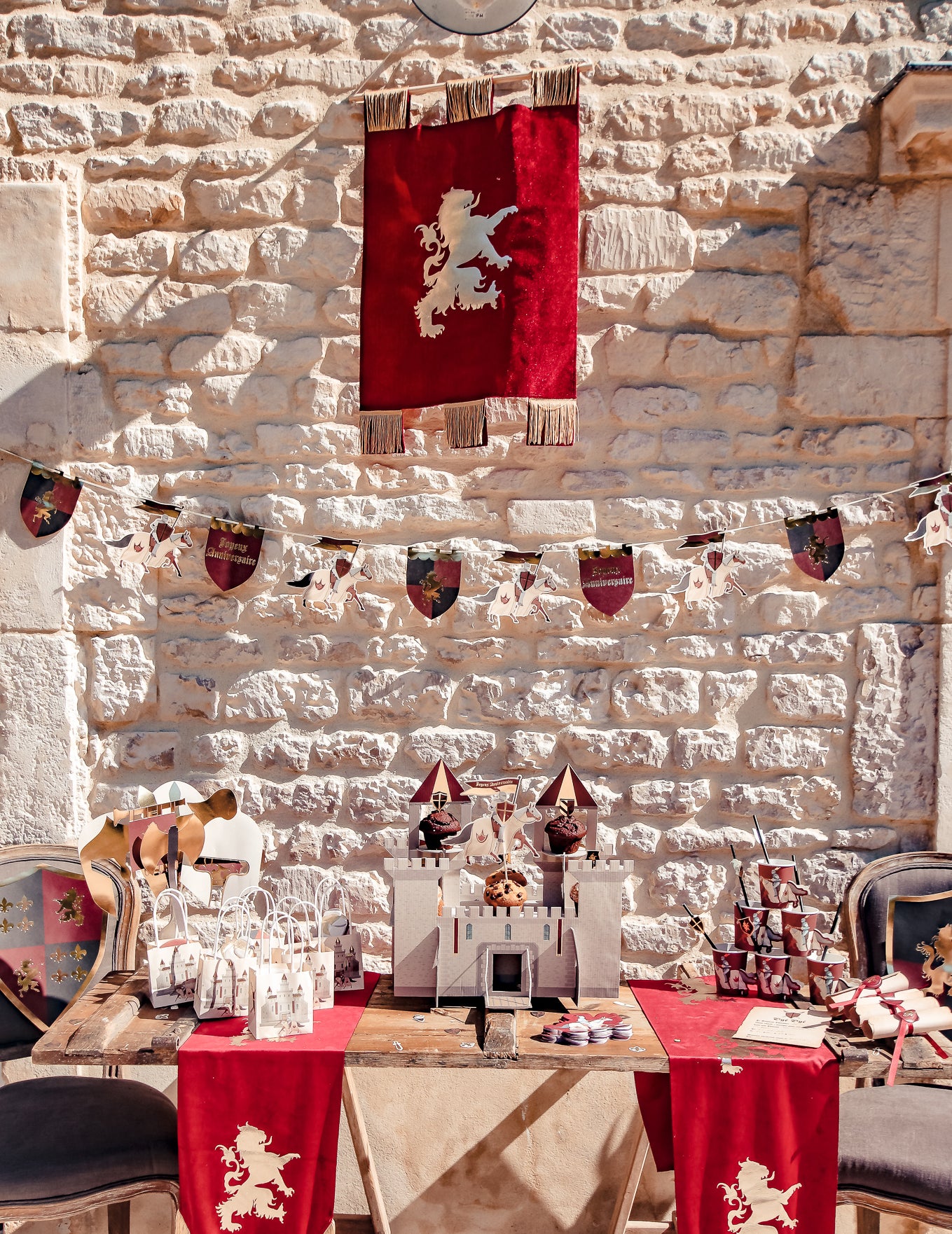 Tato erbová dekorace je vyrobena z vínově červeného sametu. Měří přibližně 50 x 80 cm. Tento královský erb je zdoben krásným zlatým lvem. Můžete si ho snadno zavěsit a přidat ho mezi středověké dekorace během rytířské párty!