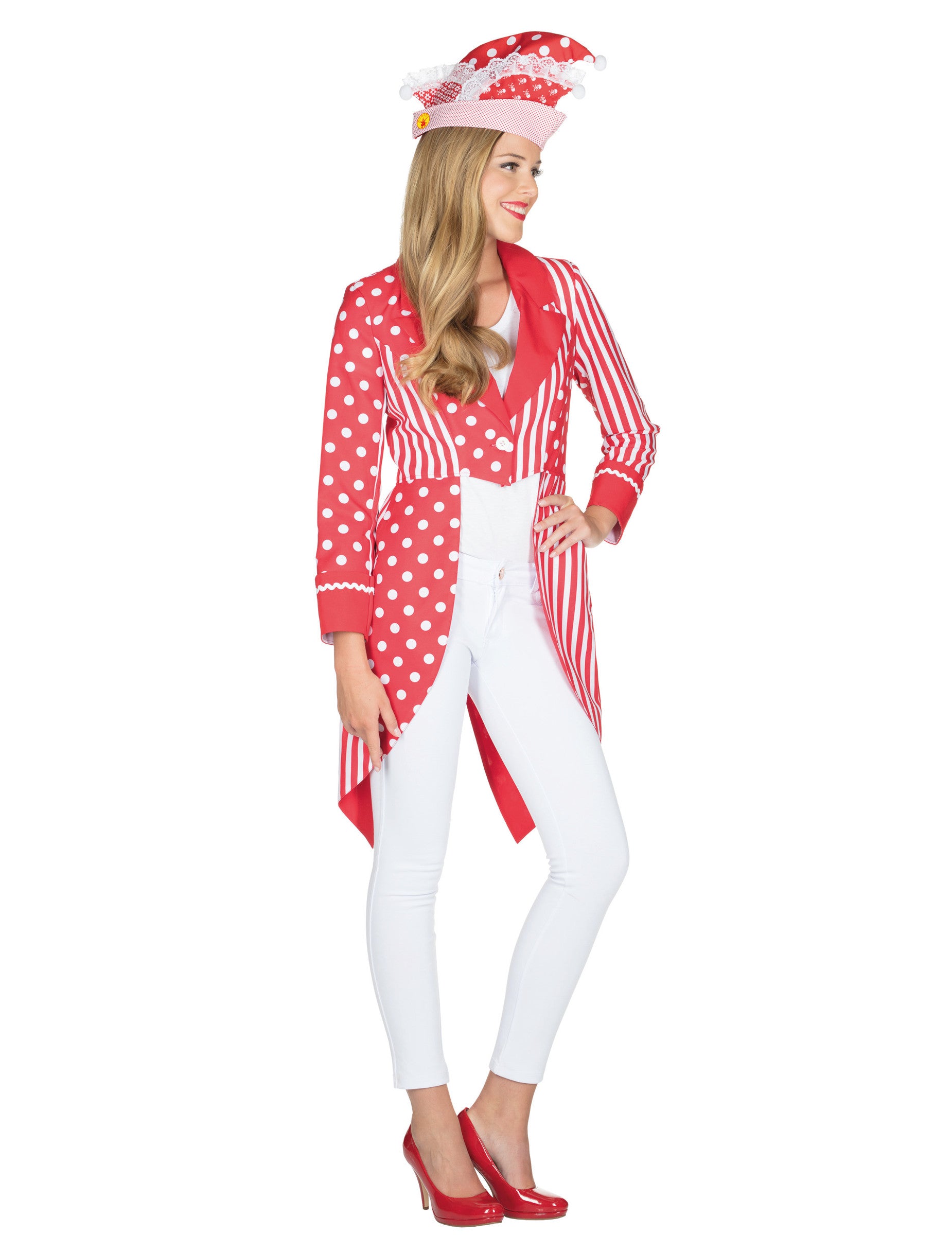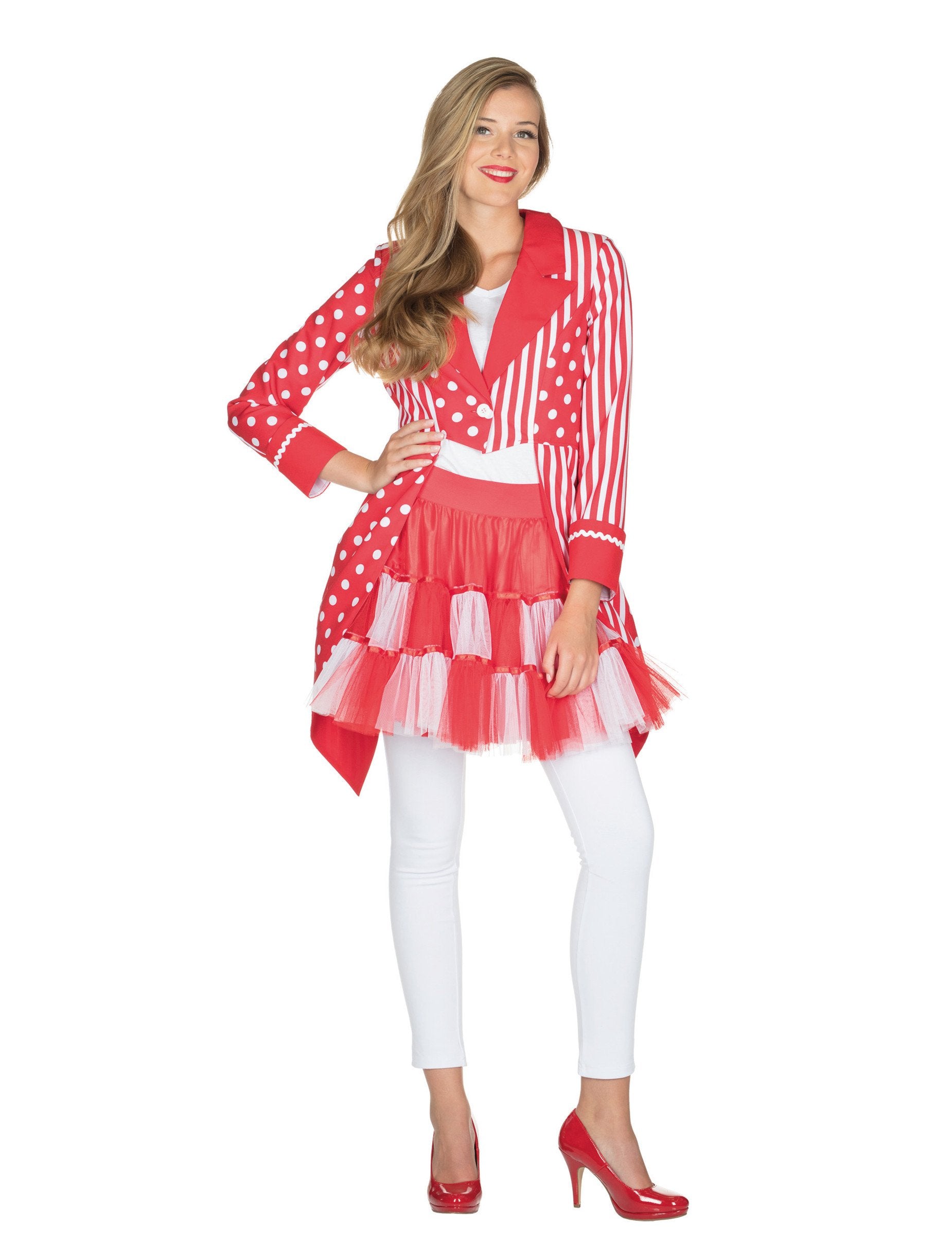 Toto převlečení červeného a bílého ocasu je pro dospělé. Zahrnuje ocasní bundu. Tato bunda je na přední straně krátká a dlouhá vzadu. Má pěnová ramena pro elegantní dotek a bílé centrální tlačítko, které jej zavře. Je celkem červená s liniemi a bílými tečkami. Tato ocasní bunda bude ideální pro dokončení vašeho karnevalu nebo novoročního oblečení!