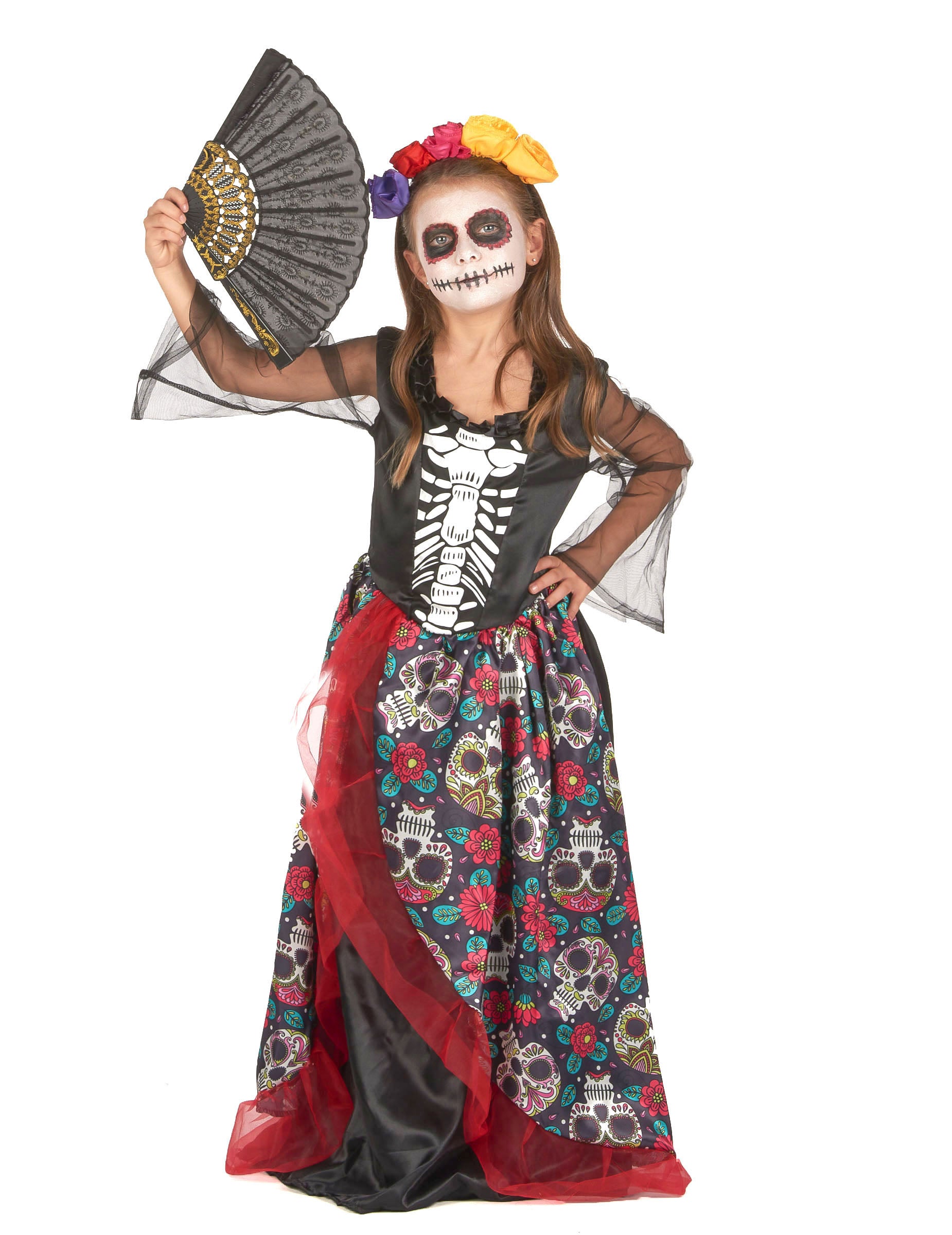 Toto Kostým Dia de los muertos je pro dívka a skládá se z šatů a pokrývky hlavy.