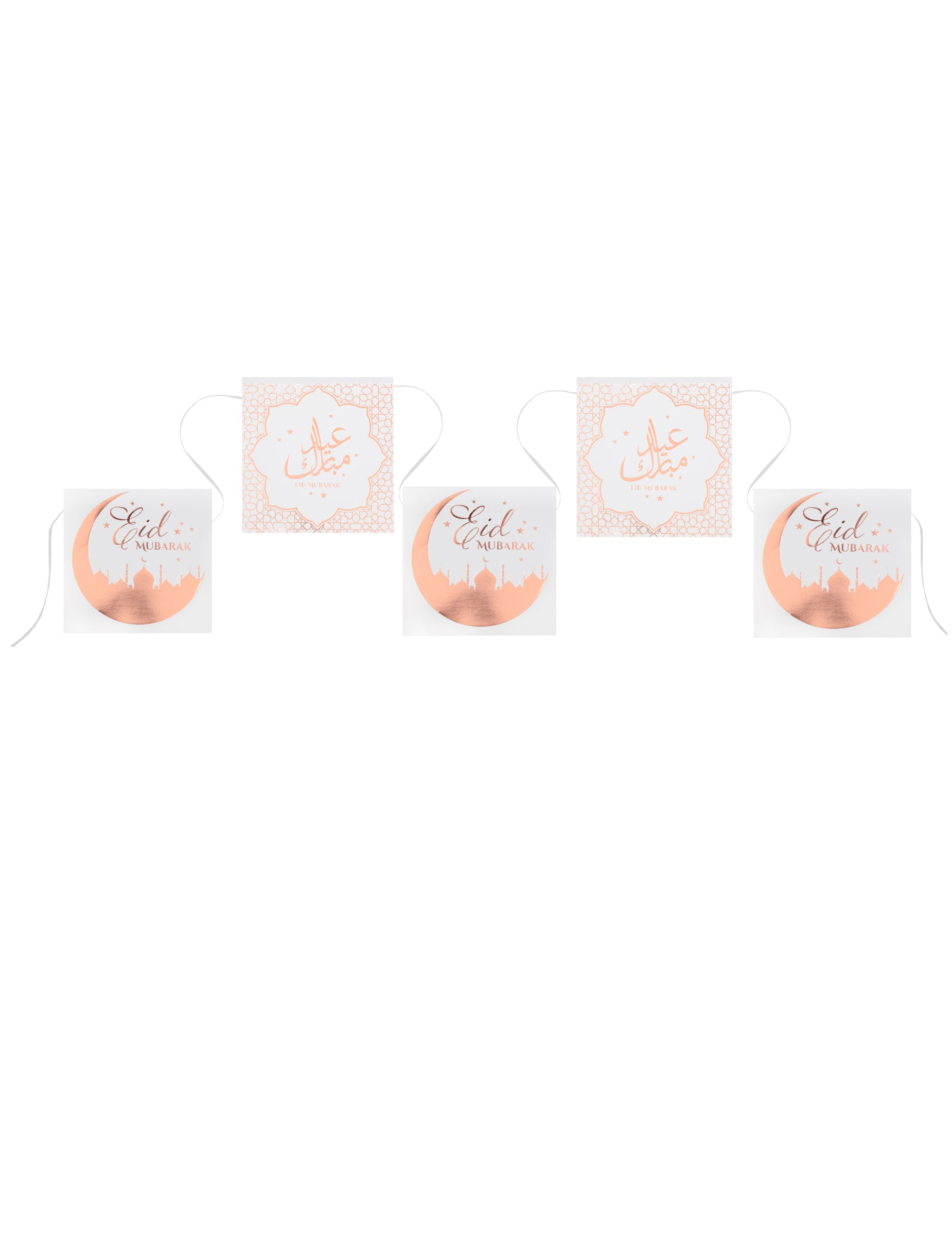 Věnec z 12 kartonových vlajek eid mubarak z růžového zlata 5 m na eid