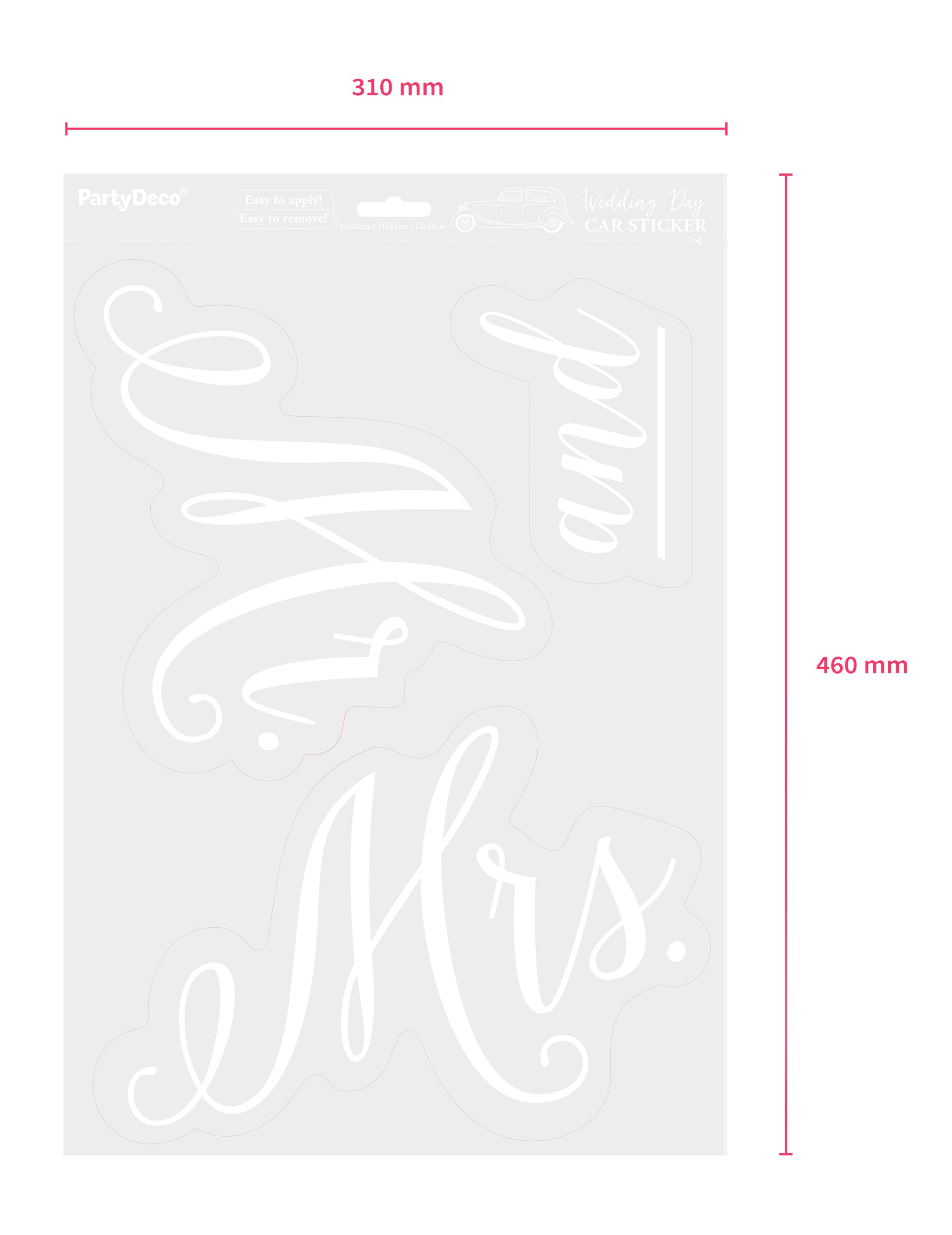 Elegantně ozdobte svatební vozidlo touto sadou 3 kusů samolepky na auto bílé. Tato sada obsahuje „mr. » přibližně 21 x 26 cm, "paní » 31 x 21 cm a také nálepku 12 x 15 „a“. cm. Tyto samolepky pan a paní jsou ideálním doplňkem pro vylepšení auto nevěsty a ženicha hned po obřadu. Jednoduše je připevněte na zadní okno nebo dveře, dekoraci pak doplňte tylem nebo stuhami. Toto sada nálepek na auto dodá vám romantický a elegantní dotek svatba.