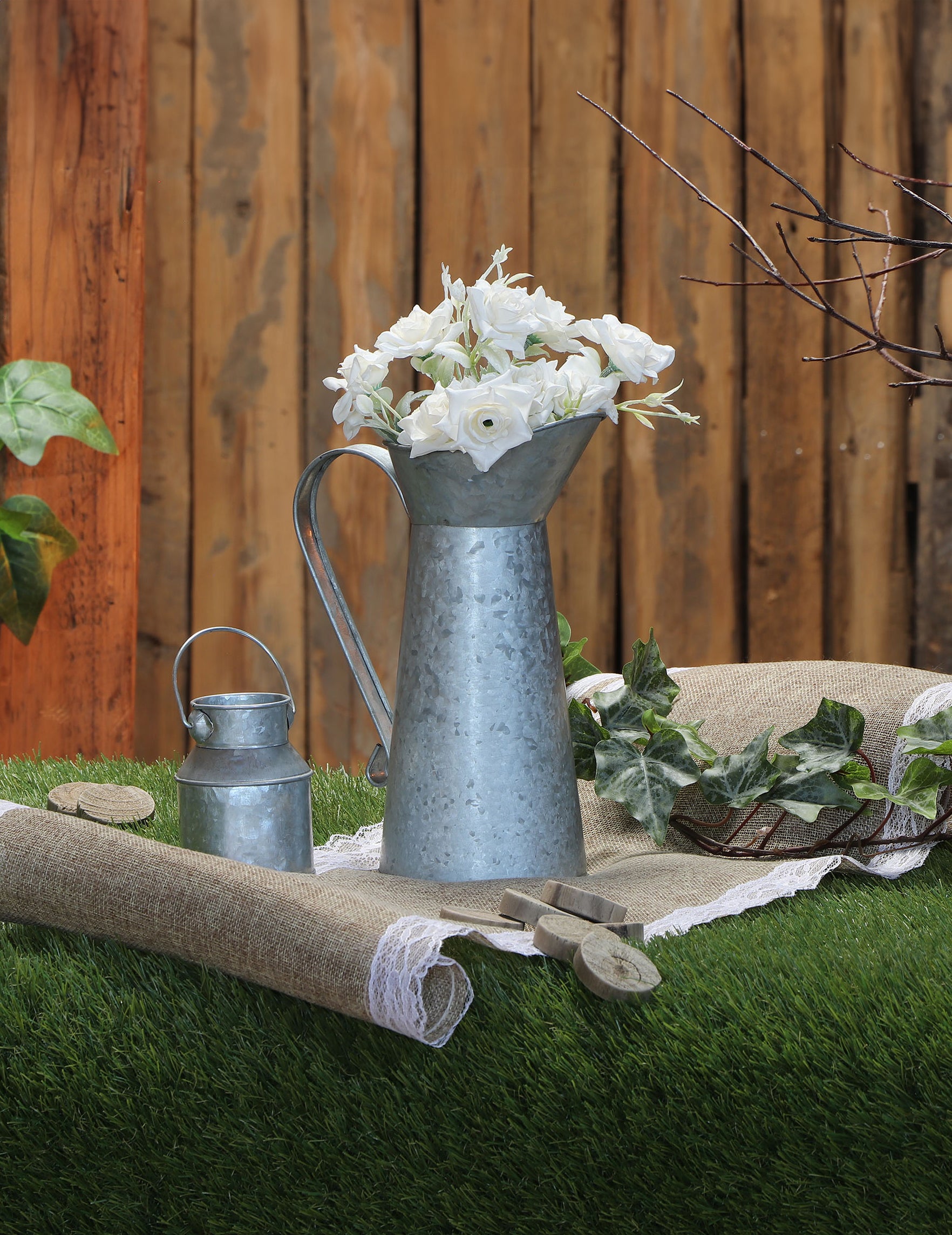 Osvojte si autentický a retro styl vaší akce džbán na mléko s vintage designem. Vyrobeno z šedého zinku s letitým vzhledem zinkový džbán opatření 18 cm vysoký za 12 cm široký a má praktickou rukojeť. Ideální pro a retro svatba nebo venkovskou atmosférou, může posloužit jako váza na vaše sušené květiny nebo sezónní kytice. Přizpůsobte si to ročník konev fixem nebo křídou, nebo přidejte krajkovou stuhu pro extra měkkost. Toto ročník džbán na mléko je dokonalým doplňkem k vytvoření jedinečného středu a vylepšení vašeho svatební výzdoba.