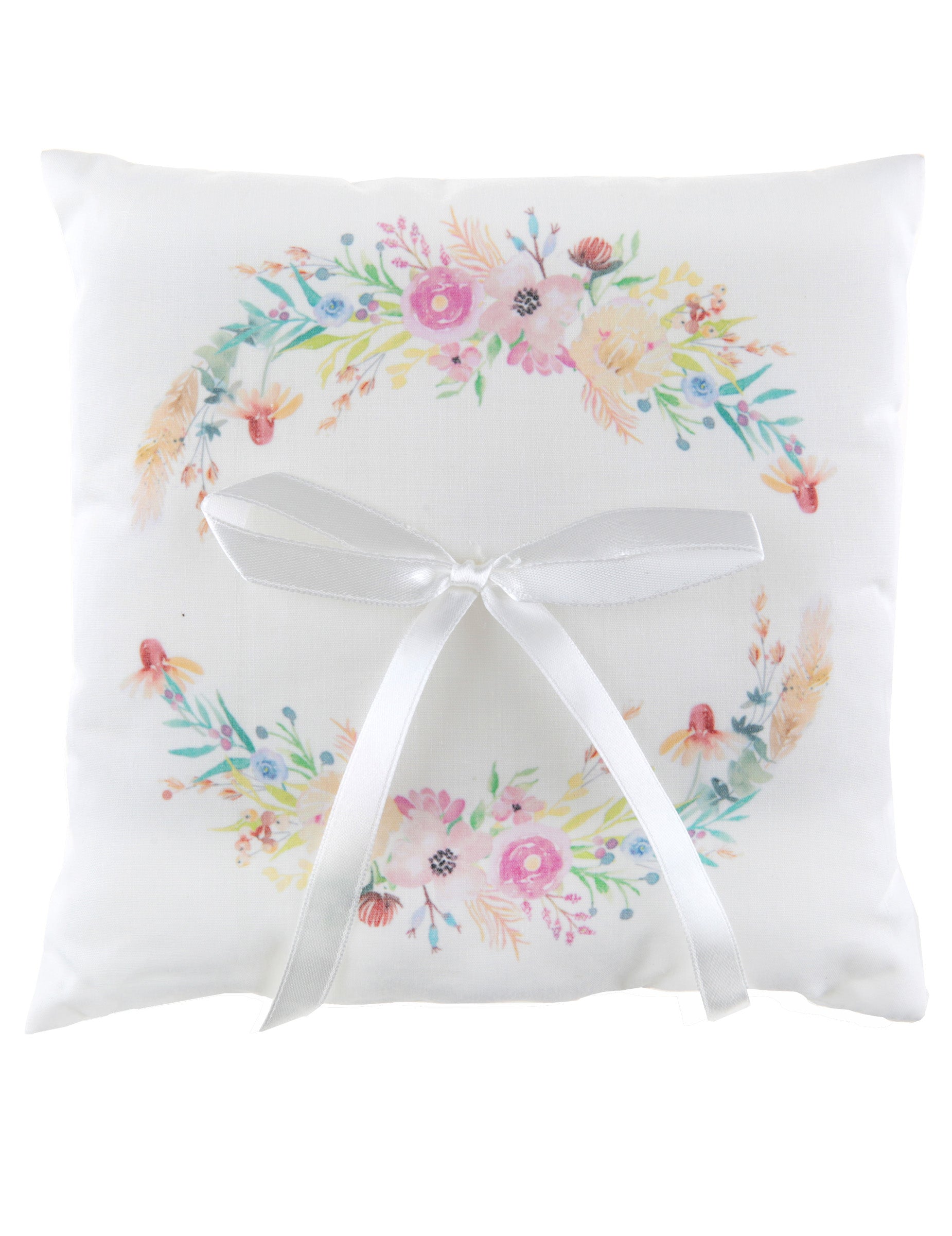 Toto velkolepé polštářek na snubní prsteny v bílé bavlně je nezbytným doplňkem pro váš obřad. Zdobený jemným věncem z květin v akvarelových barvách polštářek na snubní prsten 18 x 18 cm dokonale se hodí do dekorace Svatba na téma země nebo jaro. Bílá saténová stuha bezpečně zajistí vaše prsteny, aby je mohl bezpečně přepravovat ten nejlepší muž nebo čestné dítě. Toto polštářek na snubní prsten při vaší návštěvě radnice nebo kostela vnese romantický a květinový nádech. Ideální pro liberty styl květovaný polštář na snubní prsten zlepší výměnu vašich přání.