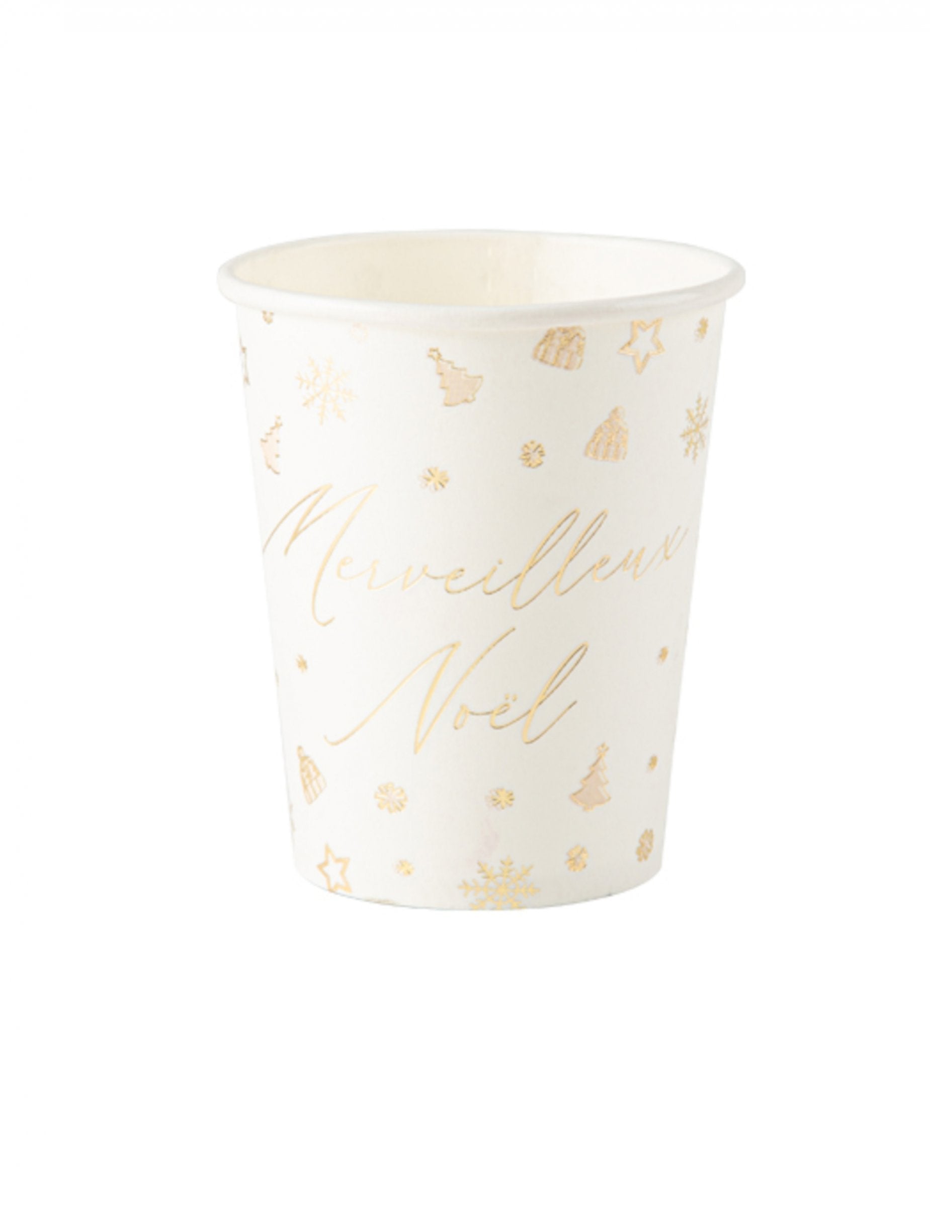 Vylepšete svou párty výzdobu touto sadou 8 kusů poháry vyrobeno z pevného kartonu. Tyto bílé sklenice jsou zdobeny zlatými zimními vzory, jako např jedle, vločky a blikající hvězdy. Každý kus je označen "nádherné Vánoce" zlatým písmem pro elegantní efekt. Tato sada je ideálním prvkem pro prostírání stolu Vánoce kouzelné a přátelské.