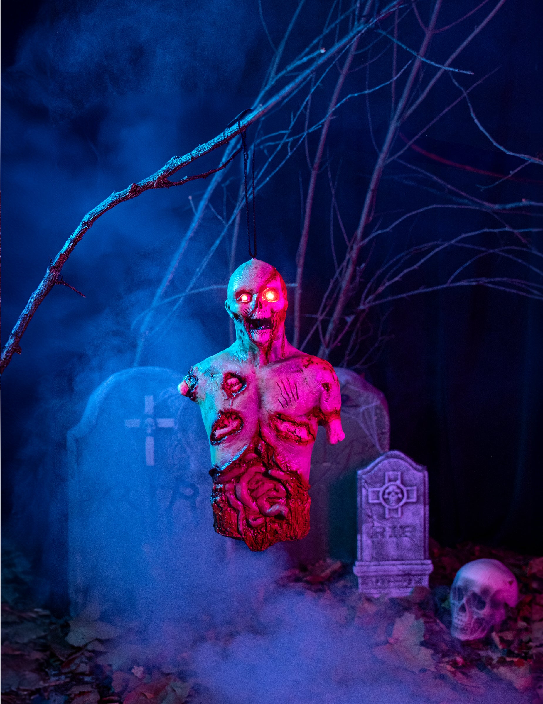 Je ve tvaru zombie rozsekaný s děsivě červenýma očima.