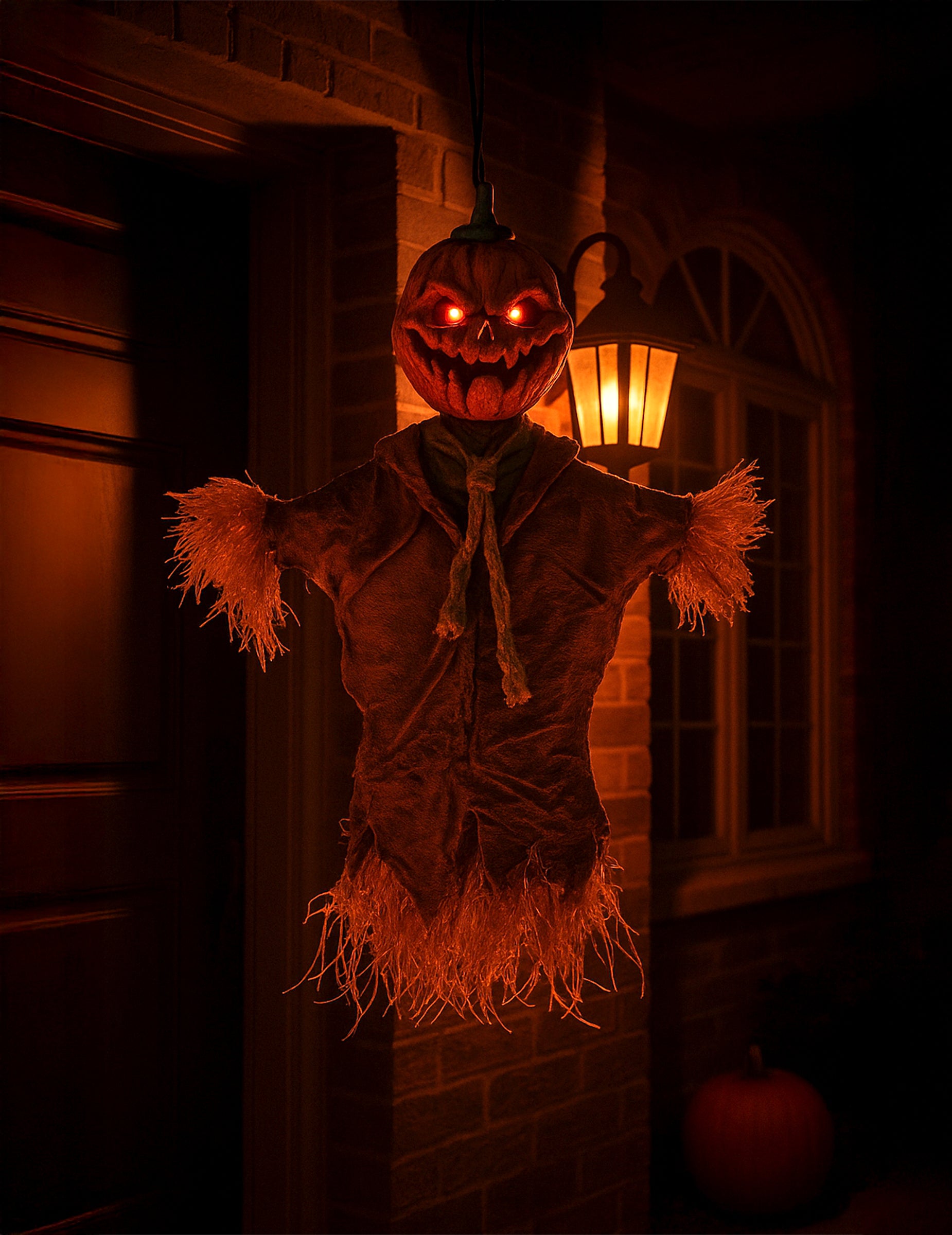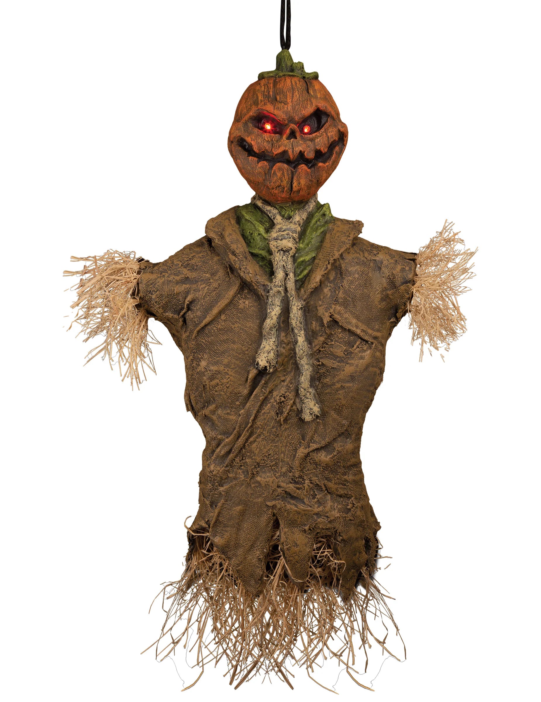 Tato závěsná dekorace má rozměry 10 x 32 x 54 cm. Obsahuje strašáka s dýňovou hlavou a děsivýma rudýma očima. Dodá vašemu pokoji strašidelný vzhled s touto halloweenskou dekorací!