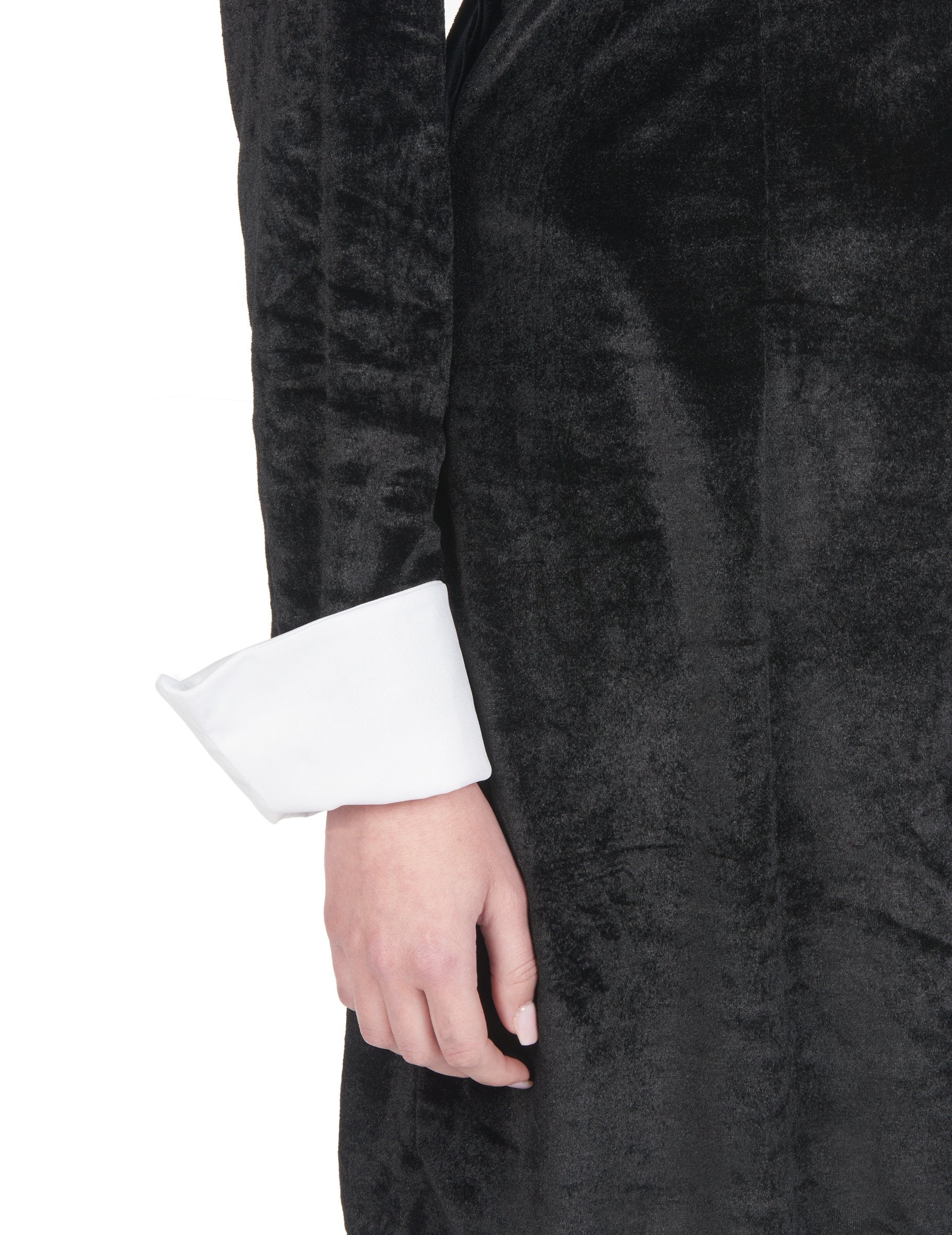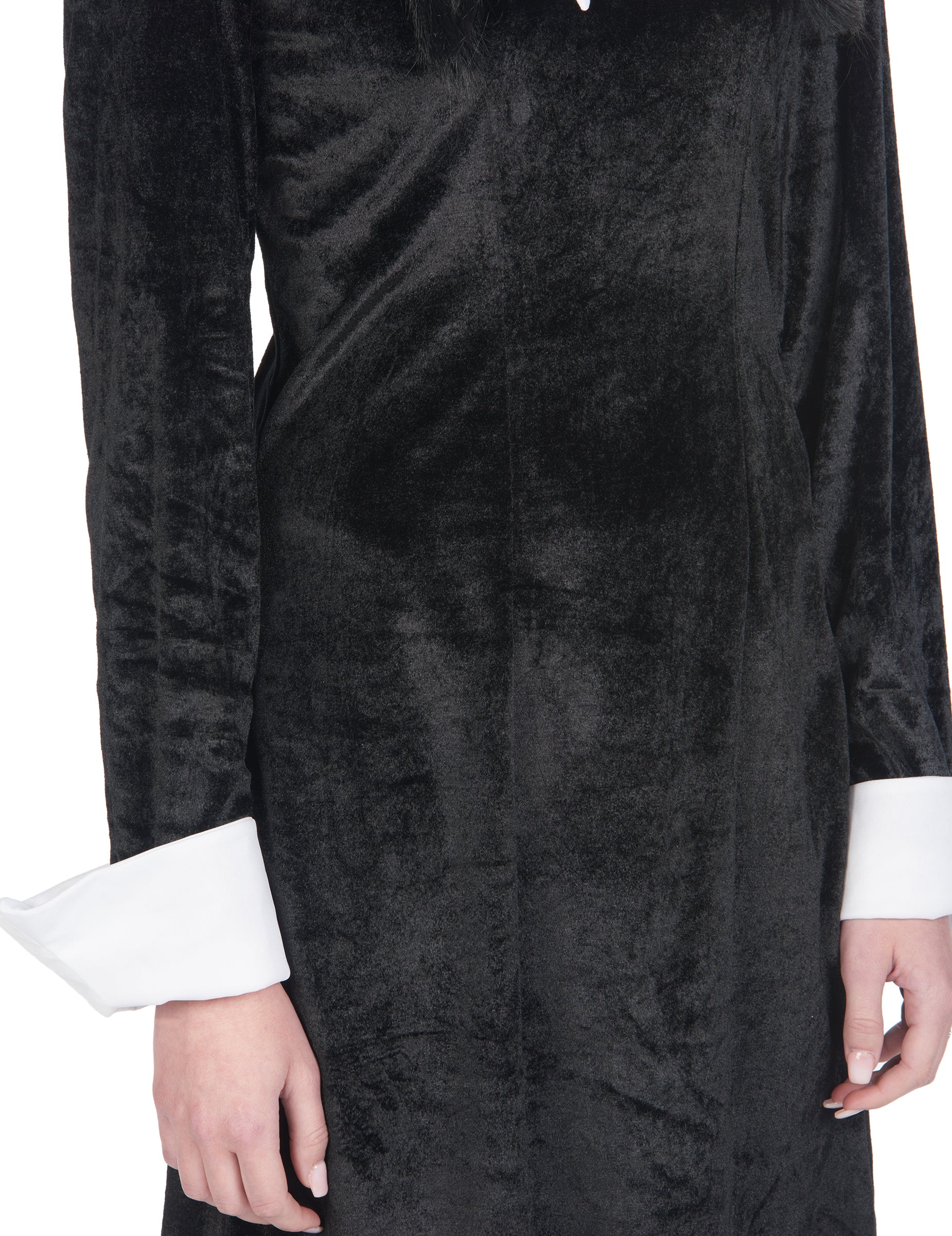 Jedná se o středně dlouhé šaty s bílým límečkem. Šaty jsou černé a vyrobené z látky se sametovým efektem.