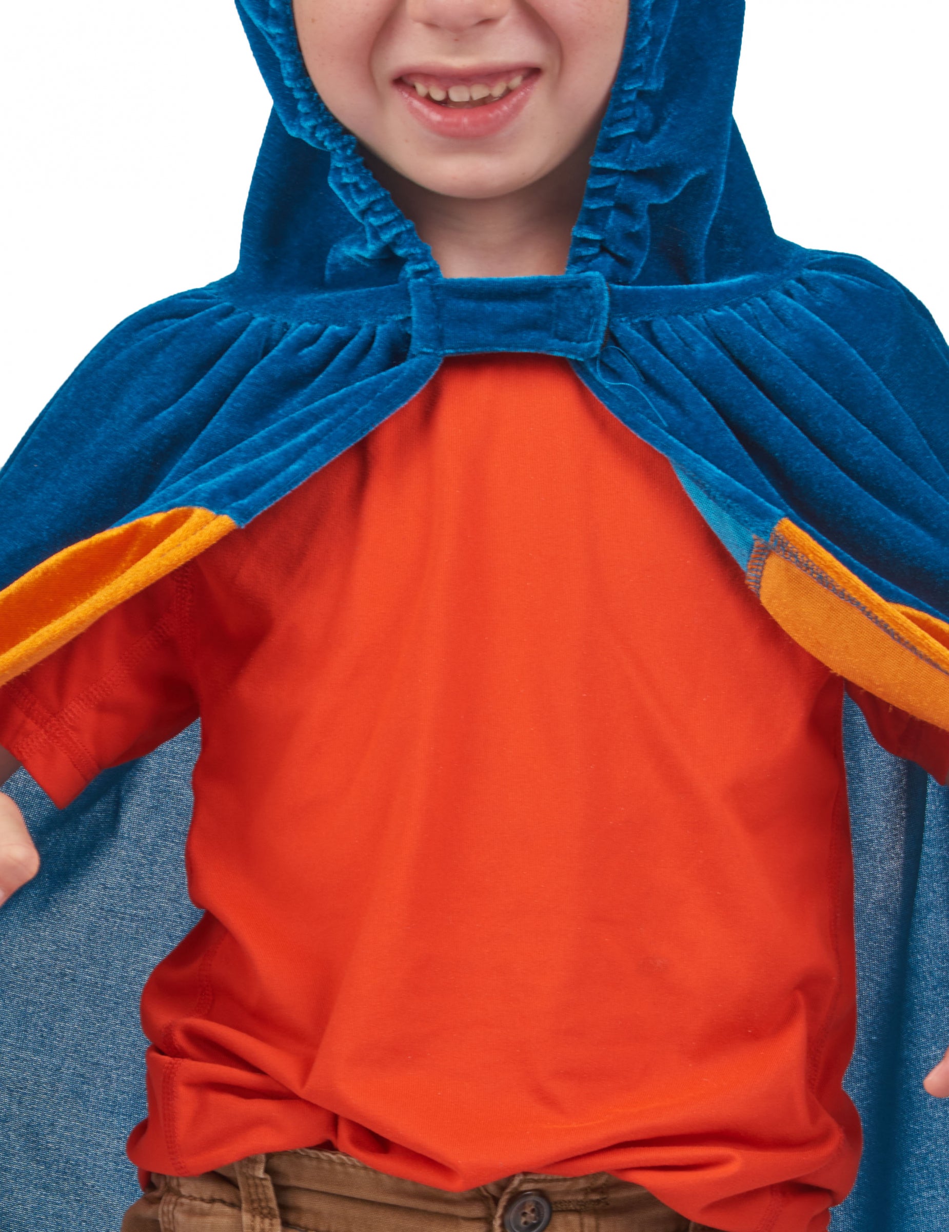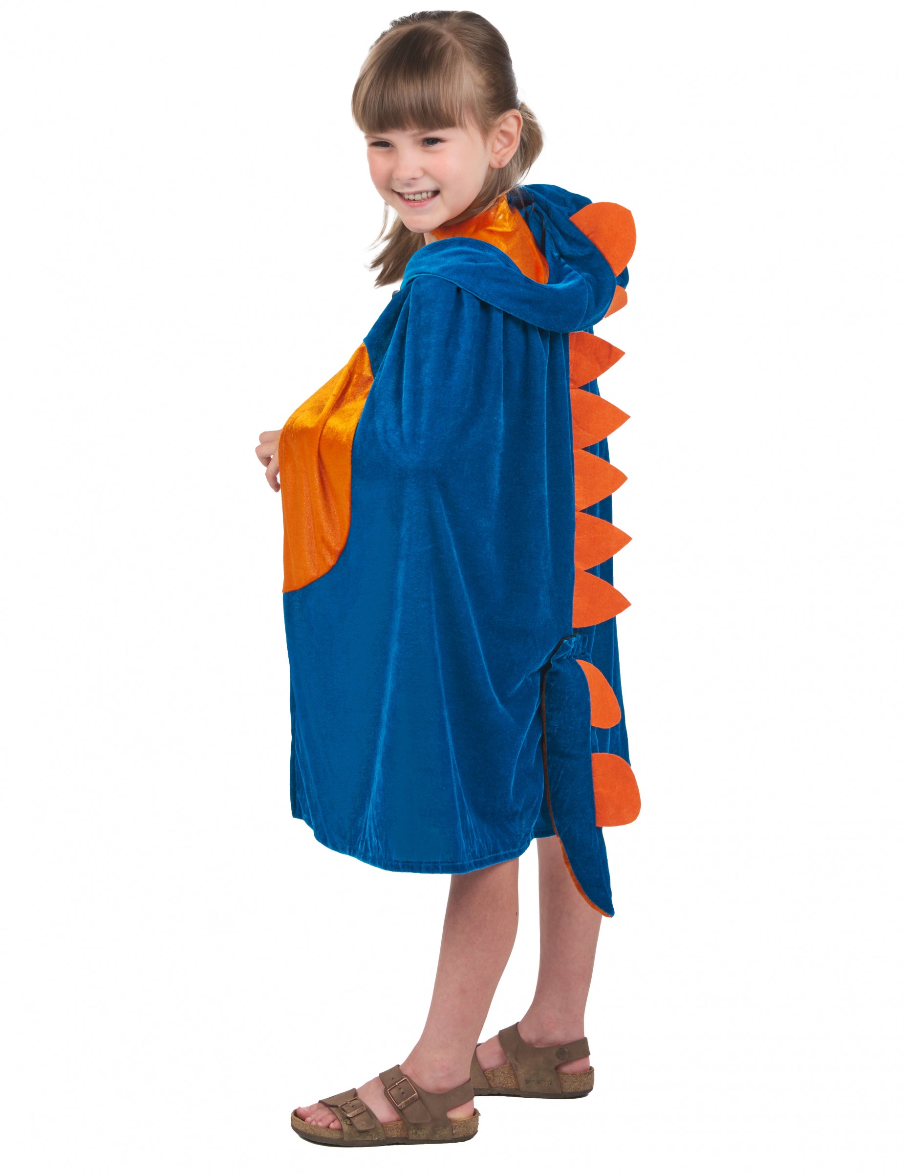 Tento kostým představuje plášť s dinosaurem určený pro děti. Plášť je celoplošně modrý s oranžovými detaily na břiše, hlavě a zádech. Plášť je skutečně sametový a zapíná se na suchý zip na límci. Má kapuci s malými kšilty, které připomínají dinosauří stranu. V zadní části pláště je také modrooranžový ocas, který se zapíná na suchý zip. Tento dinosauří plášť bude ideálním doplňkem karnevalového oblečení vašeho dítěte!