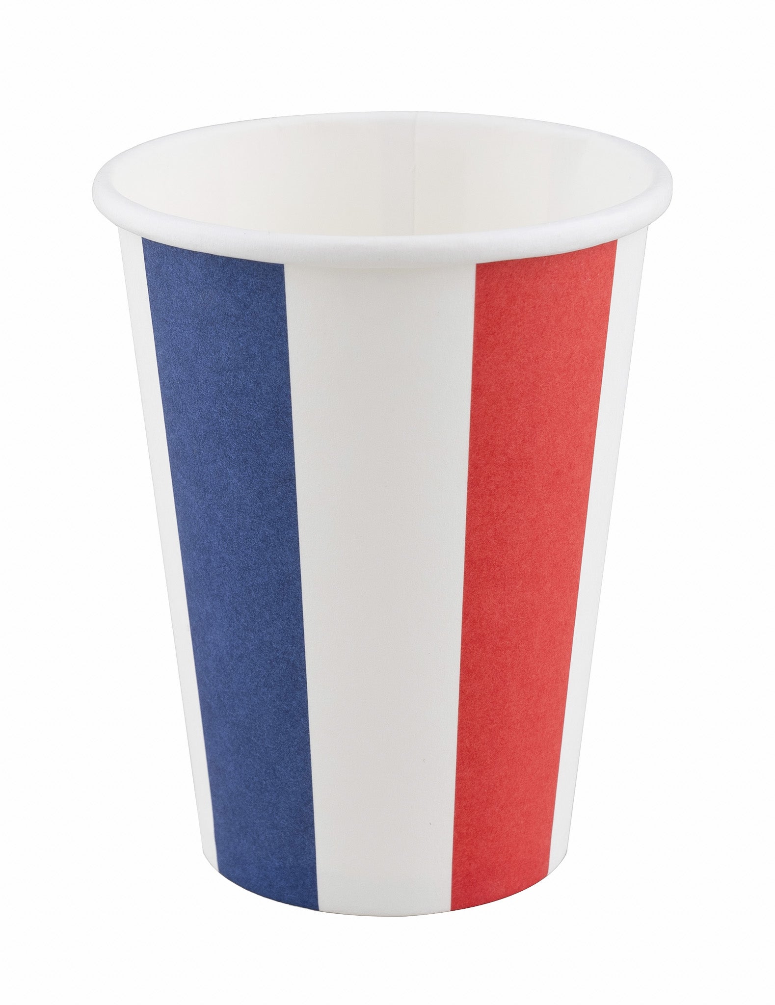 Tyto kartonové šálky se prodávají do 8. mají kapacitu asi 250 ml a jsou v barvách francouzské, bílé a červené francouzské vlajky. Tyto brýle budou ideální na večer nebo francouzskou sportovní akci!