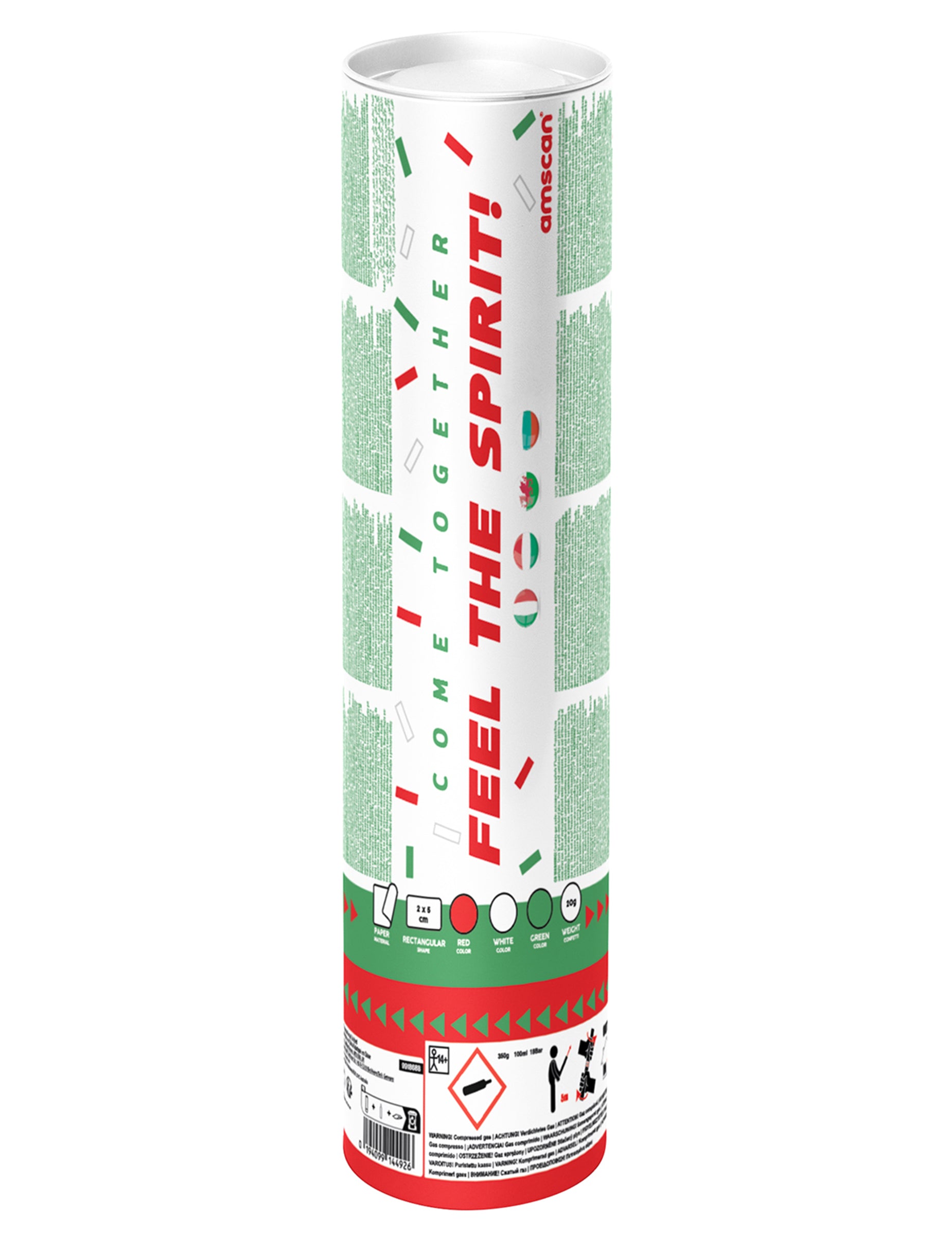 Toto konfetové dělo bude perfektní pro podporu Itálie, Maďarska nebo Bulharska během sportovních akcí. Skládá se z konfet v červené, bílé a zelené papíře. Tuto hlaveň můžete ovládat otočením dolního konce, který povedou všechny konfety z hlavně!