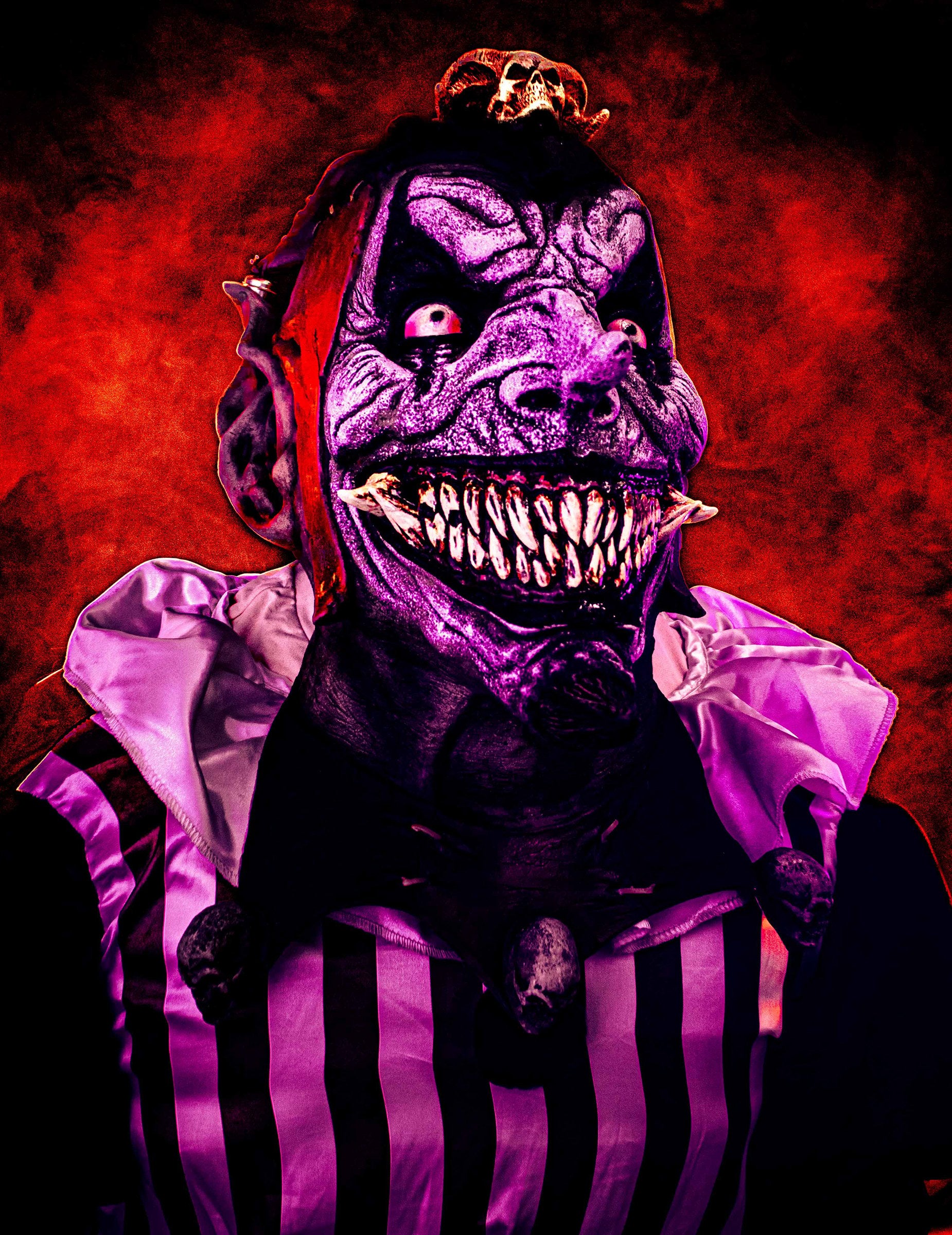 Jeho červený a černý klobouk, zdobený malé lebky, posiluje její zlověstný vzhled.