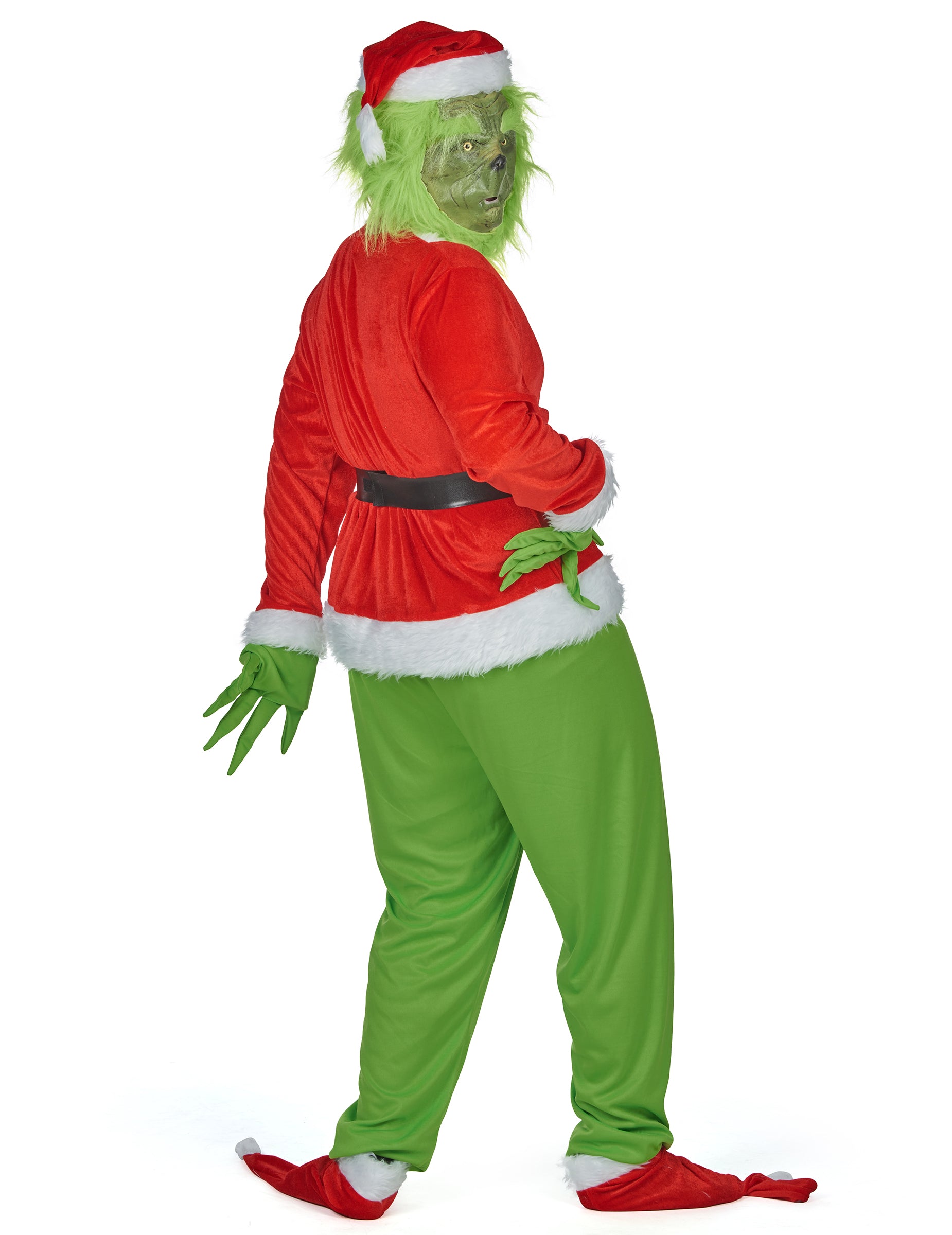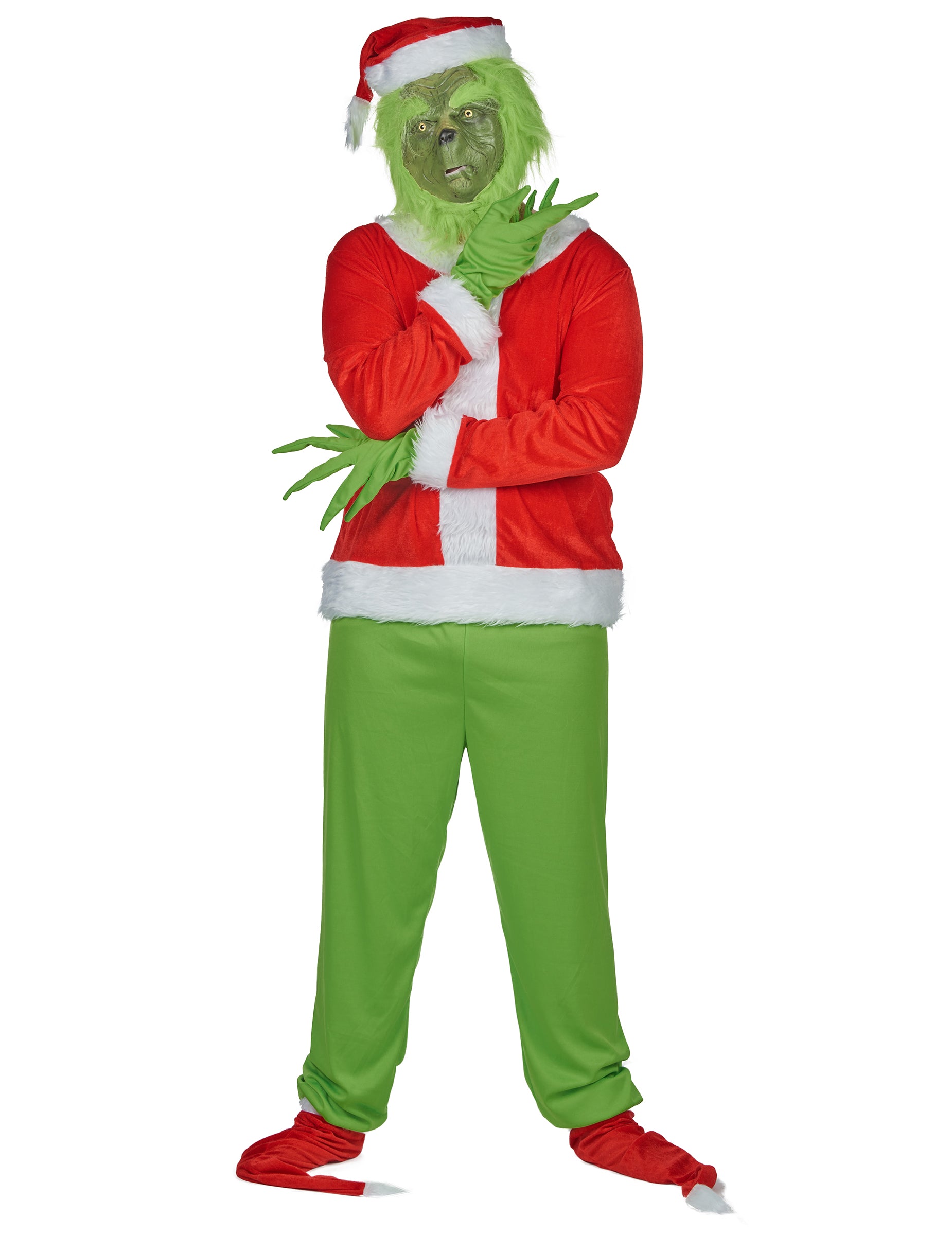 Prodloužené zelené rukavice dokonale napodobují dlouhé a zahnuté prsty postavy, zatímco vánoční čepice v červené a bílé barvě dodává tomuto kostýmu nezapomenutelný závěr.
