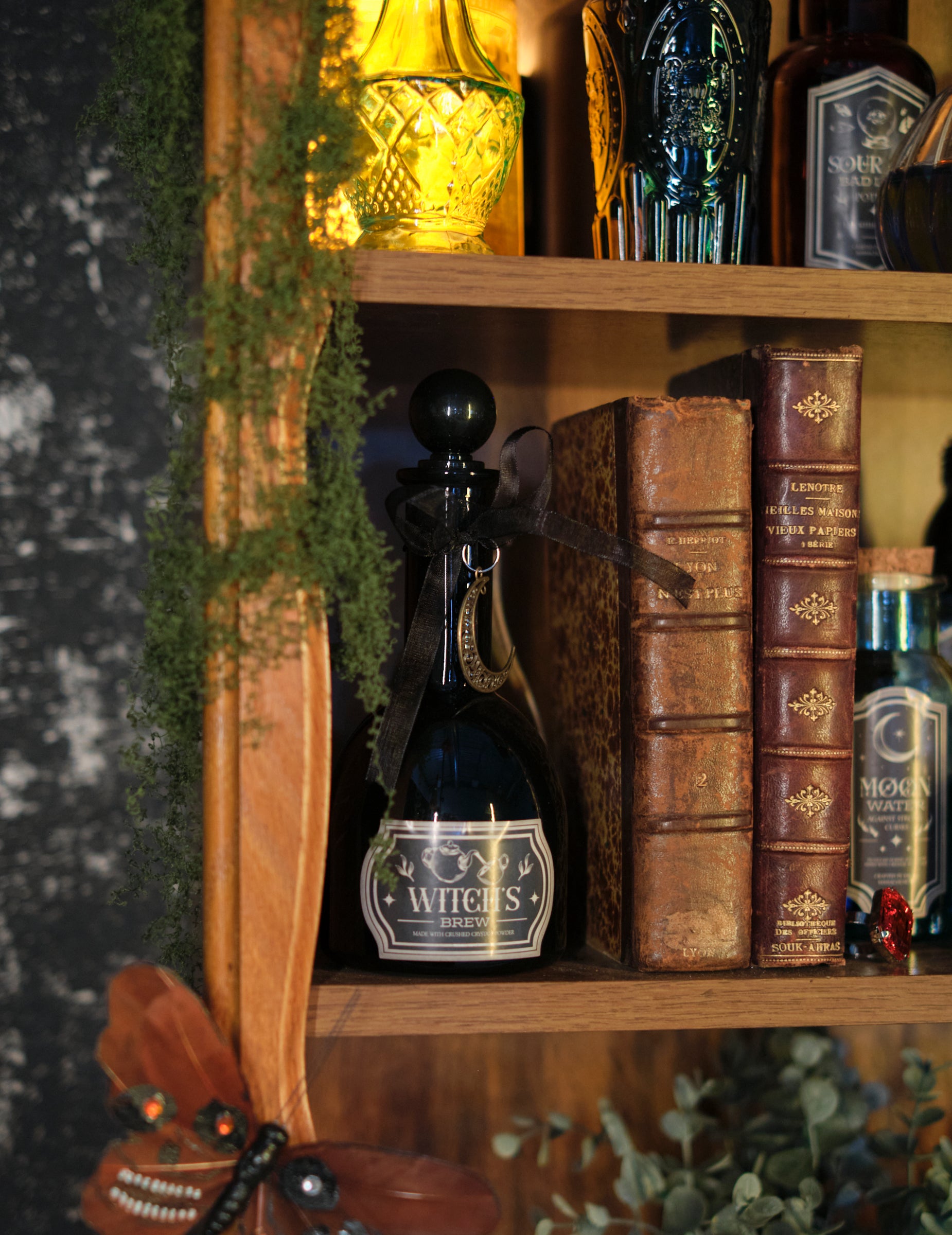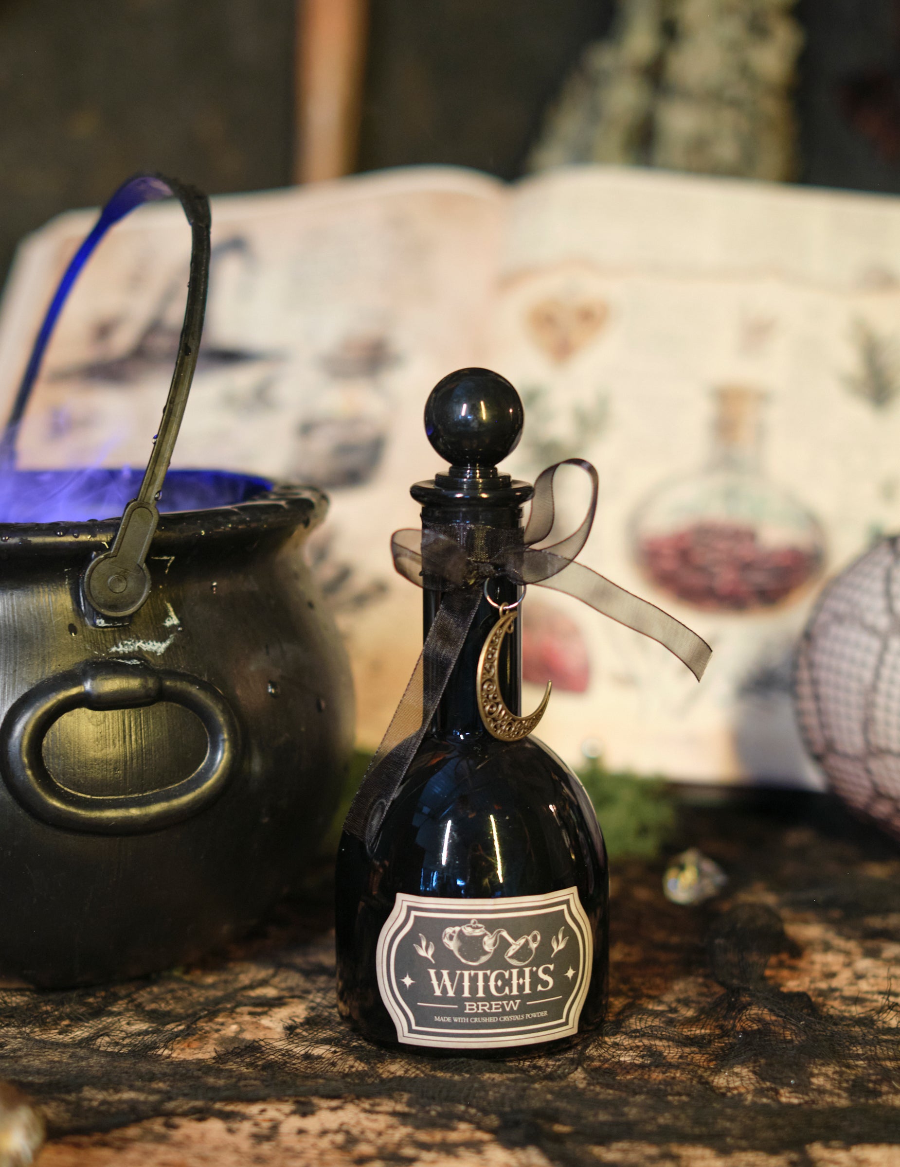 Tato lahvička s čarodějnicí černou magií měří 19,5 cm Vysoká. Vyrobena z čirého skla tónovaného do tmavě černé barvy, je opatřena štítkem ve vintage stylu s nápisem „ČARODĚJNICE“. Korková zátka zajišťuje těsné uzavření, ideální pro uchovávání lektvarů. Vršek lahvičky zdobí uvázaná černá stuha a malá ozdoba ve tvaru měsíce. Ať už ji použijete jako ústřední dekoraci na halloweenský stůl nebo jako doplněk ke kostýmu, tato lahvička dokonale ztělesňuje tajemnou podstatu čarodějnictví. Vneste do své halloweenské výzdoby nádech temného kouzla s touto lahvičkou temné magie.