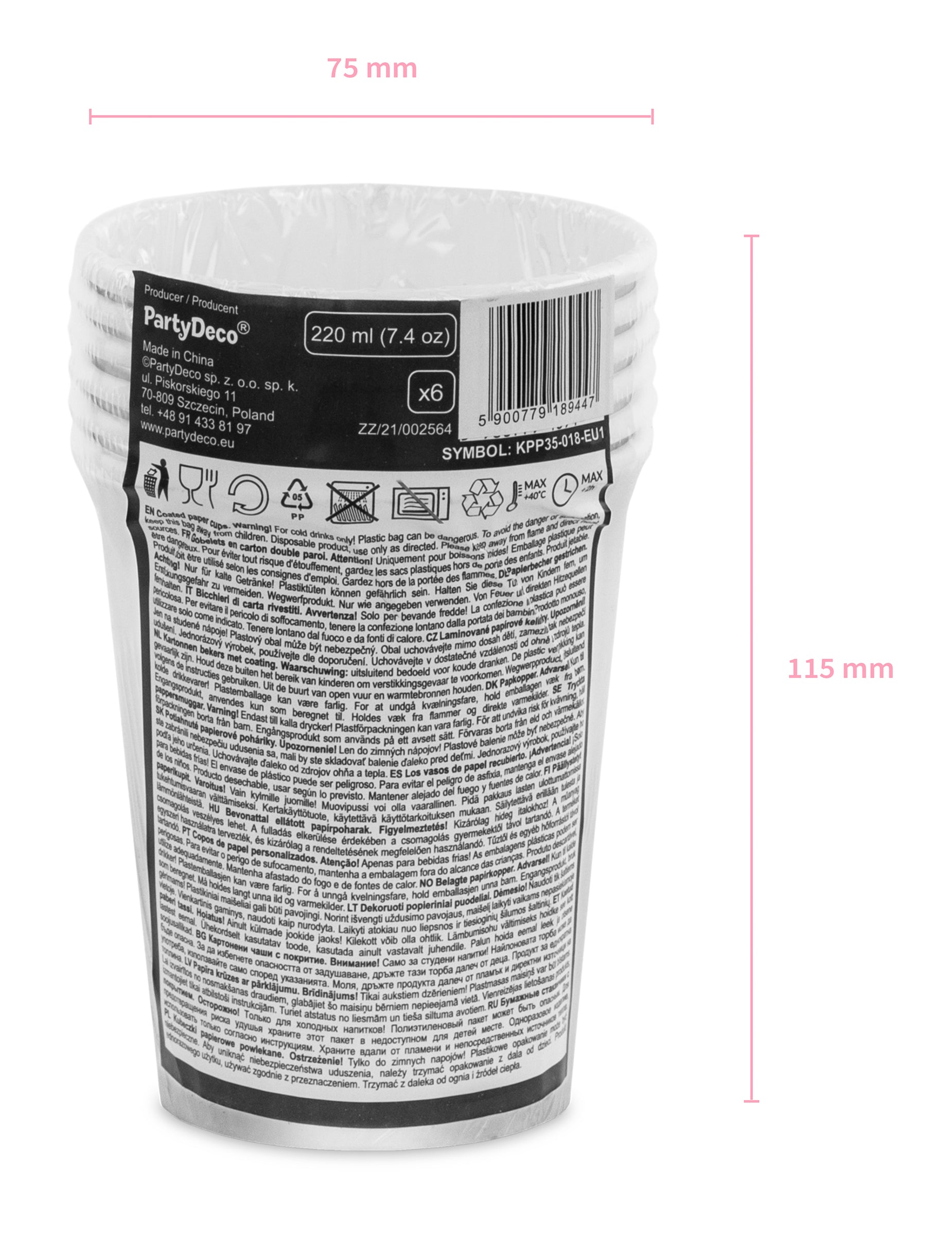 Toto balení obsahuje 6 papírových kelímků metalické stříbrné barvy. Každý kelímek pojme až 220 ml nápoje. Měří přibližně 9 cm vysoká a 7 cm v průměru. Tyto šálky jsou ideální pro stylový a moderní dotek na vašich akcích a jsou ideální pro servírování teplých i studených nápojů na večírcích, narozeninách nebo tematických večerech. Rozzáří vaše recepce s těmito elegantními a rafinovanými stříbrnými šálky!