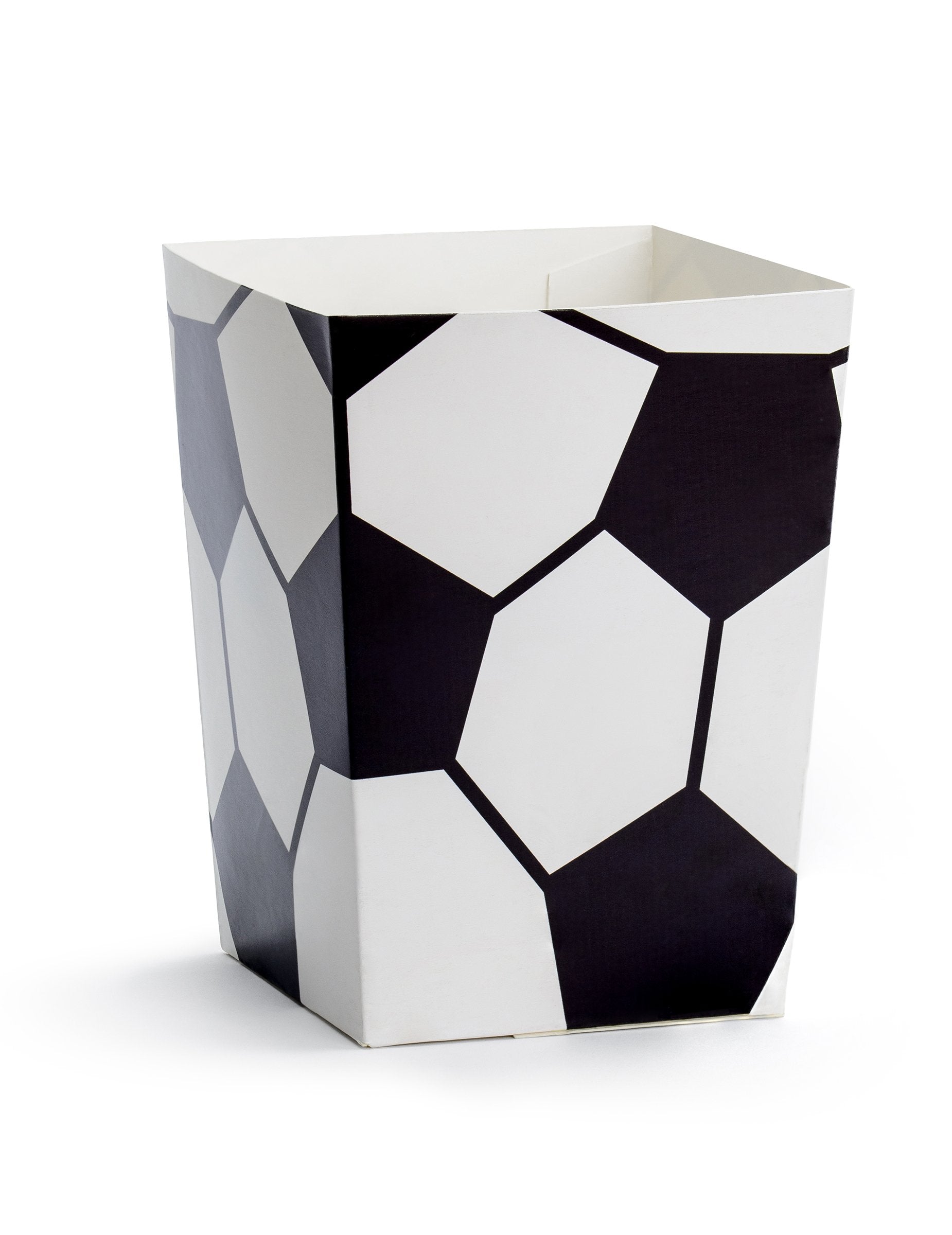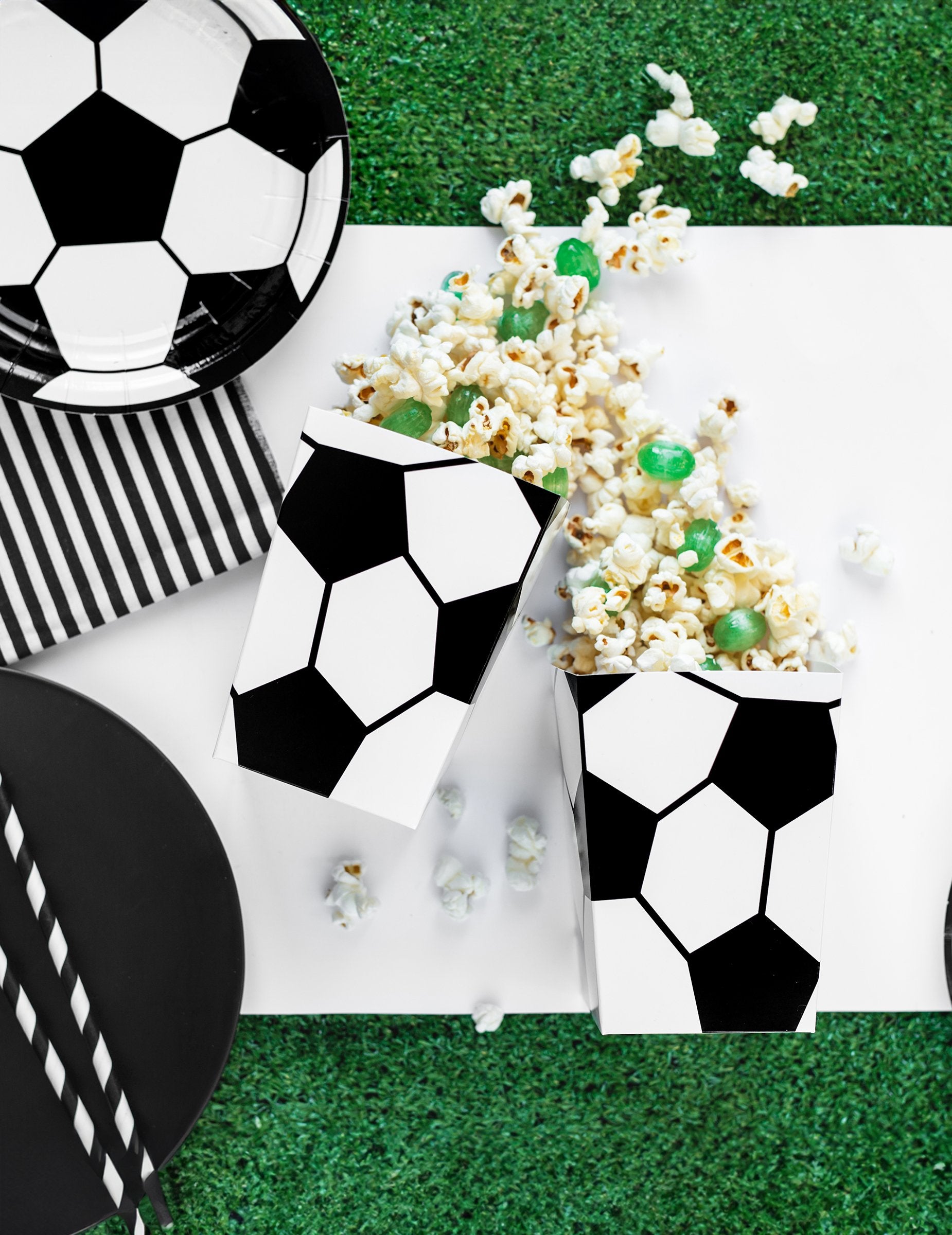 Tato dávka obsahuje 6 popcornových krabic na téma fotbalu. Každá krabice měří přibližně 7 x 7 x 12,5 cm a je zdobena černobílým fotbalovým balónem. Tyto kartonové krabice, ideální pro zápas nebo sportovní tematické festivaly, přidají do vašeho občerstvení zábavný a praktický nádech. Body skóre s těmito originálními a stylovými krabicemi popcorn!
