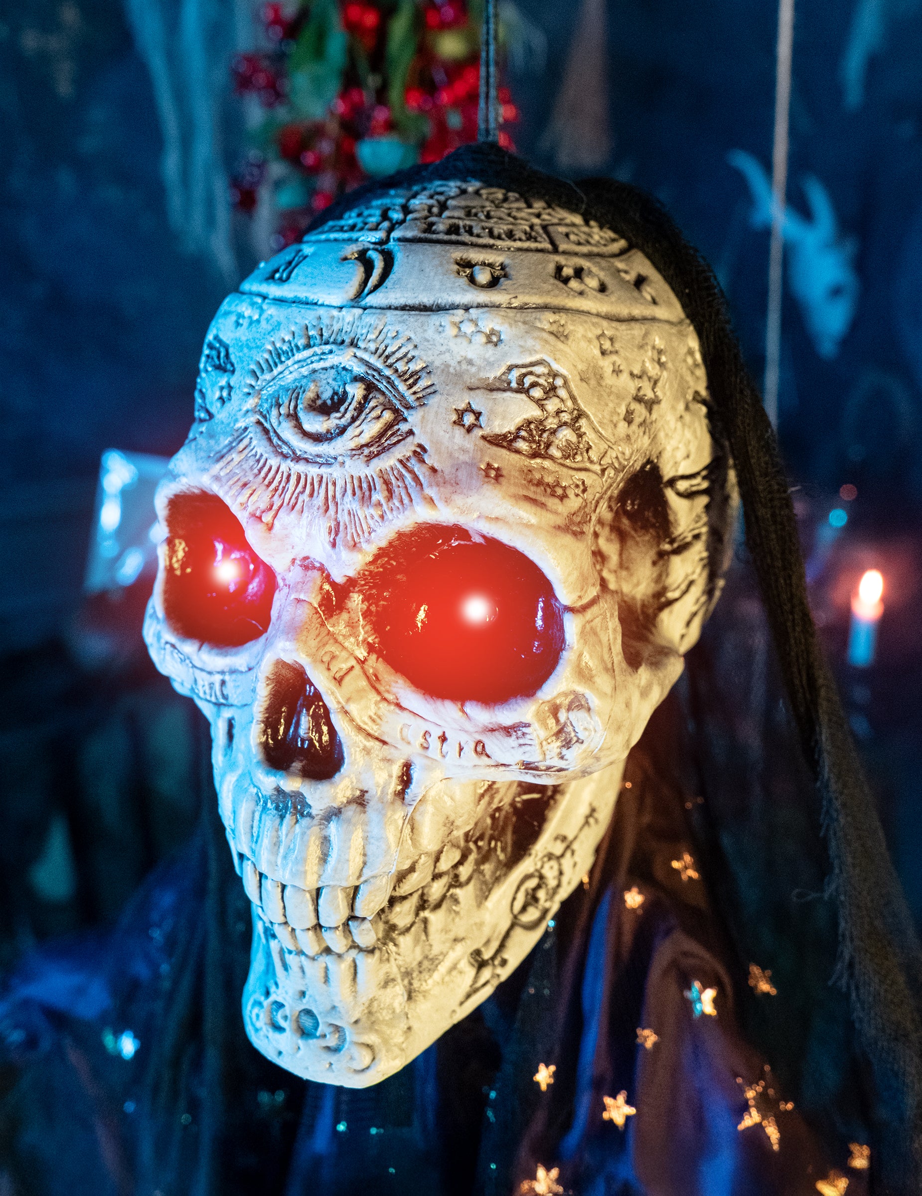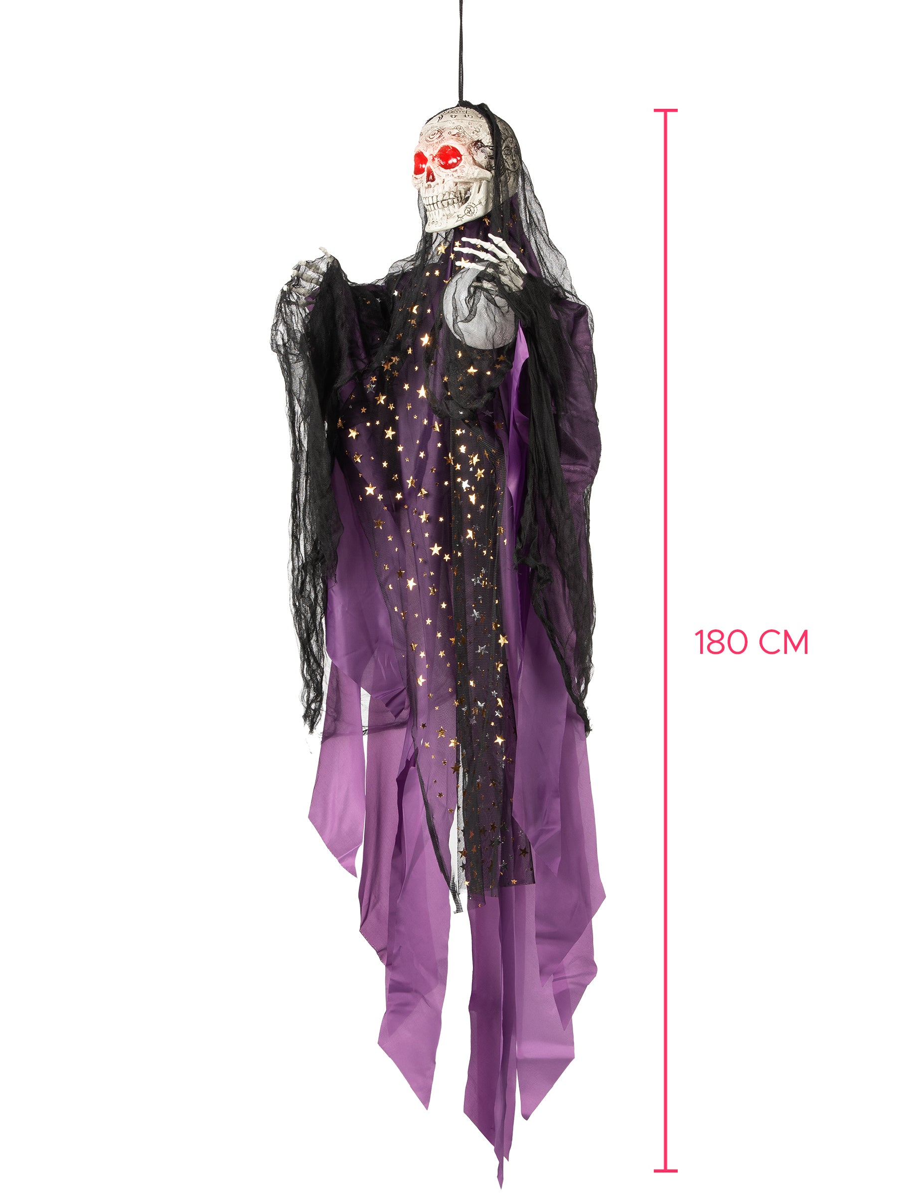 Tato kostra jasného a zvukového jasnovidla je vysoká 180 cm. Tato závěsná dekorace představuje kostru jasnovideckého, přehozeného černým a fialovým závojem zdobeným hvězdnými vzory. Jeho lebka je vyryta záhadnými symboly a vyvolává kouzla schopná zamrznout vaši krev. Chcete -li zapálit kostru, stačí přepněte spínač a ožije na oživení nejmenšího hluku. Clairvoyant se ušklíbne, její oči se rozsvítí červeně a bliká, zatímco její křišťálová koule bude svítit, aby odhalila vaši budoucnost. Funguje s 3 bateriemi AAA (baterie nejsou zahrnuty). Tato dekorace bude ideální pro terorizaci kolemjdoucích -během Halloweenského večera.