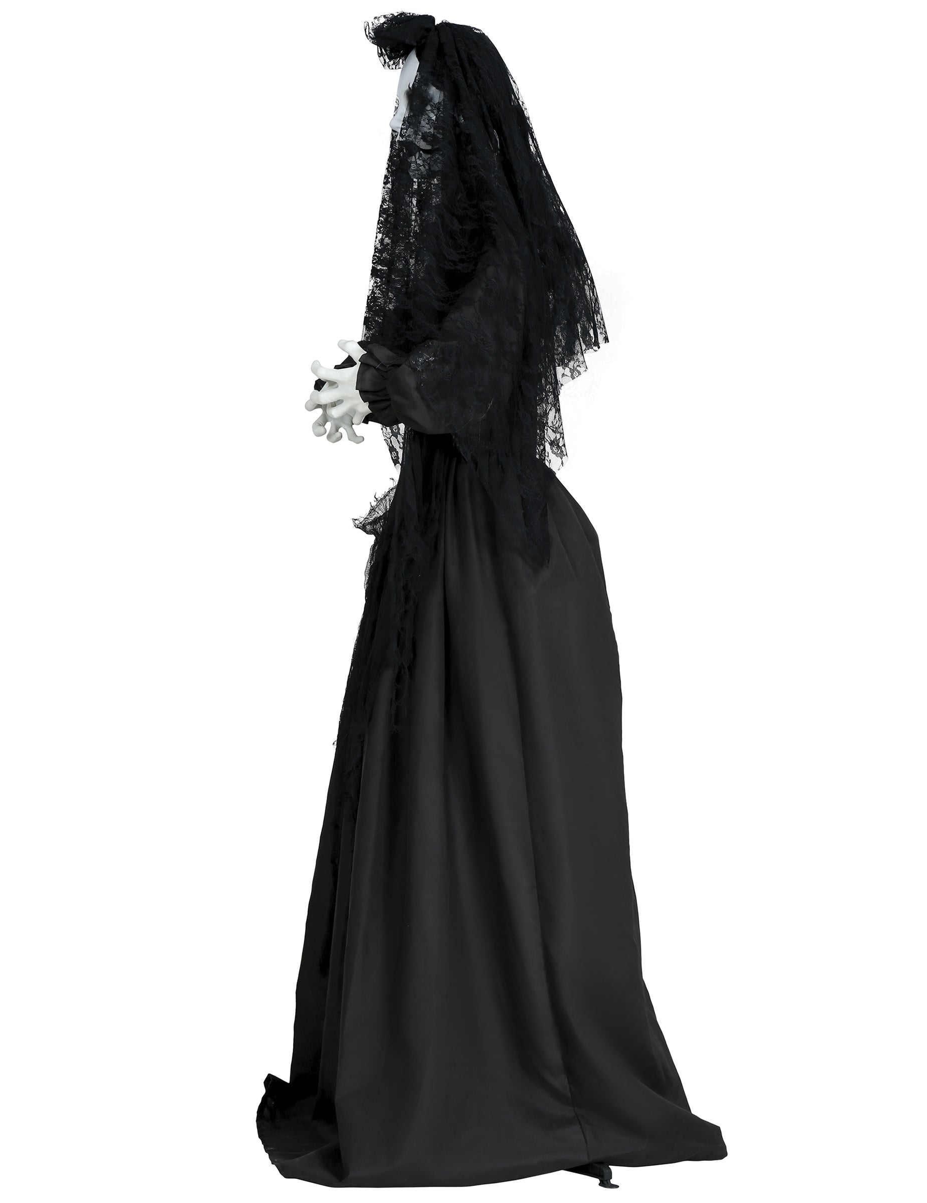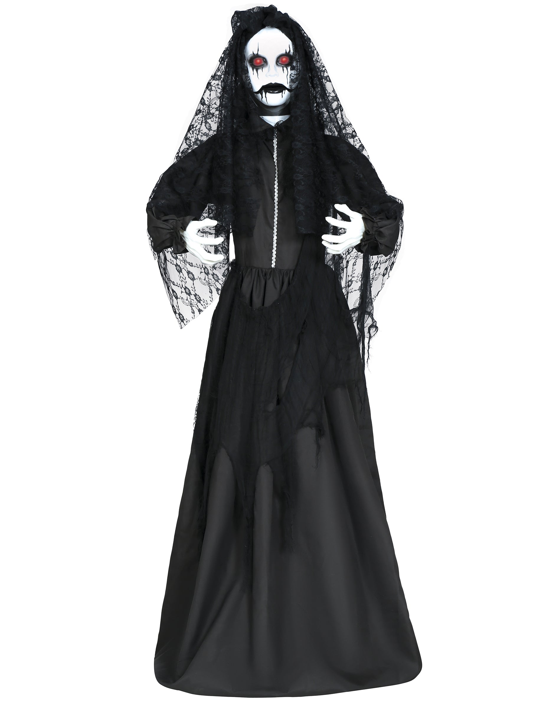 Tato animovaná, světelná a zvukem aktivovaná dekorace ve tvaru děsivé panenky měří 170... cm přibližně vysoká. Tato zlověstná panenka je ideální pro vytvoření strašidelné atmosféry na vašich halloweenských večírcích nebo jiných tematických akcích a jistě vašim hostům nahání mráz po zádech. Oblečená v dlouhých černých šatech s černým krajkovým závojem je vybavena světelnými efekty v červených očích a zvukovou funkcí pro umocnění makabrózní atmosféry. Díky svým automatickým pohybům jako by ožila pro ještě úžasnější zážitek. Tato dekorace je napájena 3 bateriemi AAA, které jsou součástí balení, takže se snadno sestavuje a používá. Tato animovaná panenka, ideální pro doplnění vaší halloweenské výzdoby, bude vaším vrcholem a zaručí atmosféru stejně strašidelnou jako nezapomenutelnou!