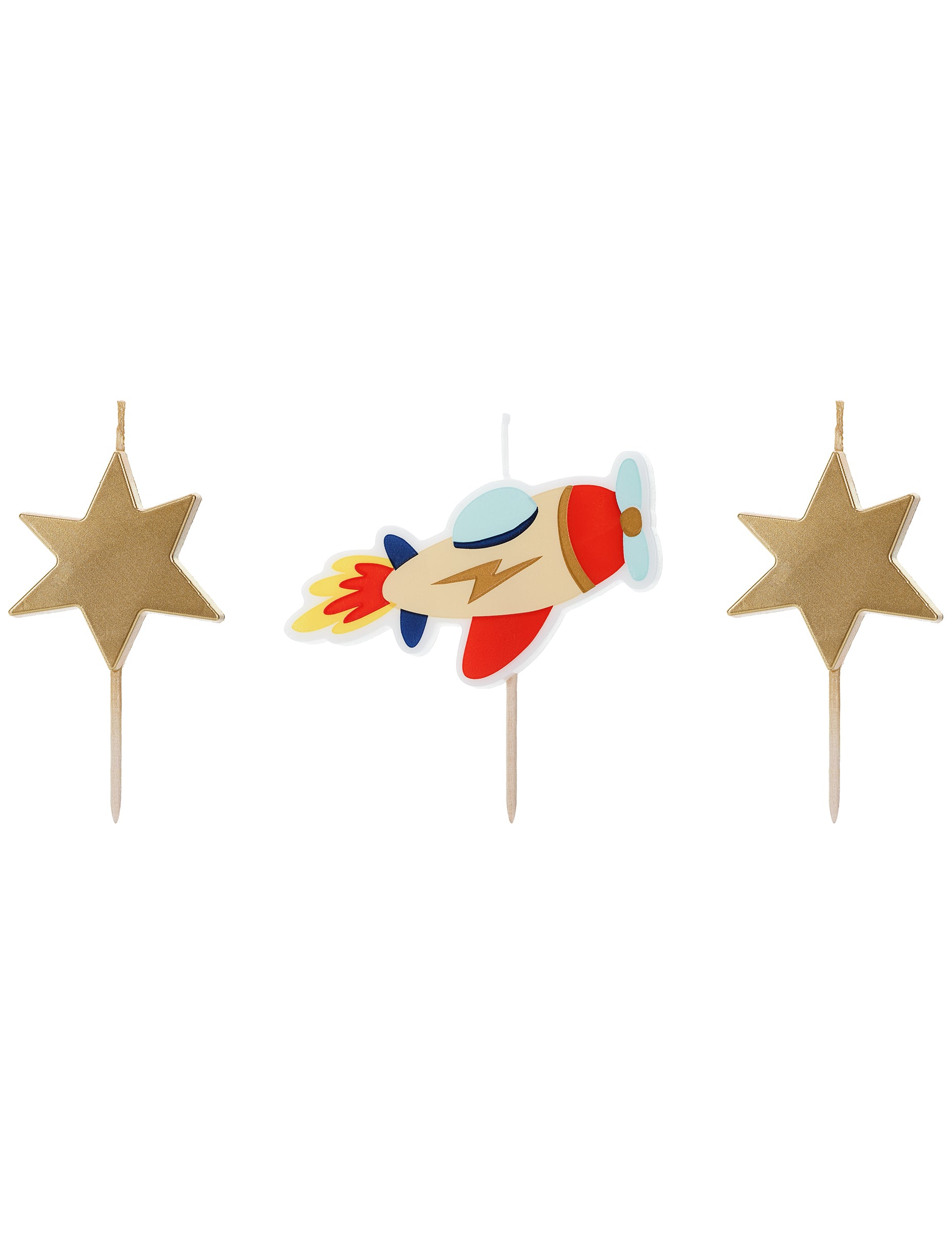 Vylepšete svůj dezert touto sadou 3 svíčky dekorativní. Ideální pro a narozeninový dort, toto balení obsahuje a malé letadlo s odstíny červená, modrá a zlatá, stejně jako dva skvělé zlaté hvězdy. Tyto svíčky motivy přinesou vaší oslavě slavnostní a barevnou notu.