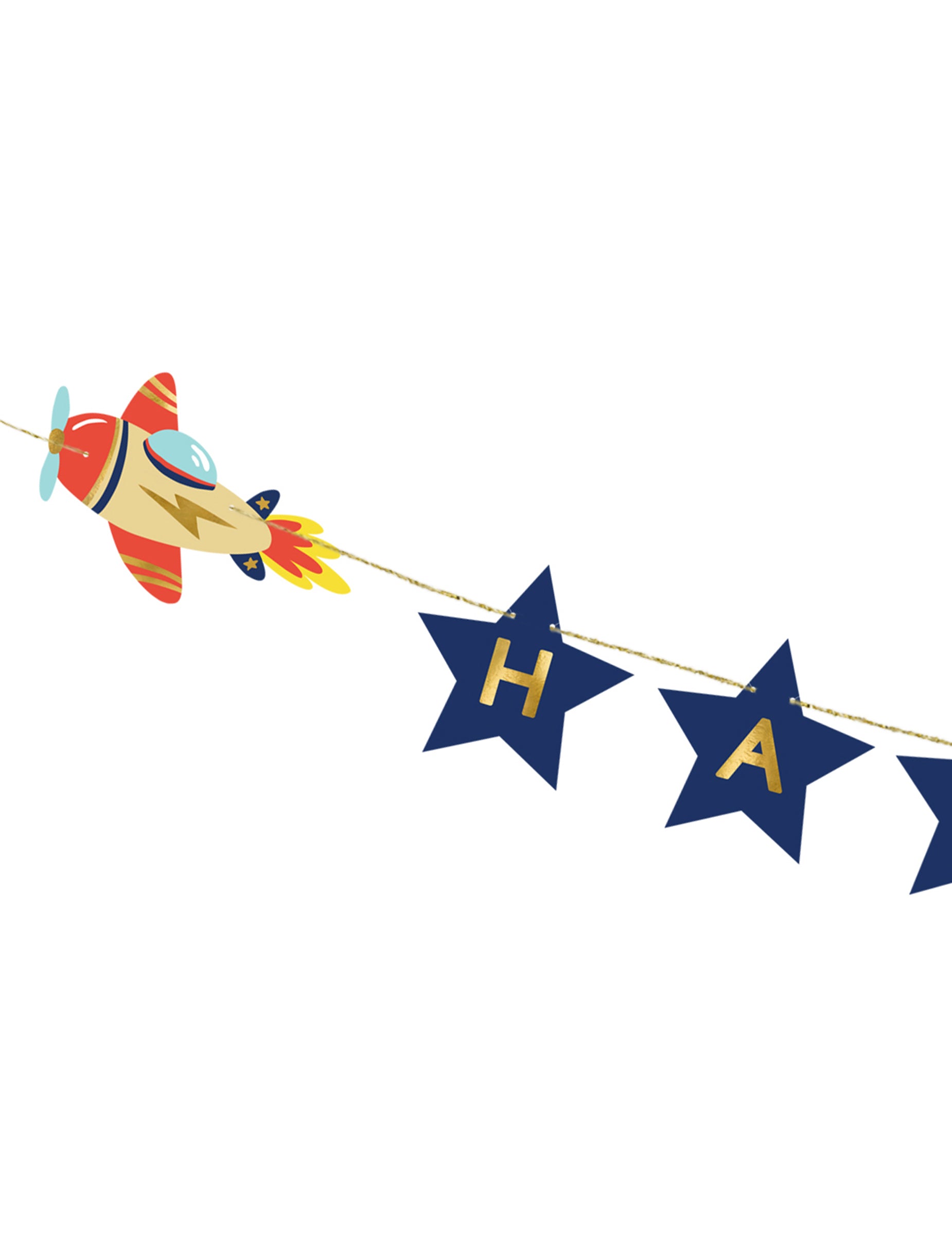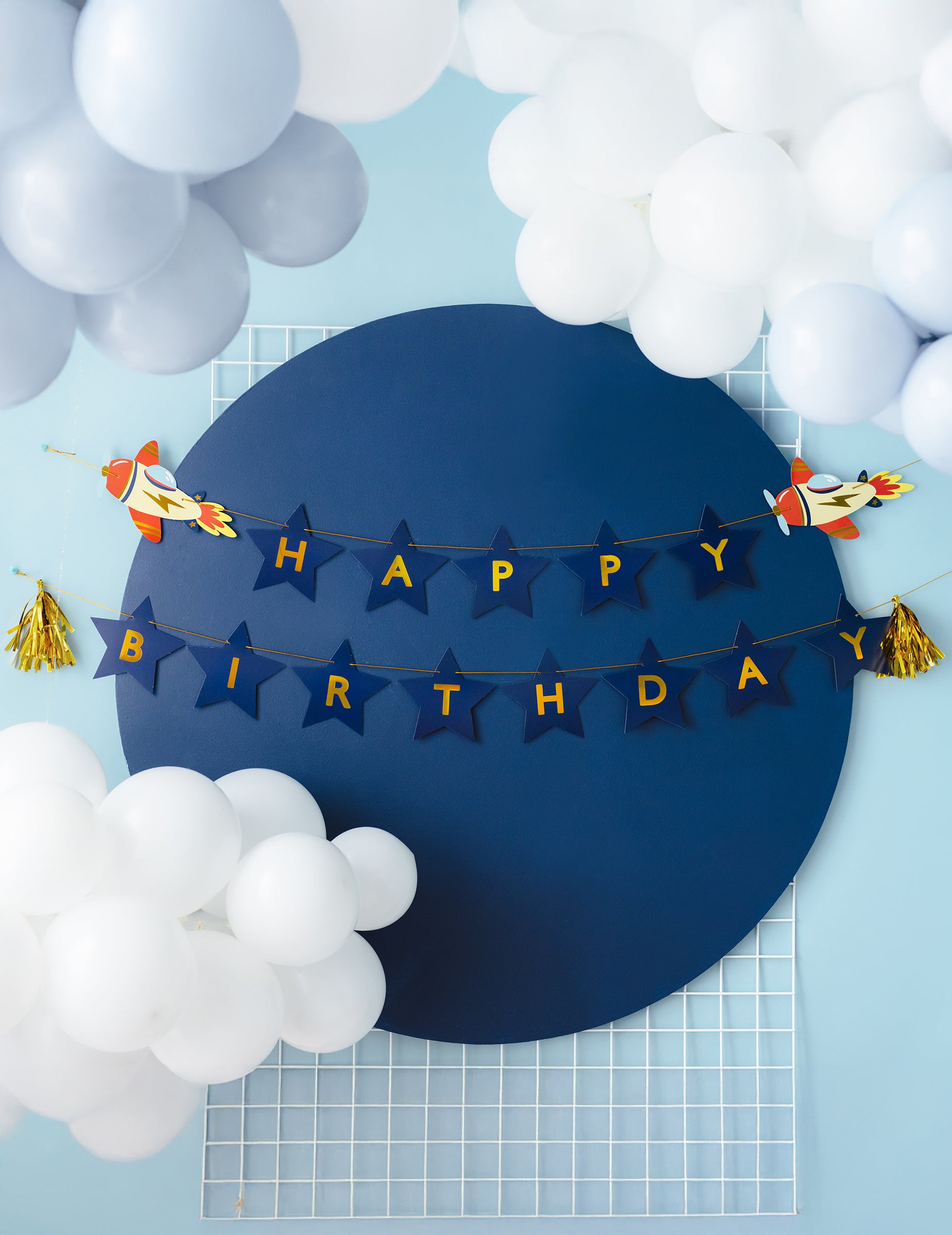 Vneste na svůj večírek vzdušný nádech narozeninová girlanda 2,5 m. Navrženo v tmavě modrá, zobrazí zprávu všechno nejlepší k narozeninám v tónu zlatá šumivé. Celek je zdoben dvěma malými letadly a střapci zlatá pro slavnostní vzhled. Toto věnec je základním prvkem vašeho dekorace pokoje oslavit a narozeniny dítěte na téma letadla.