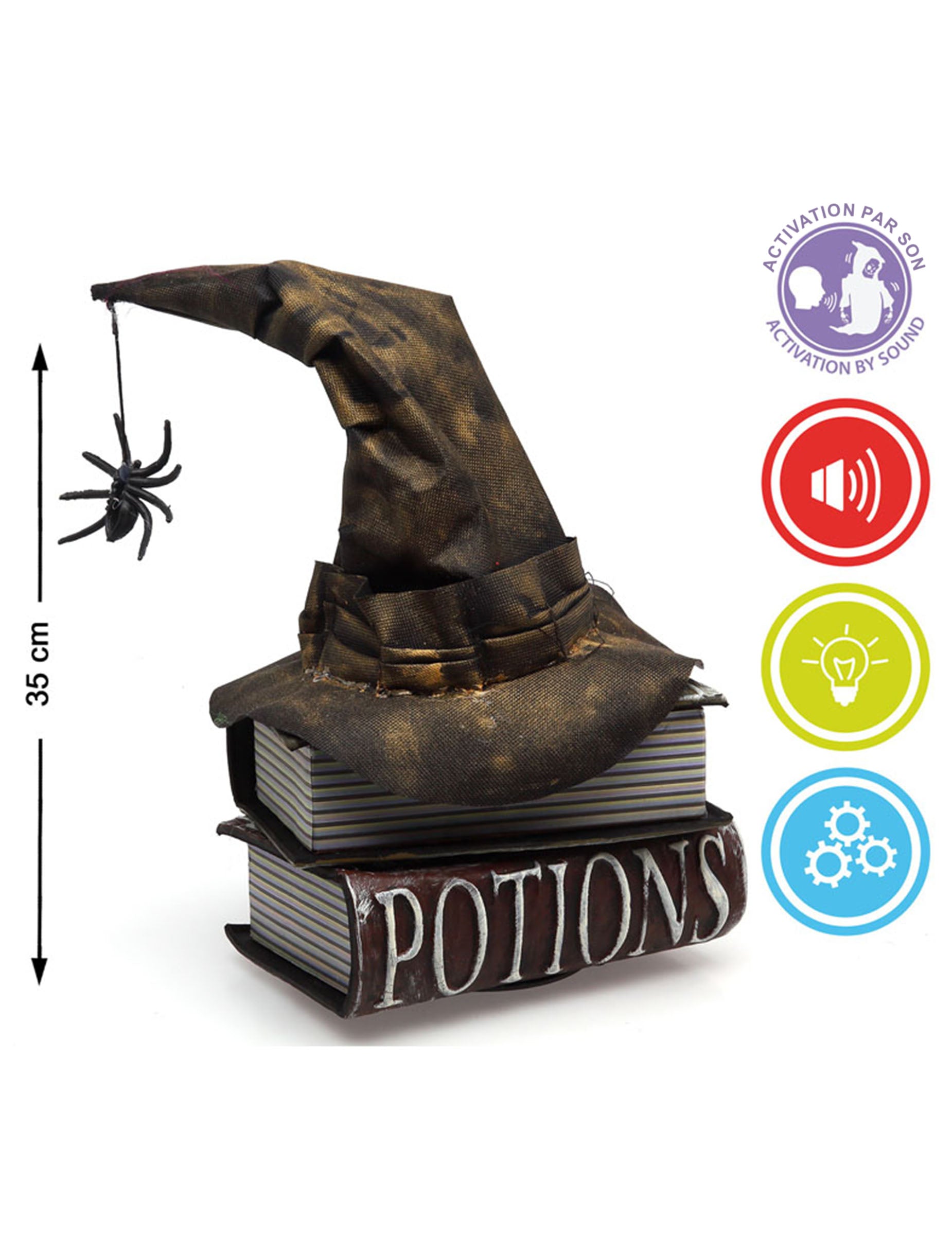 Créez une ambiance ensorcelante avec cette décoration animée de livres hantés de sorcières. D’une taille de 35 x 17 x 15 cm, cette pièce fascinante est parfaite pour surprendre vos invités grâce à ses effets sonores et lumineux qui donnent vie à l’ensemble. Les grimoires mystérieux, surmontés d’un chapeau de sorcière vieilli qui effectue des mouvements accompagnés de bruitages de cris de sorcières, et d’une araignée suspendue, ajoutent une touche mystique à votre table ou buffet. Un effet lumineux vert donne à l'ensemble un éclat envoûtant, amplifiant l'atmosphère magique et inquiétante. Ce produit fonctionne avec 3 piles LR03-AAA . Les détails réalistes et les animations immersives font de cet accessoire un élément phare de votre décoration d’Halloween. Idéal pour une fête terrifiante ou une soirée à thème, ce décor animera votre événement avec style et magie !