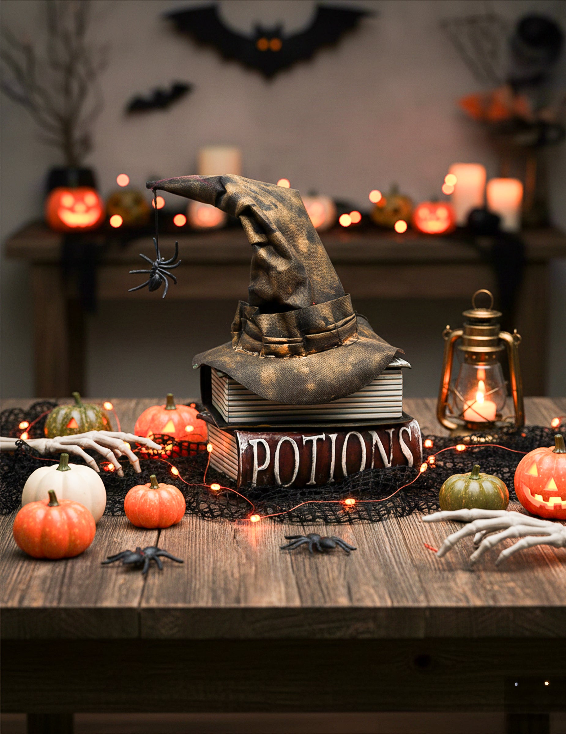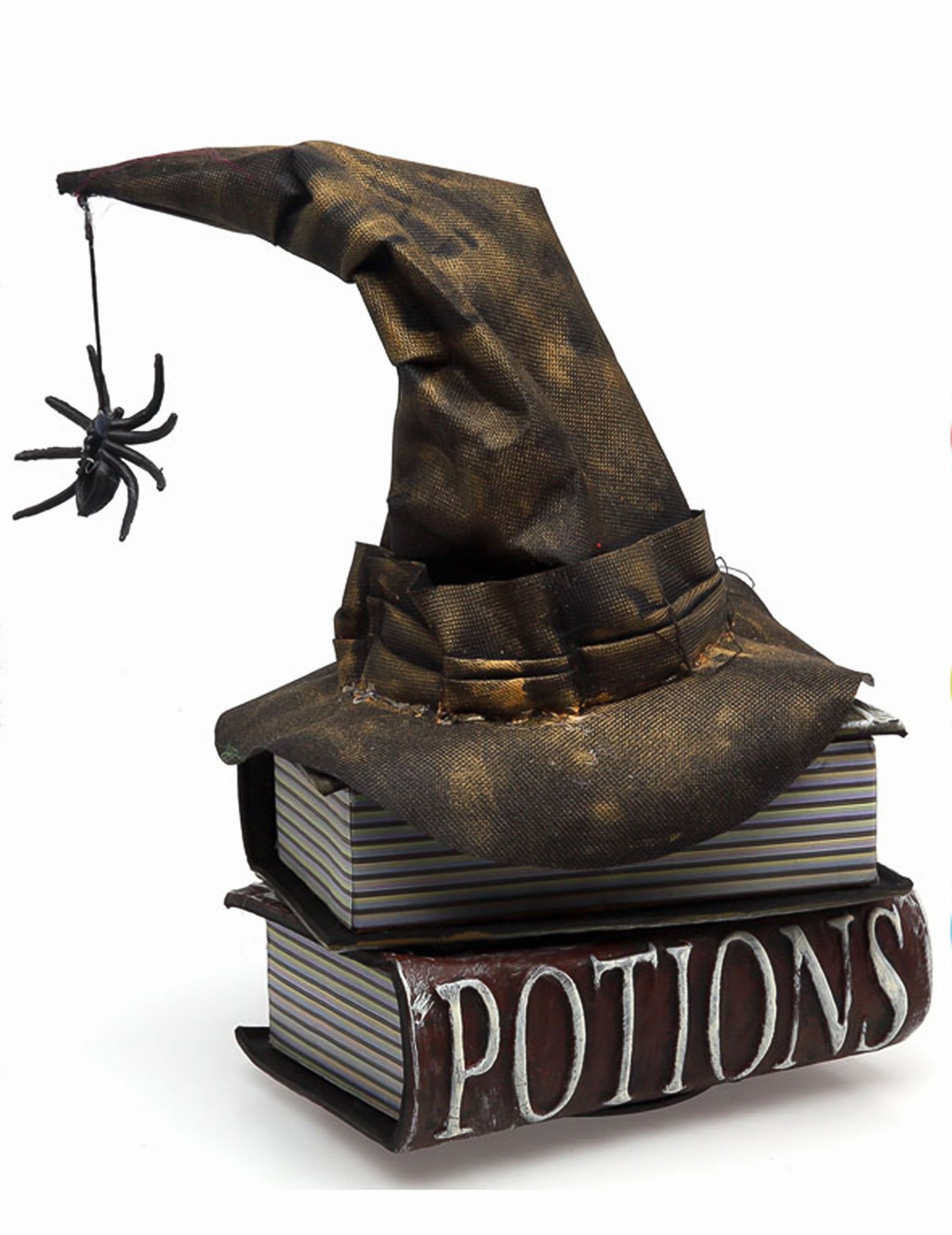 Vytvořte okouzlující atmosféru s touto animovanou dekorací s motivem strašidelných knih o čarodějnicích. Rozměry 35 x 17 x 15 cm. cm, Tento fascinující kousek je ideální pro překvapení vašich hostů svými zvukovými a světelnými efekty, které celý kousek oživí. Tajemné grimoáry, zakončené starým čarodějnickým kloboukem, který provádí pohyby doprovázené křikem čarodějnic, a visícím pavoukem dodají vašemu stolu nebo bufetu mystický nádech. Zelený světelný efekt dodá celému kousku okouzlující záři, která umocní magickou a znepokojivou atmosféru. Tento produkt funguje na 3 baterie LR03-AAA. Realistické detaily a pohlcující animace dělají z tohoto doplňku klíčový prvek vaší halloweenské dekorace. Tato dekorace je ideální pro děsivou párty nebo tematický večer a oživí vaši akci stylem a magií!