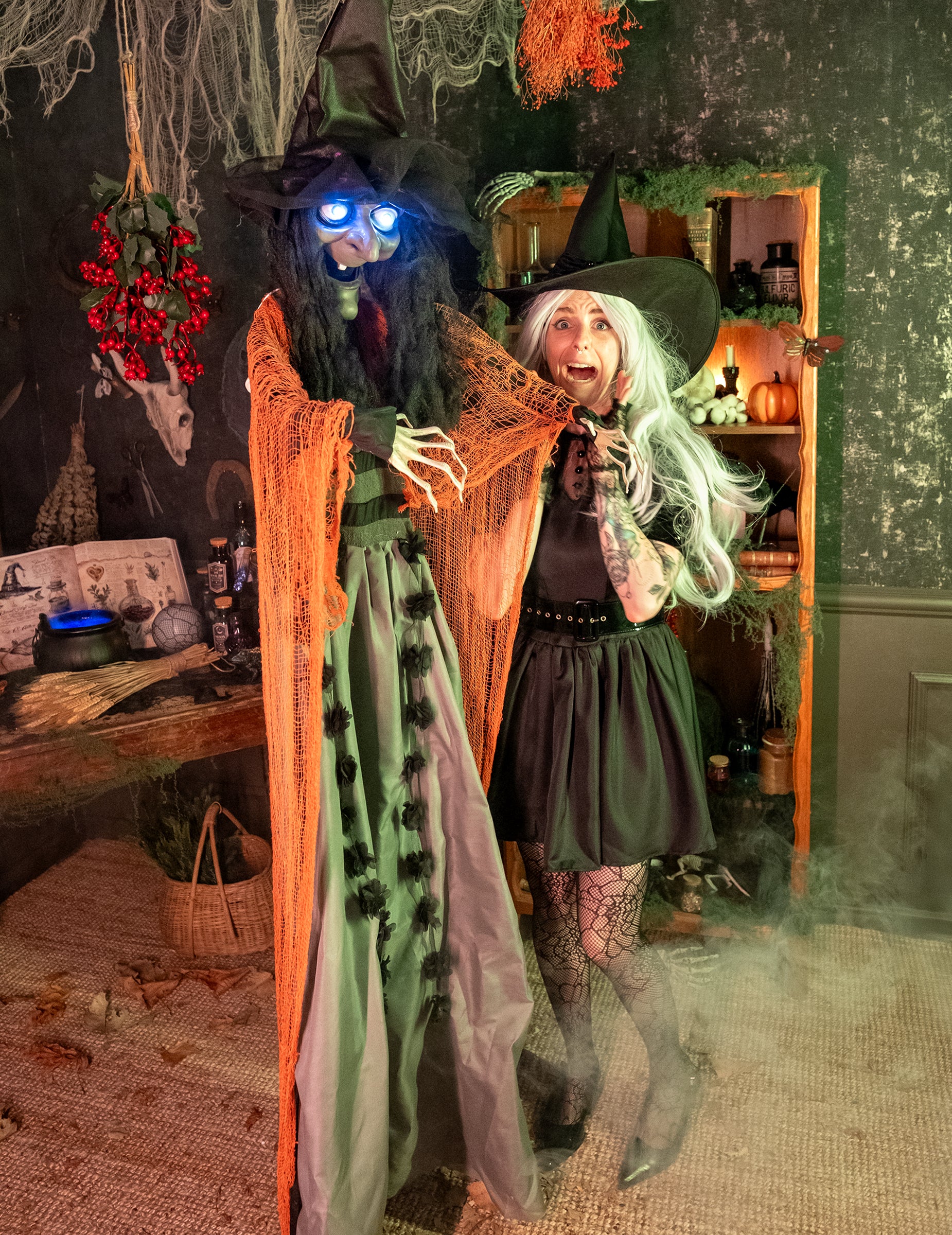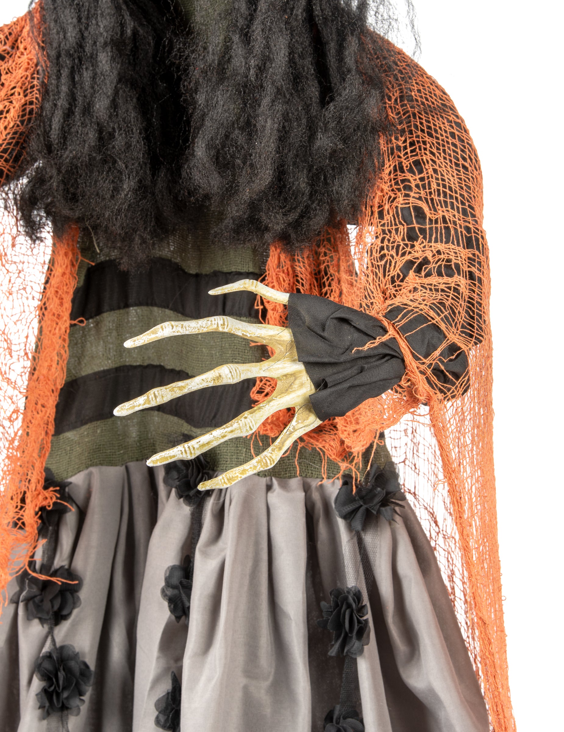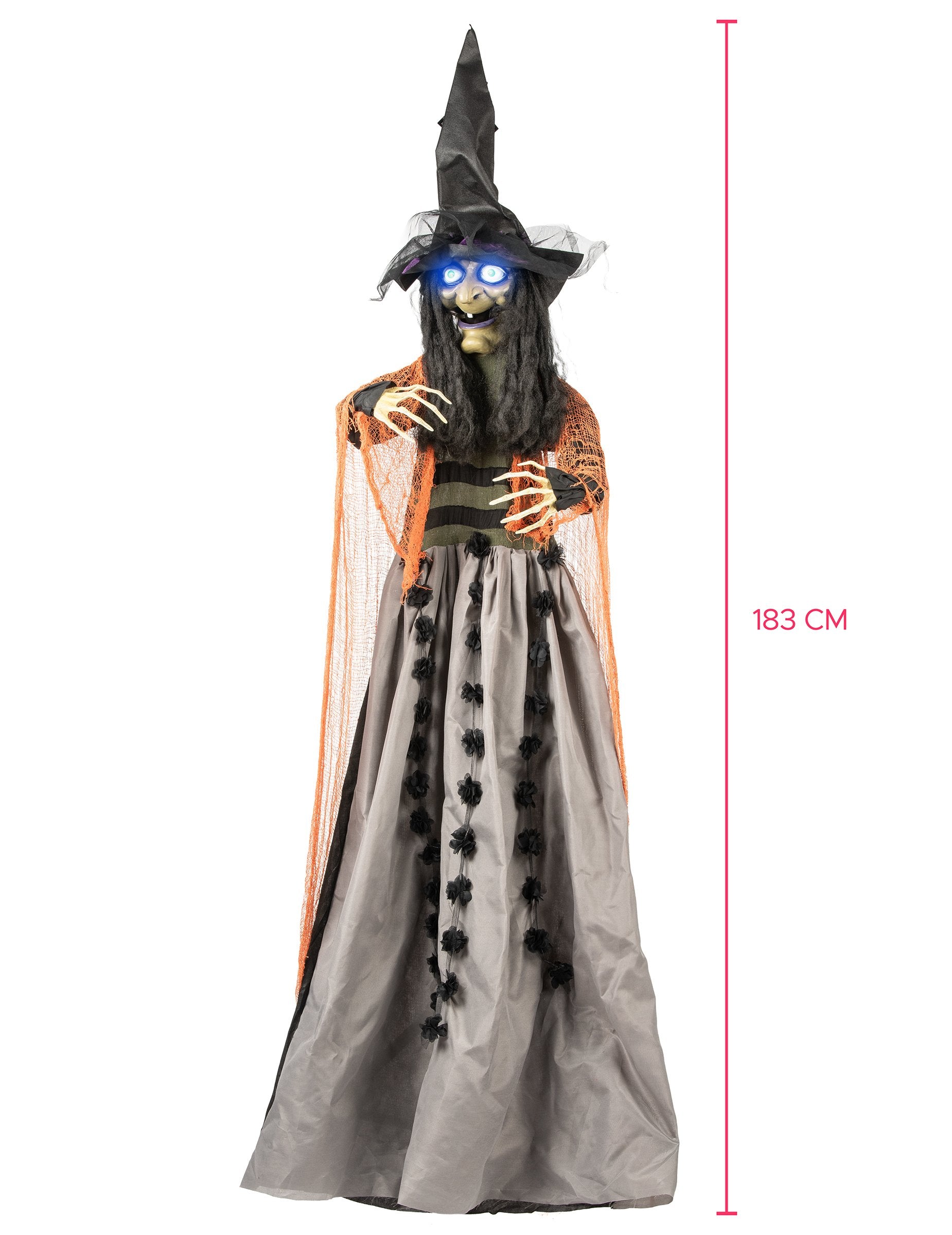 Tato 1,8 metru vysoká animovaná zvukově-světelná dekorace zobrazuje strašidelnou visící čarodějnici, ideální pro Halloween nebo hororovou párty. Díky svítícímu obličeji a zářícím očima vytváří zlověstnou atmosféru. Animované pohyby a děsivé zvukové efekty tuto čarodějnici oživují a dodávají vaší výzdobě interaktivní a strašidelný nádech. Její černý oděv, skládající se ze špičatého klobouku, zlověstných šatů a roztrhaného závoje, umocňuje její hrozivý vzhled. Je ideální pro překvapení vašich hostů a vylepšení halloweenské atmosféry, snadno se zavěsí a vytvoří výrazný efekt. Tato animovaná visící čarodějnice je perfektní volbou pro úspěšnou halloweenskou dekoraci. Umístěte ji ke vchodu nebo do tmavého rohu, abyste svým návštěvníkům zajistili mrazení! Vyžaduje 3 baterie AAA (nejsou součástí balení).