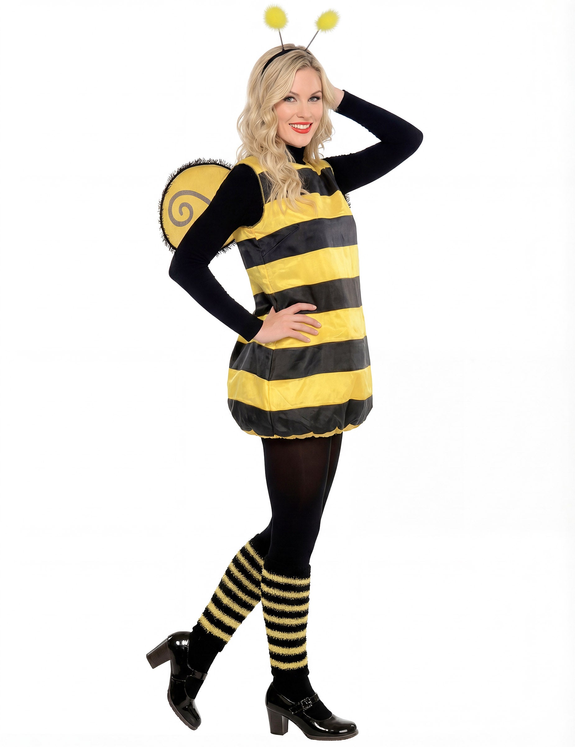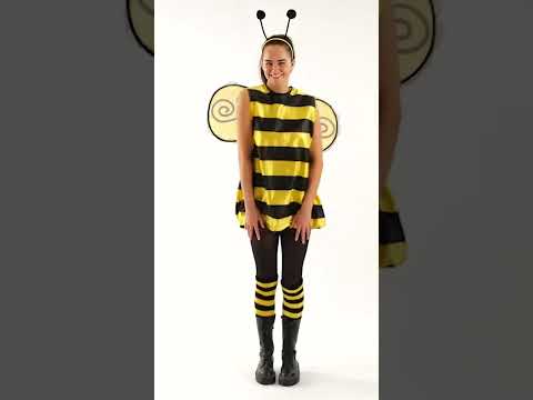 Toto včelí kostým pro ženy se skládá z černožlutých pruhovaných šatů, čelenky zdobené anténkami, odpovídajících křídel a pruhovaných návleků na nohy.
