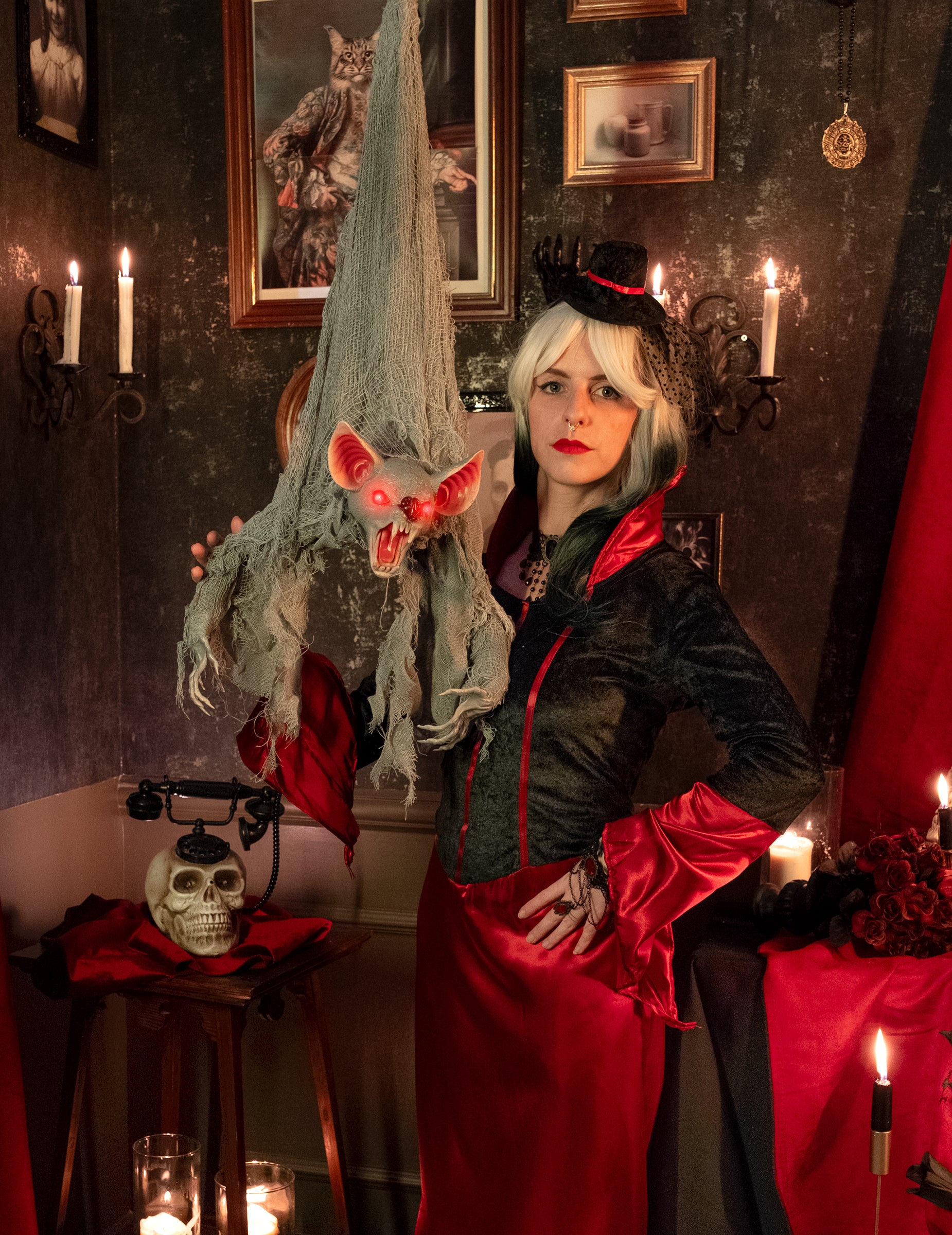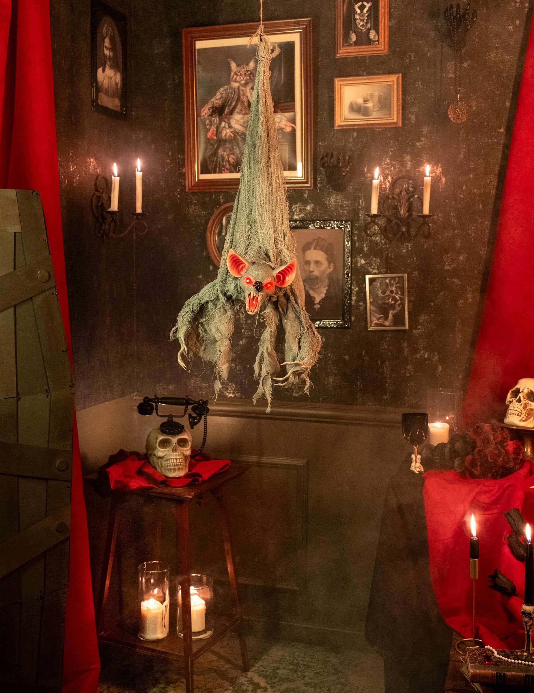 Tento animovaný netopýr o velikosti 100 cm Tato figurka přitahuje pozornost svým potrhaným tělem, odstávajícíma ušima a zářícíma rudýma očima. Zavěšená vzhůru nohama ožívá, jakmile zachytí zvuk: její hlava se začne pohybovat, ruce se třepotá a vydává se děsivý výkřik. Její opotřebovaný vzhled a trhané pohyby z ní činí ideální volbu pro vytvoření výrazného vizuálního efektu, ať už v interiéru nebo u vchodu do sálu. Vyžaduje 3 AA baterie (jsou součástí balení). Ideální pro hororové scény v závěsu.